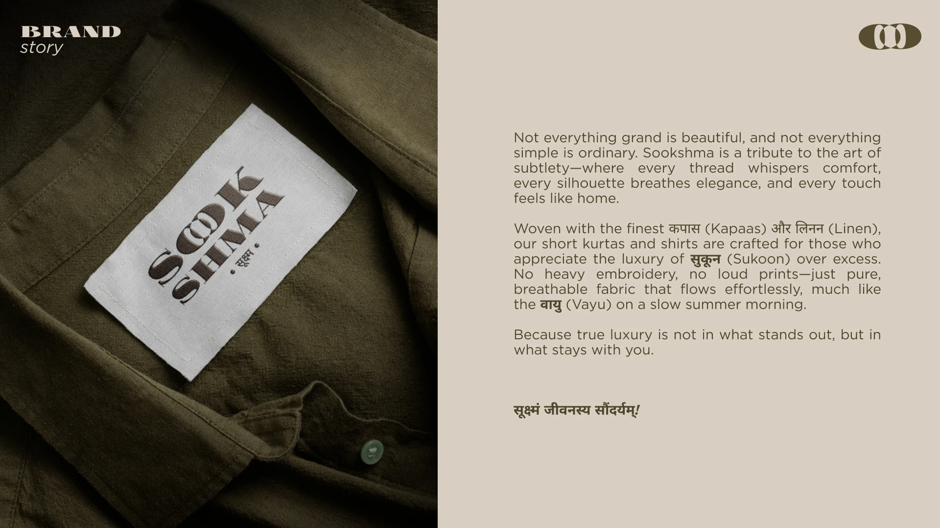 Sookshma (सूक्ष्म) is a celebration of minimalism and comfort, crafted for those who find beauty in simplicity. Inspired by the soft elegance of cotton-linen blends, this branding project reflects effortless living—where less is more, and comfort is key.
