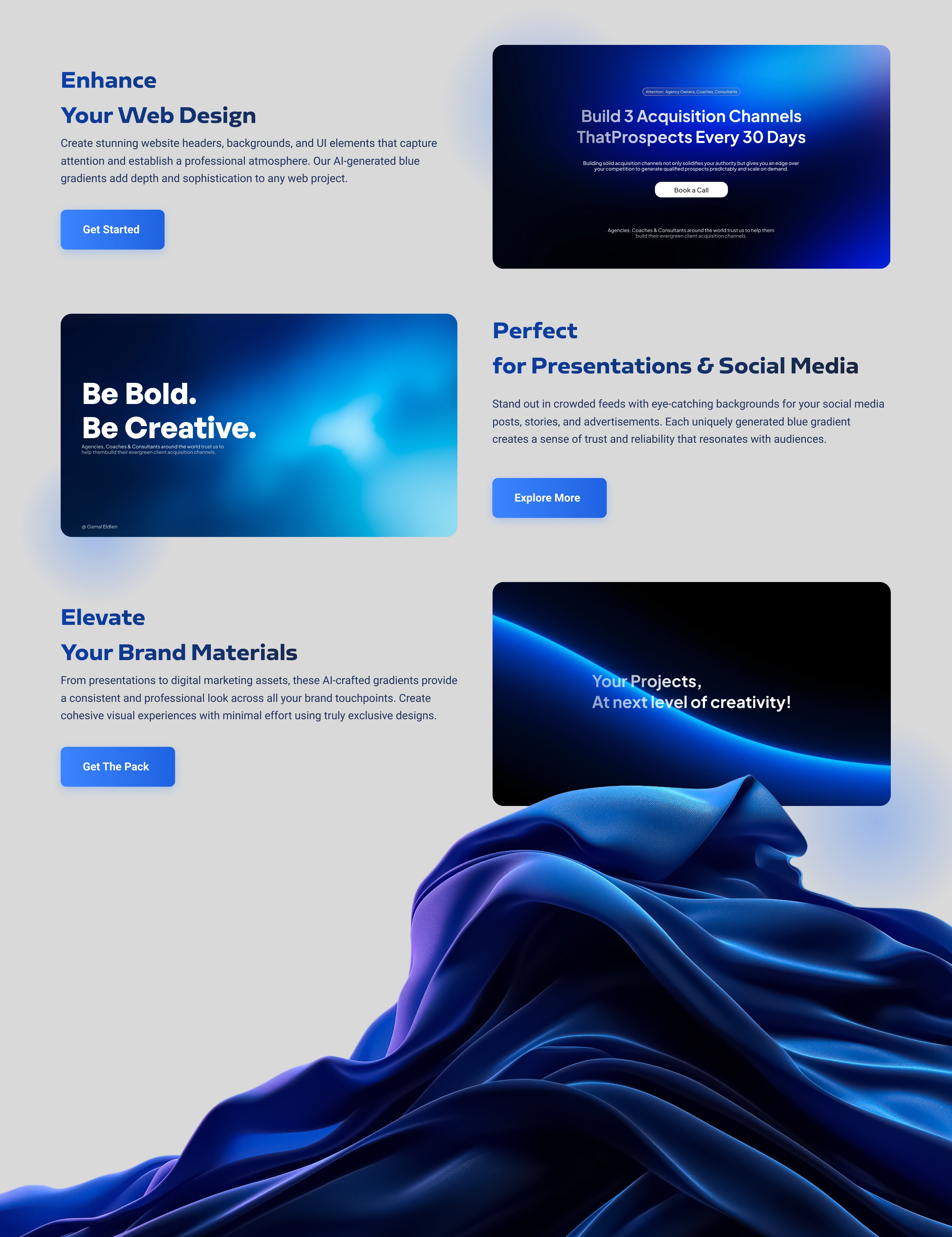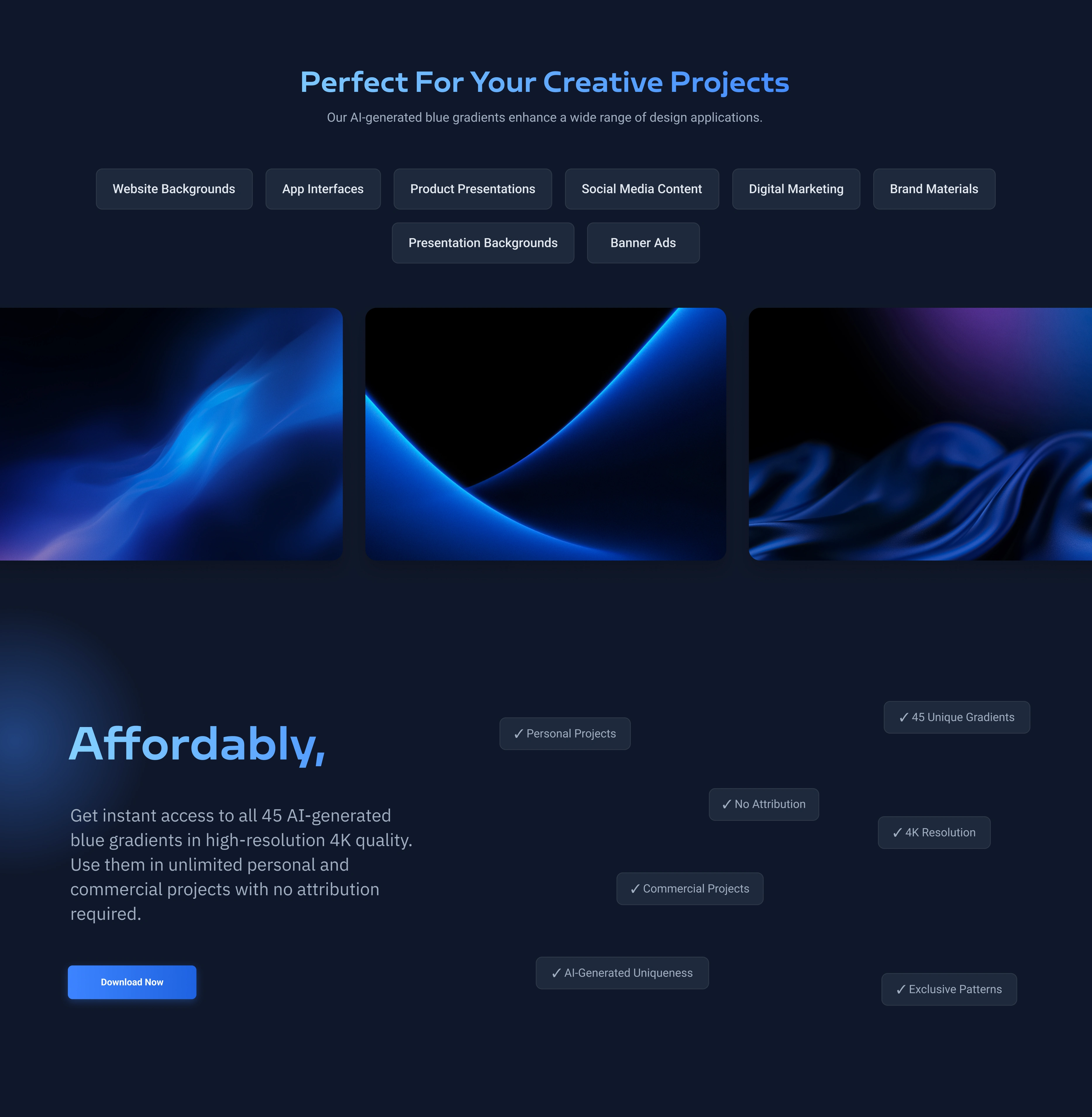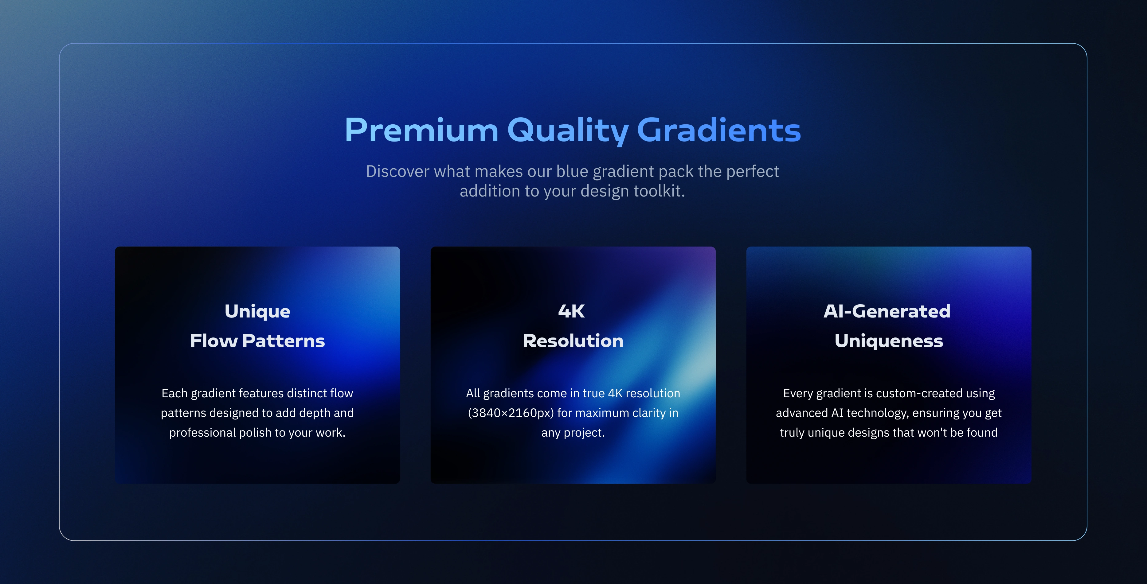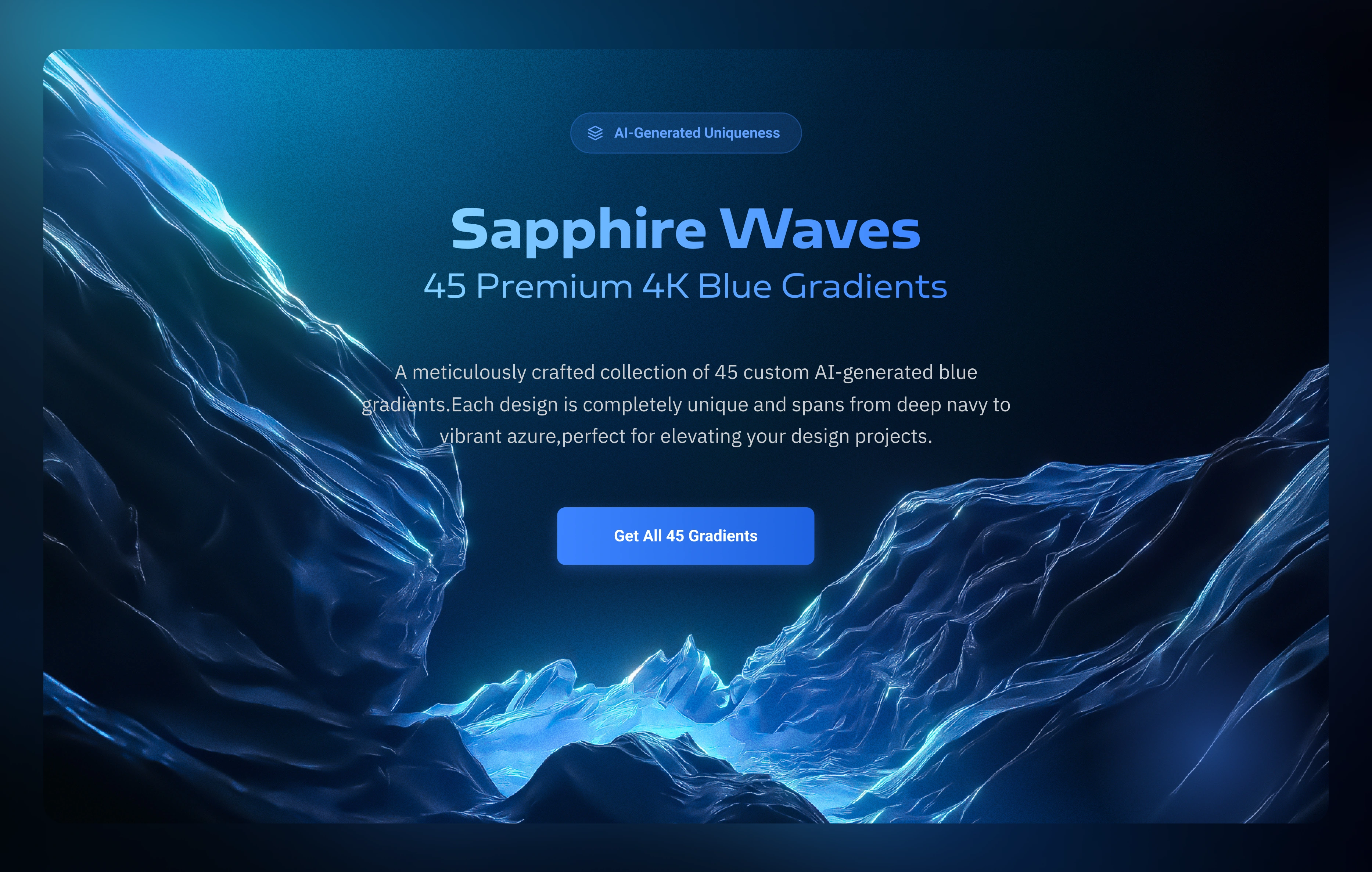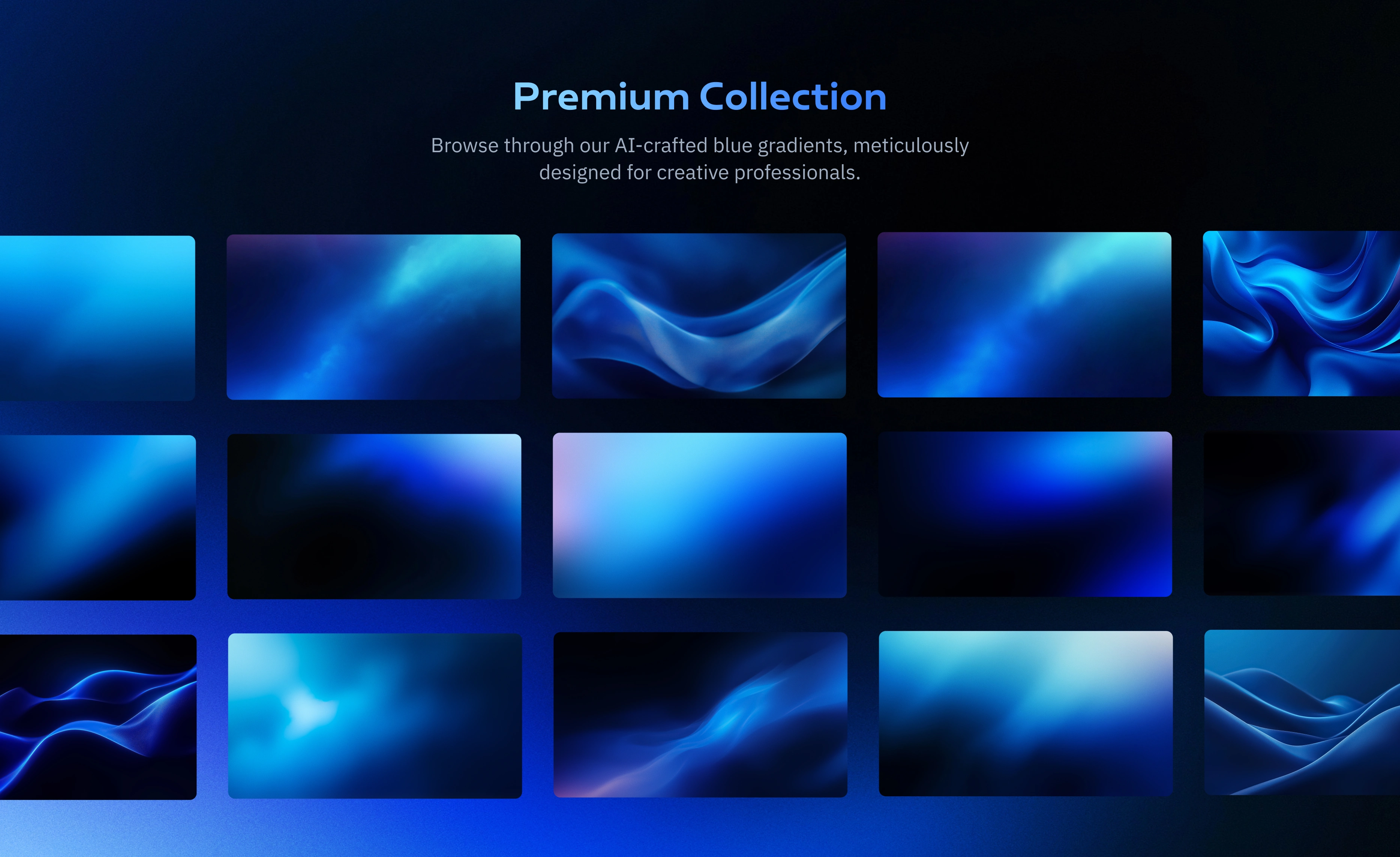 A meticulously crafted collection of 45 custom AI-generated blue gradients. Each design is completely unique and spans from deep navy to vibrant azure.