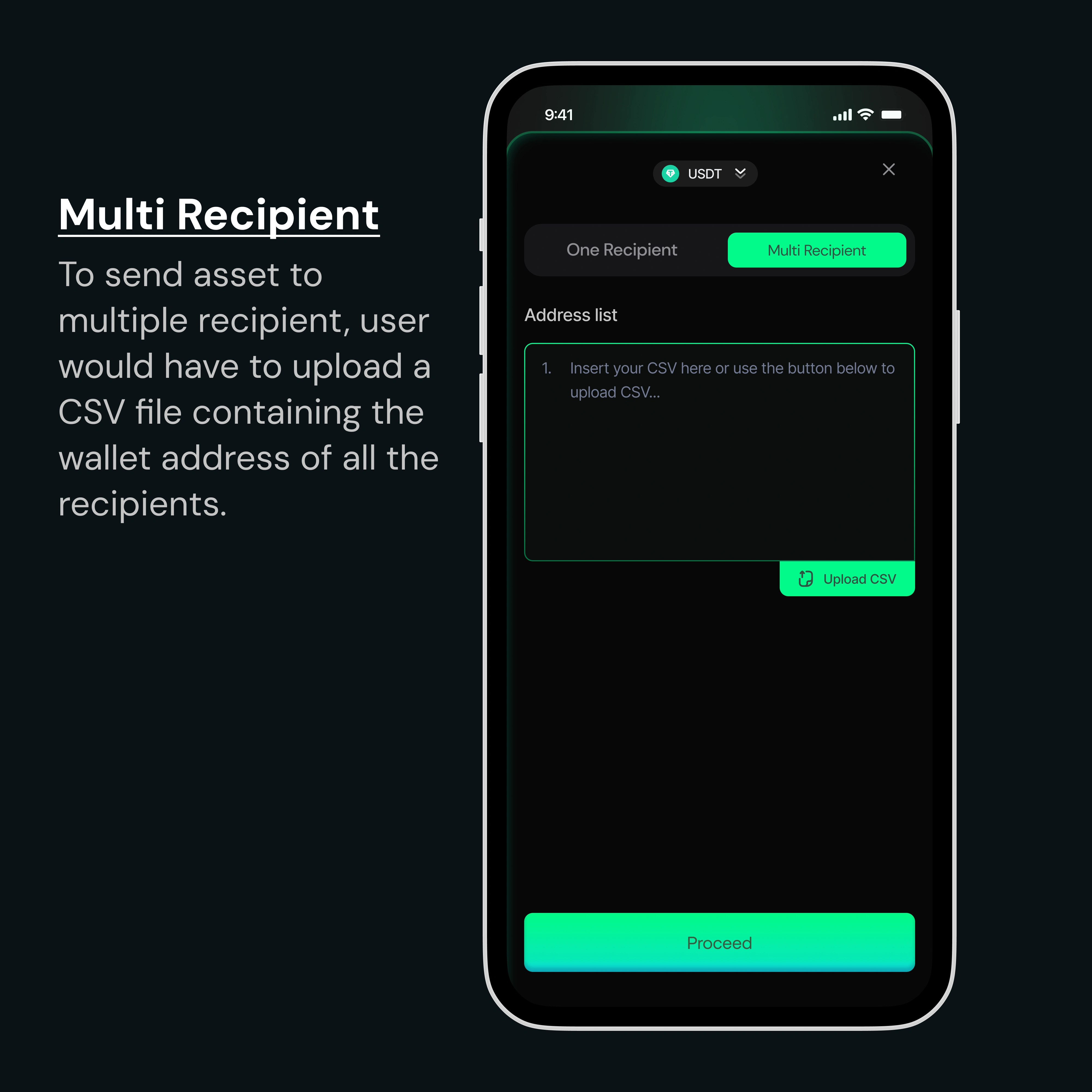 To send asset to multiple recipient, user would have to upload a CSV file containing the wallet address of all the recipients.