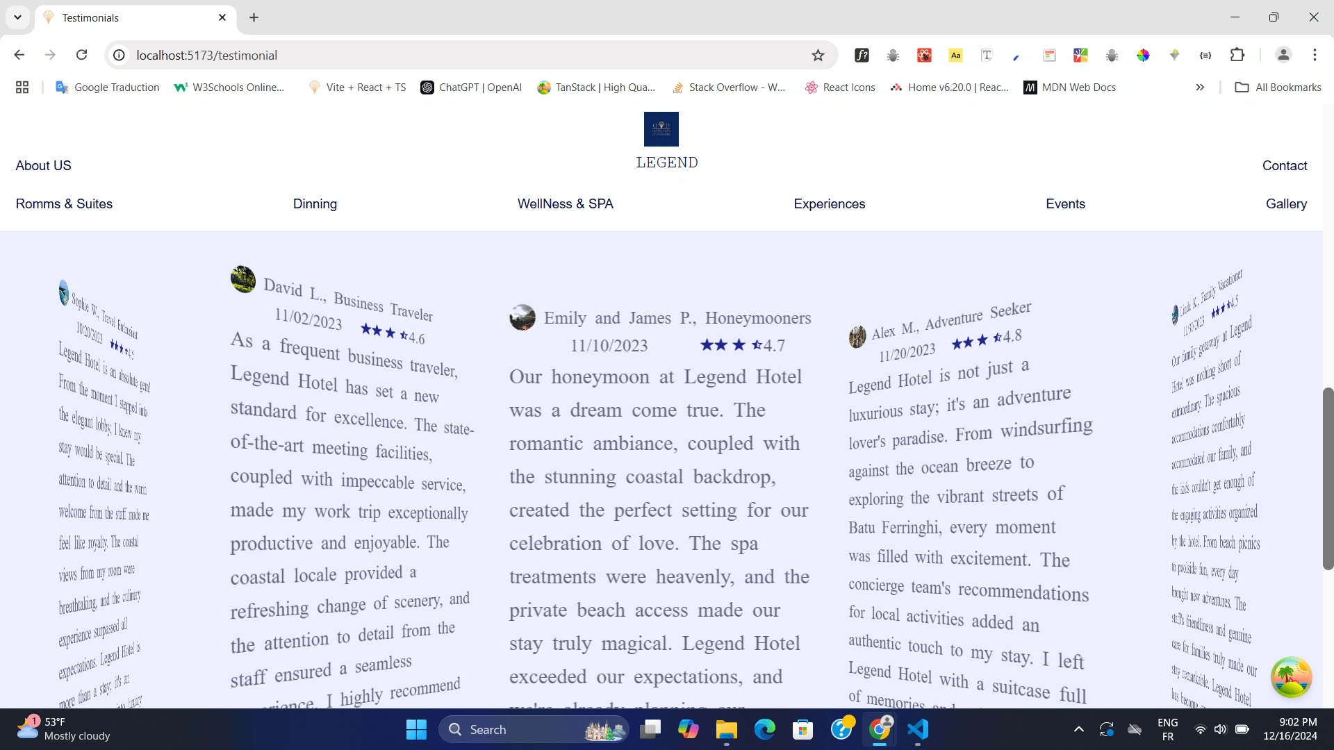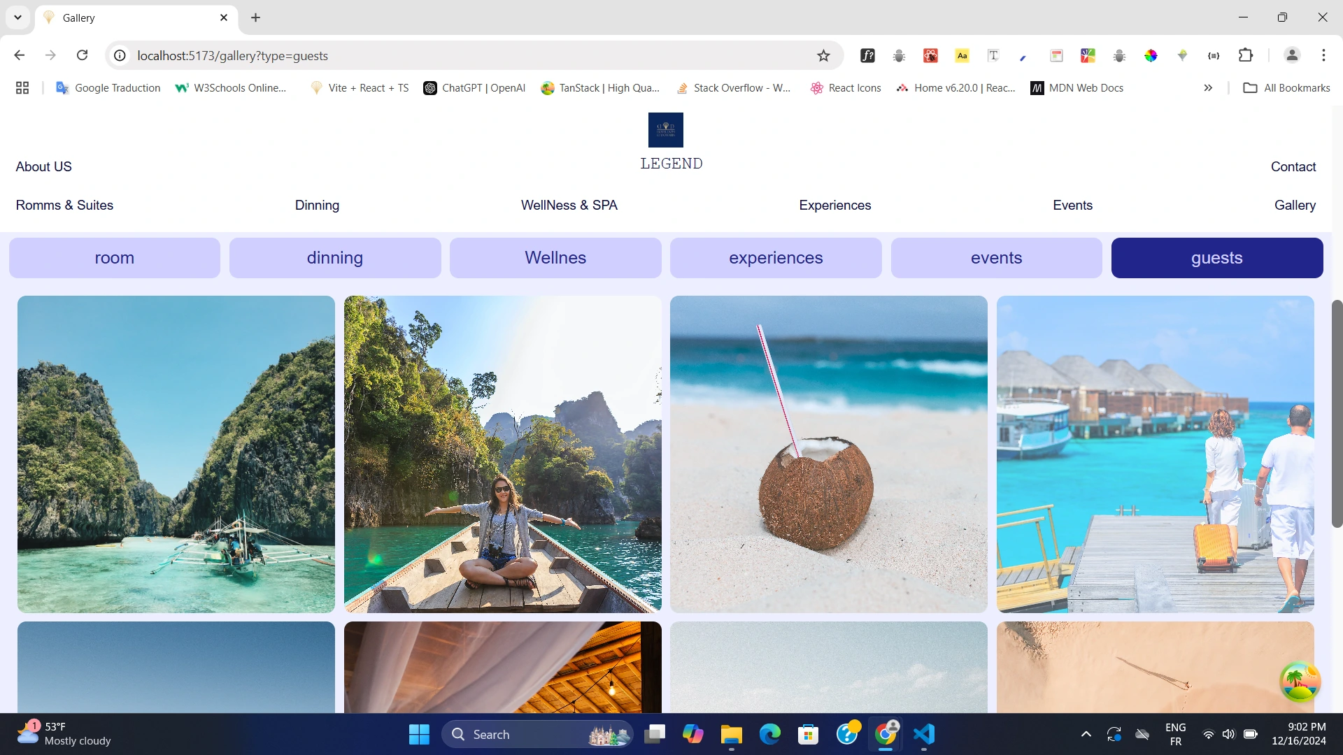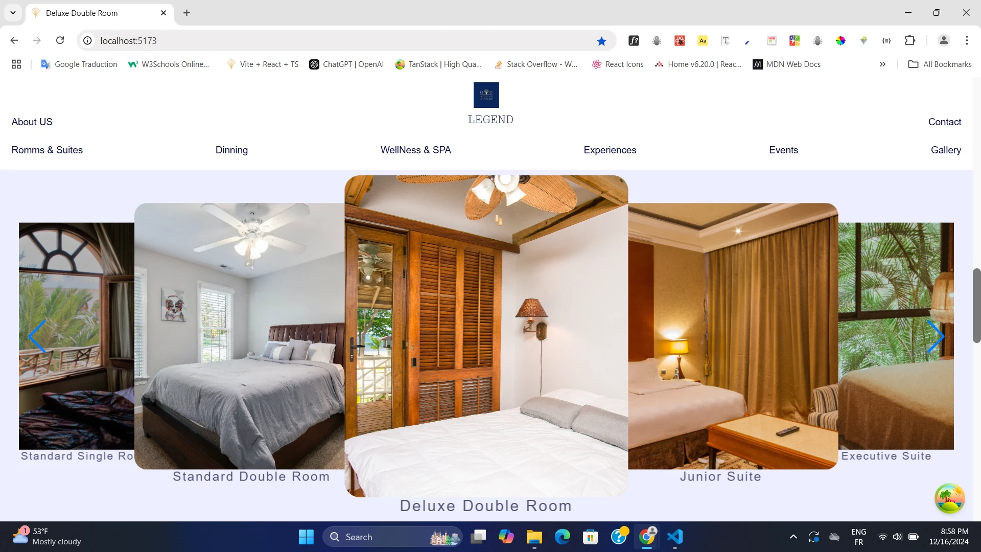 The homepage captivates visitors with a Swiper.js slider showcasing a variety of luxurious rooms and suites. The standout Rooms and Suites page leverages TanStack React Query for fast, efficient data fetching and updates. A comprehensive filter bar allows users to refine their search by room type, guest number, price, room size, and special features such as breakfast, pet-friendly options, living room availability, butler service, and child allowances—ensuring tailored results for every guest.