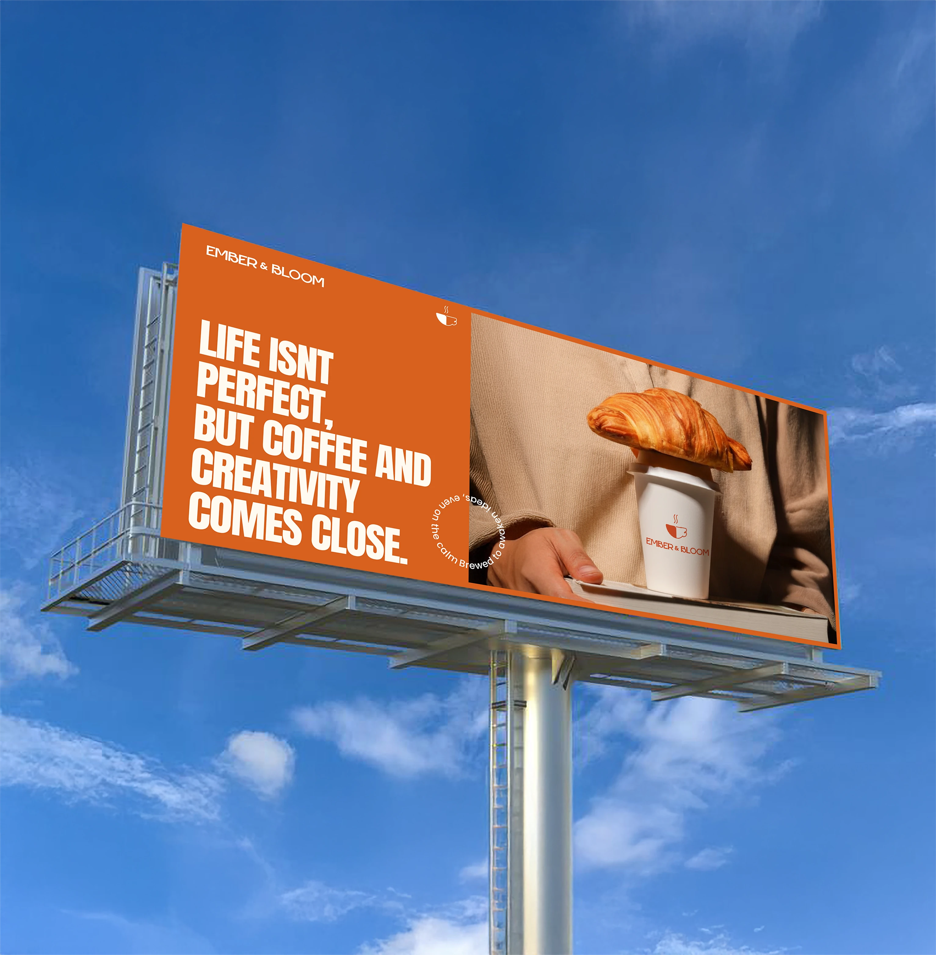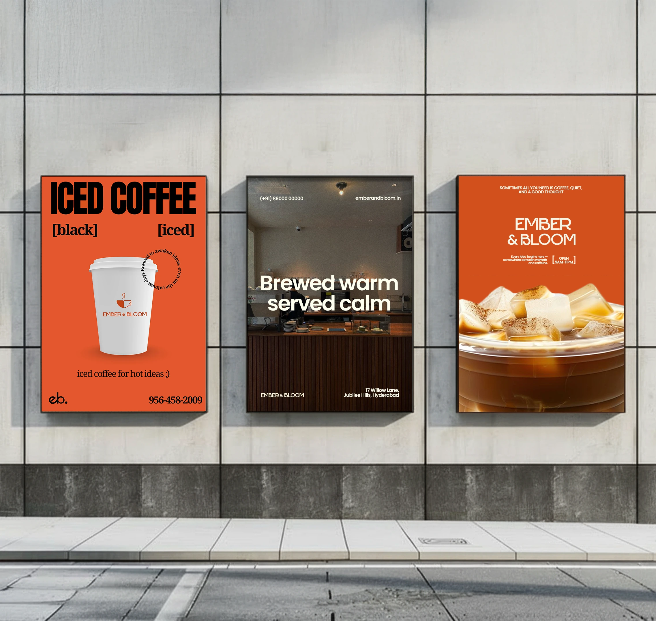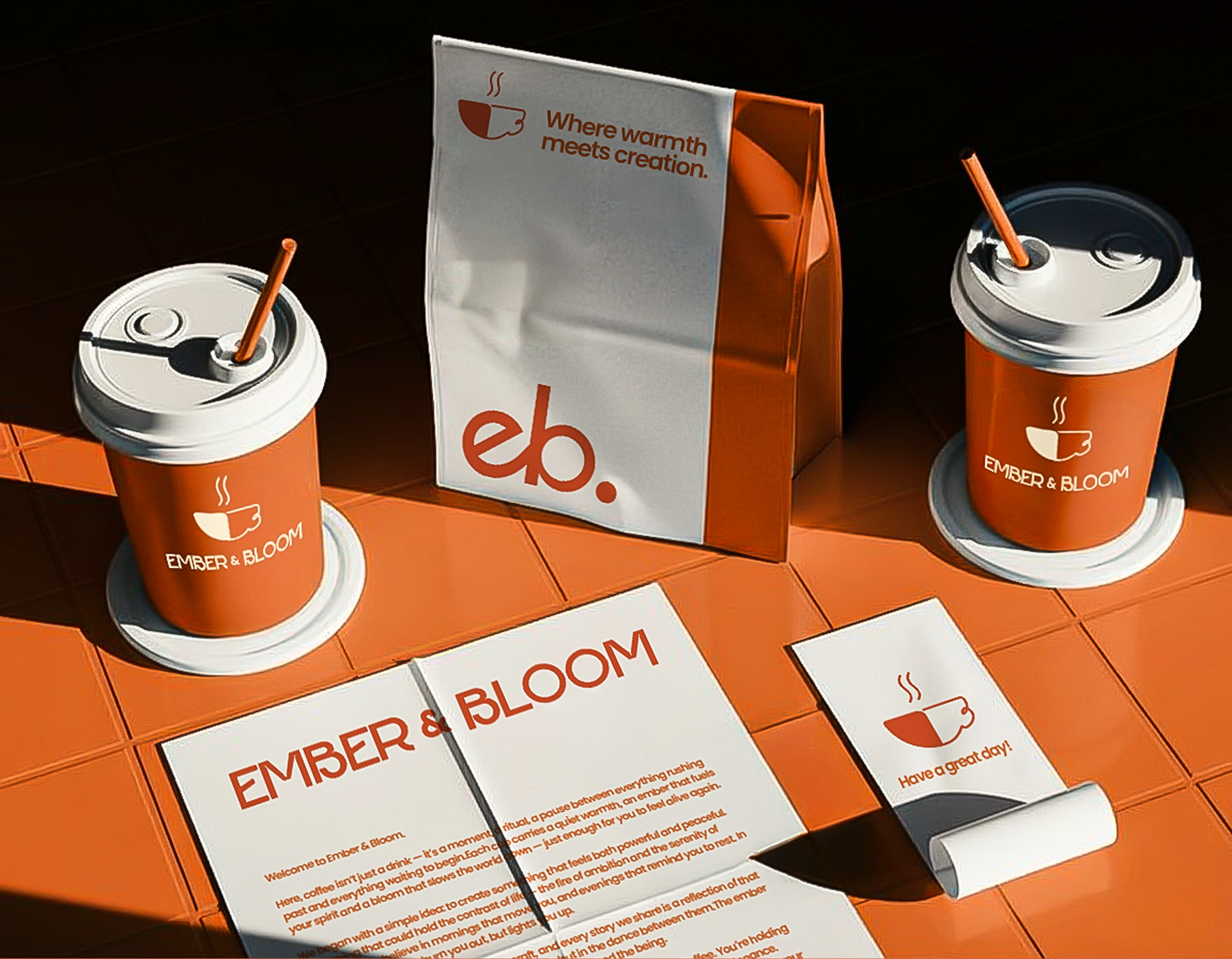 Most café brands lean either too rustic or too corporate. Ember & Bloom needed a balance, minimal yet inviting, premium yet human. We had to design a visual system that could stretch across coffee packaging, café interiors, and social media, all while staying instantly recognizable. The challenge was to make the brand look like it already belonged in the city’s creative ecosystem, not another aesthetic café, but a lifestyle space.