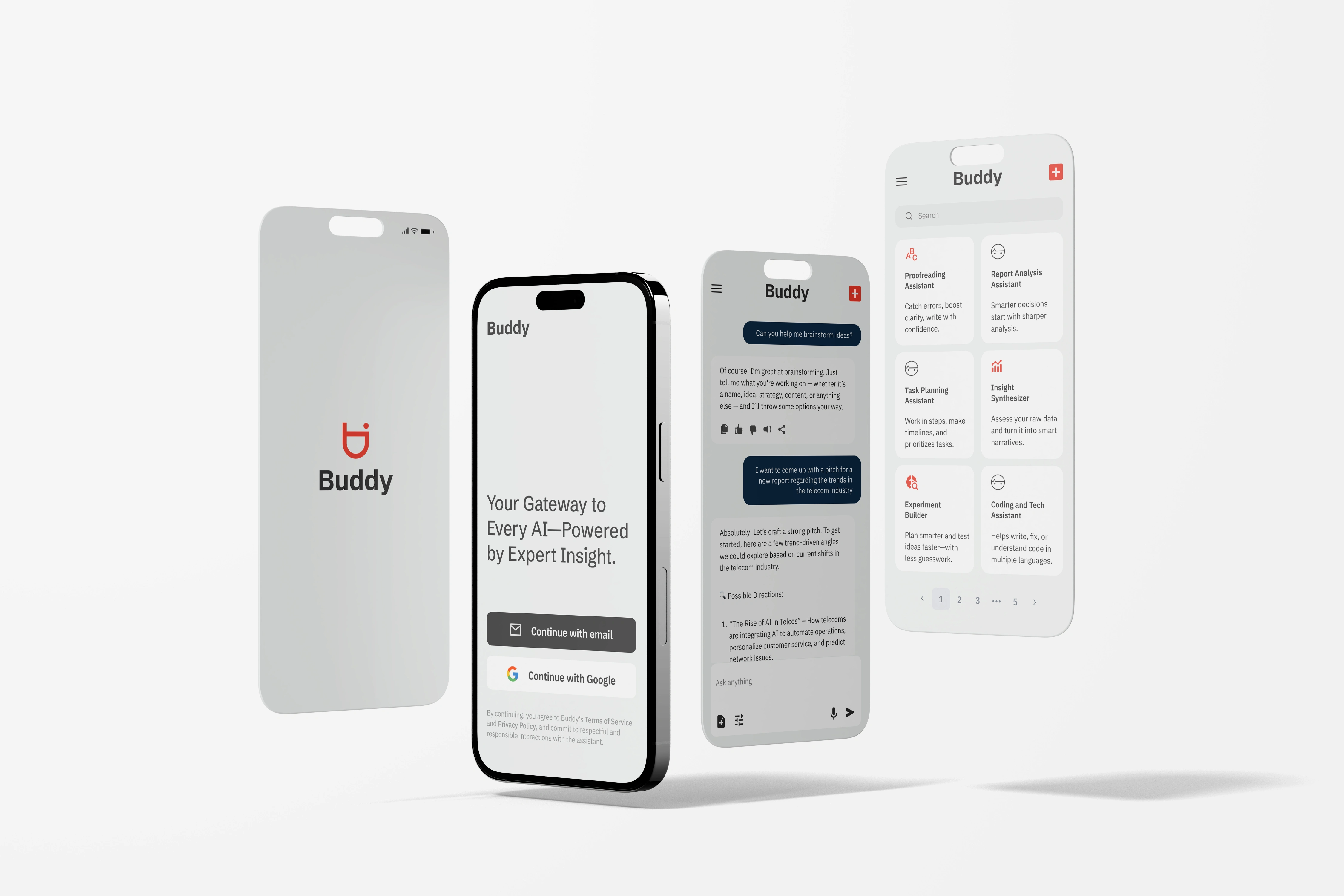 I led the design for the tool that retained its working title, Buddy—a powerful AI chatbot platform that aggregates leading AI models such as ChatGPT, Claude, Perplexity, and others into one seamless interface. The platform combined multi-model capabilities with Twimbit’s proprietary industry insights, creating a one-stop solution for advanced AI interaction and business intelligence. It also featured built-in and customizable assistants that supported common workflows, while allowing users to create tailored ones to meet their specific needs