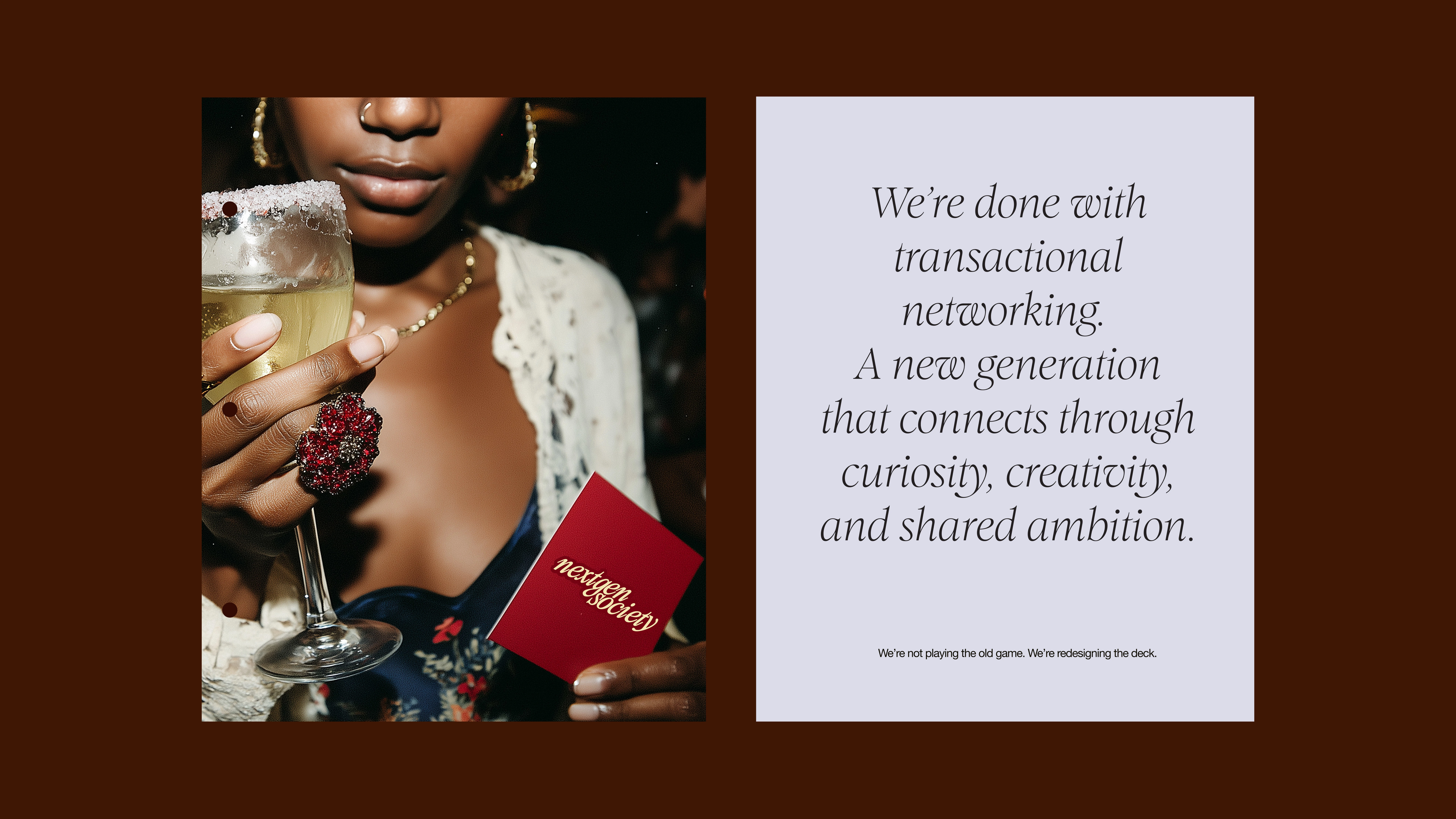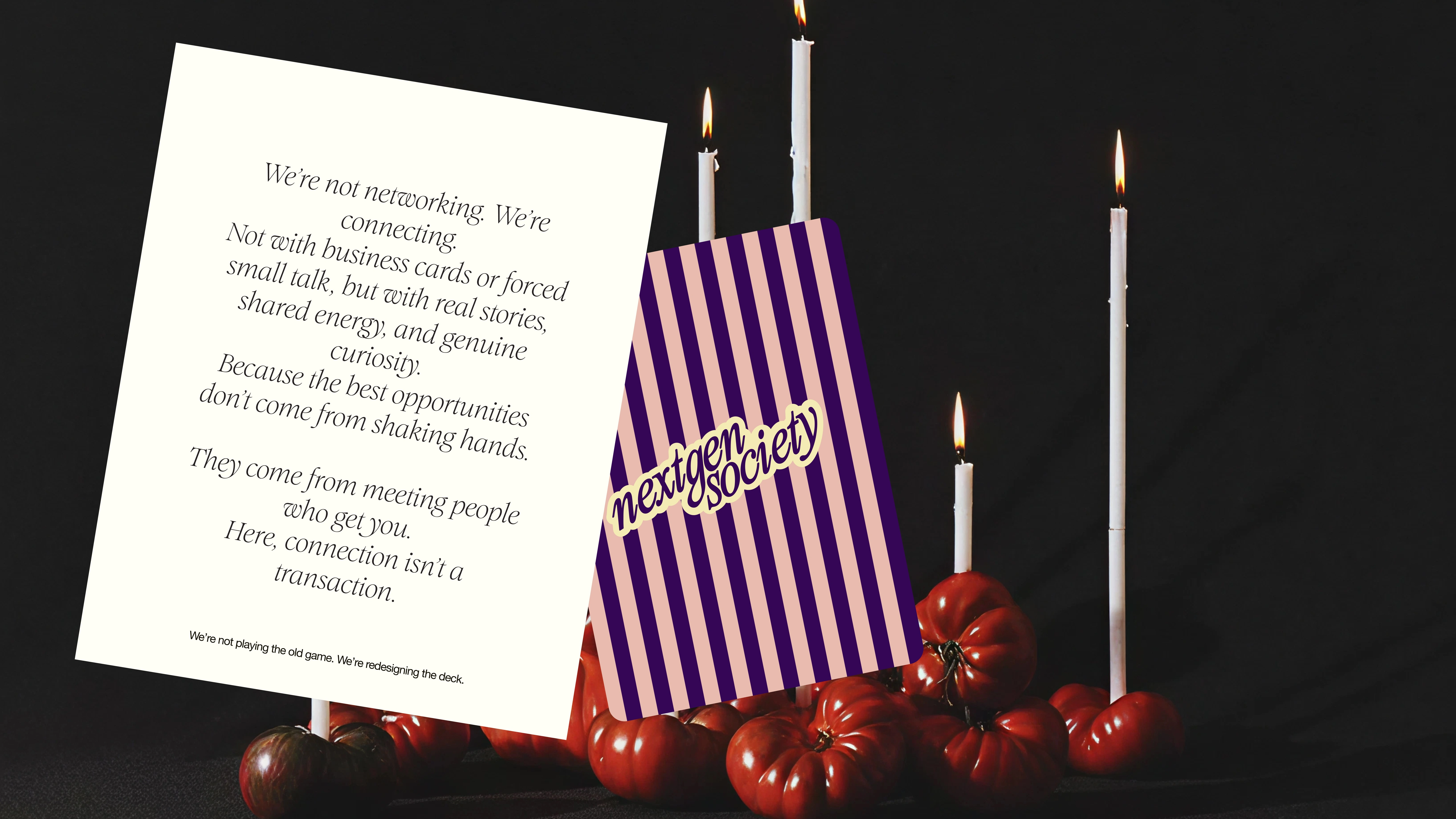Brand designer & art director. I developed a bold and expressive visual identity that reframes networking as something dynamic, social, and human. Through distinctive typography, flexible color combinations, and a playful graphic language inspired by cards and stickers, the brand creates a recognizable system that feels confident, contemporary, and community-driven.