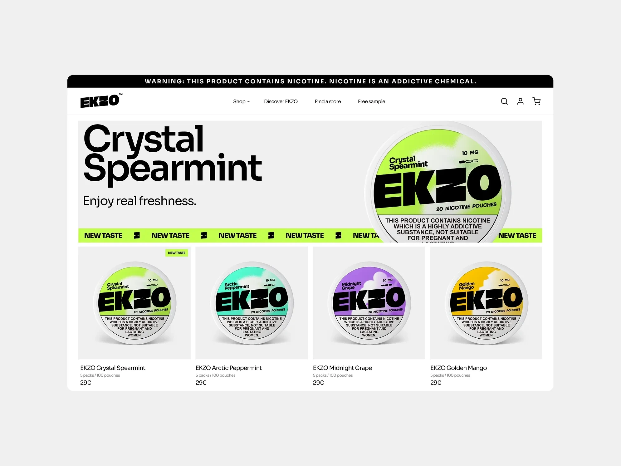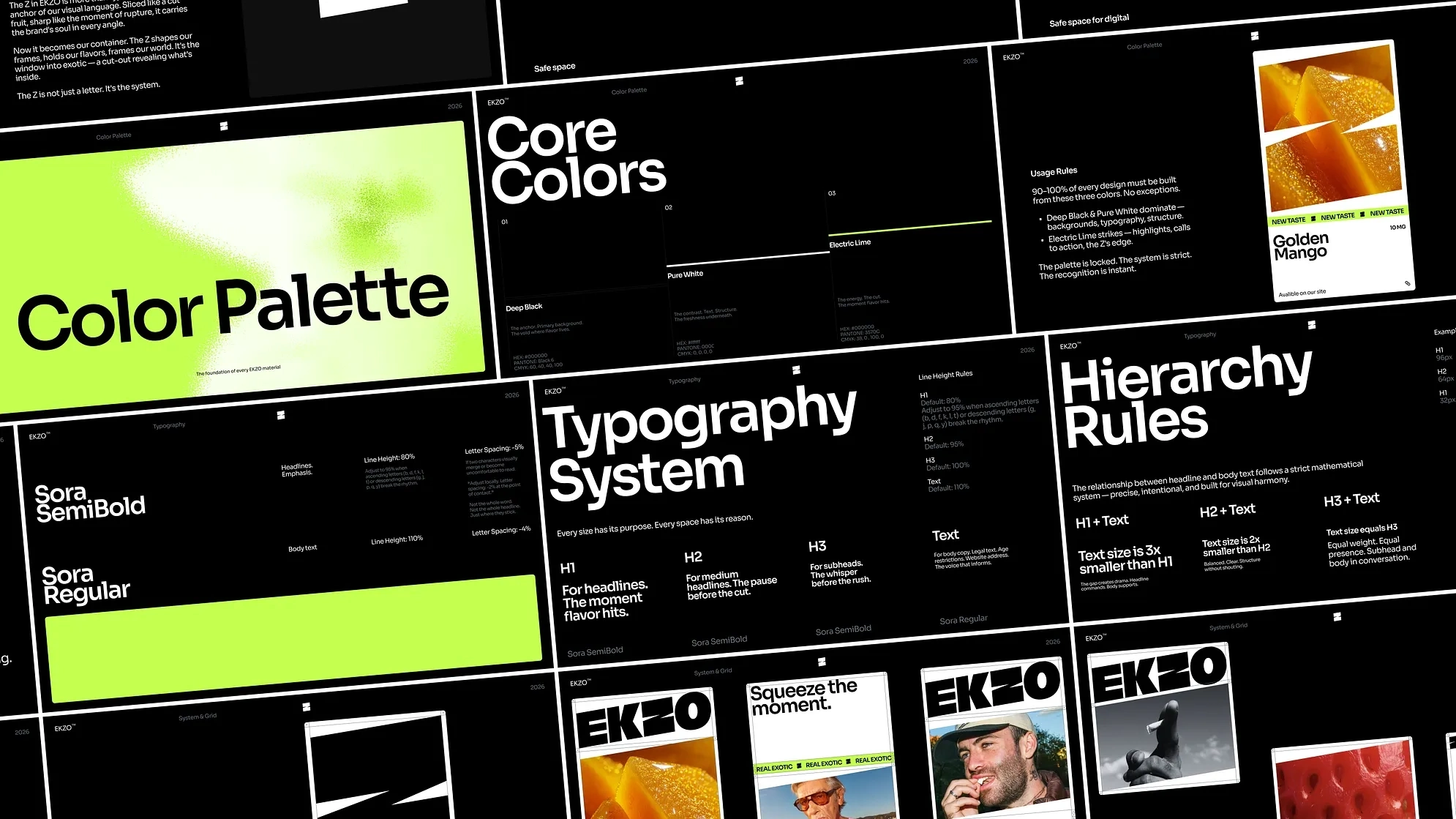 The wordmark is a custom mark. A bold, dense grotesque set at 5° — the weight alone creates a sense of juiciness, something ripe and full. The Z carries a clean diagonal cut: the visual equivalent of biting into fruit. Sharp enough to feel it on the tongue. From that cut, a container is born. Images live inside it — flavor photography, motion, lifestyle — framed by the angle that defines the entire visual language. When clarity demands it, the cut disappears and only the tilted rectangle remains. The container adapts. The logic stays.