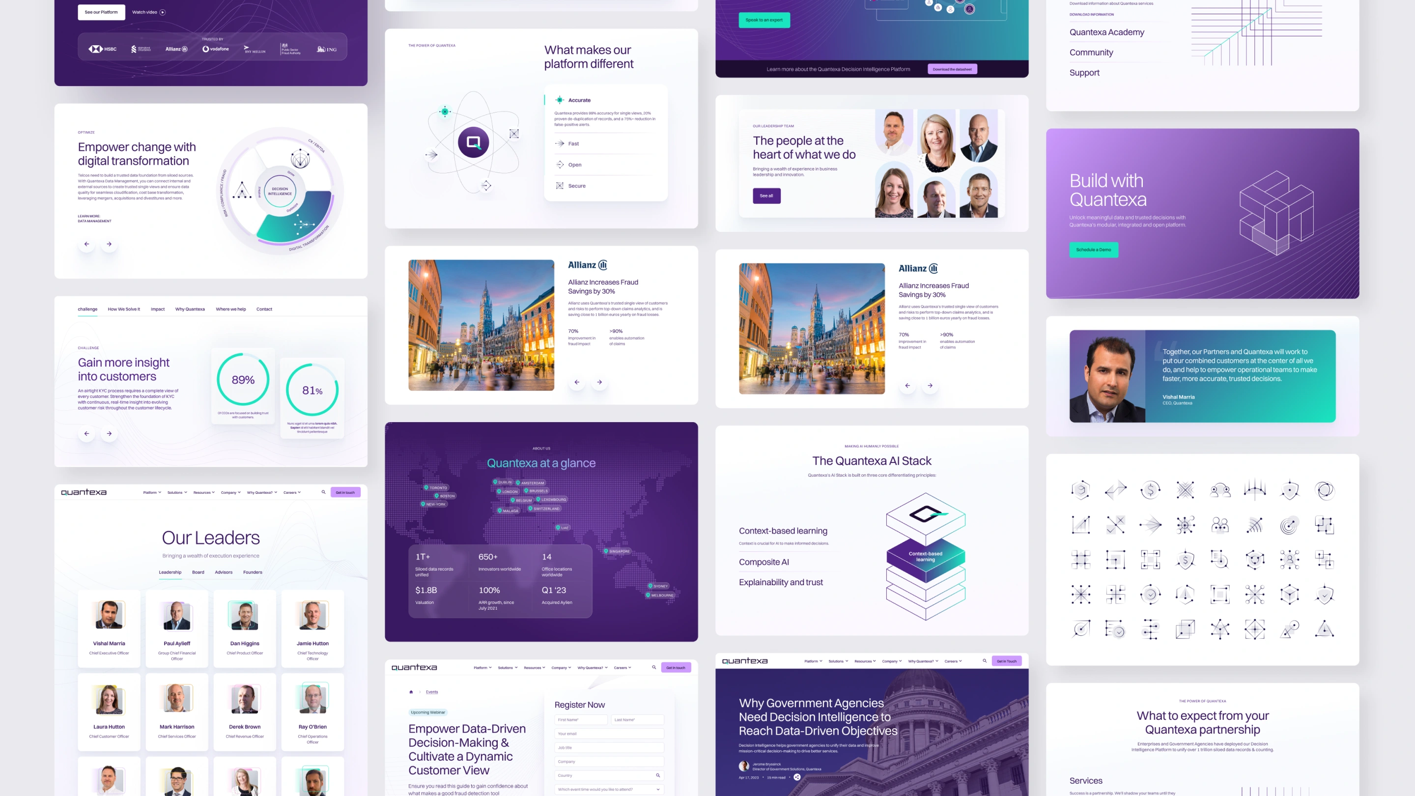 Working in close collaboration with Quantexa’s internal design, marketing, and dev teams, we built a modular design system from the ground up. We created a library of custom illustrations and iconography, applied lightweight animation principles, and delivered high-fidelity designs for a deeply interactive site spanning dozens of unique page types. Through weekly sprints, Git-based handoffs, and QA alignment, we helped accelerate execution while maintaining creative quality.