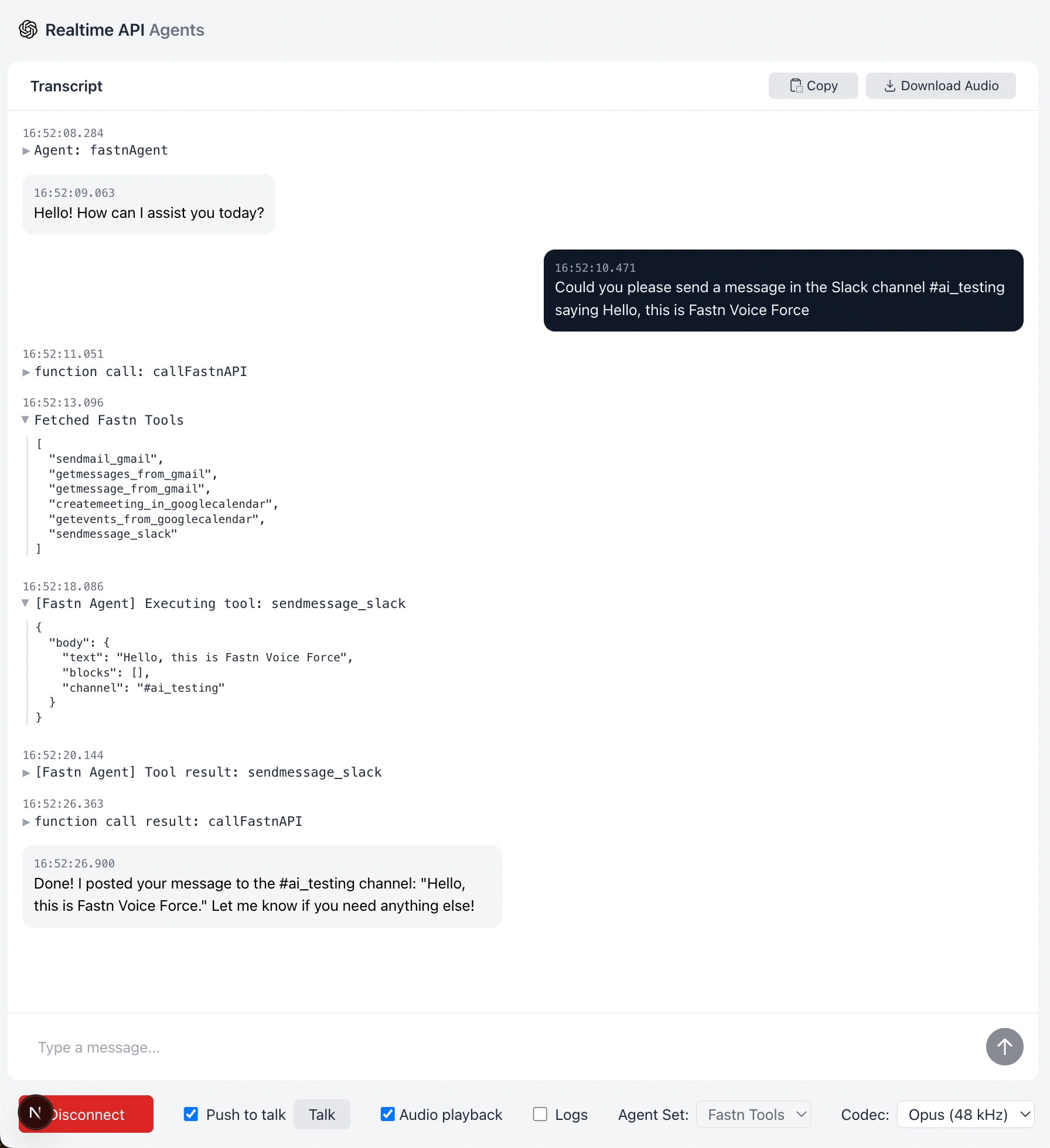 .env with your credentials:Fastn Tools Agentsrc/app/agentConfigs/fastnAgent.ts)src/app/agentConfigs/fastnDocsAgent.ts)src/app/agentConfigs/allAgentSets mapping in src/app/agentConfigs/index.tssrc/app/components/BottomToolbar.tsxhttps://live.fastn.ai/api/ucl/getTools - Retrieves available toolshttps://live.fastn.ai/api/ucl/executeTool - Executes tools with parametershttps://live.fastn.ai/api/v1/serviceAgent - Queries documentationsrc/app/App.tsx: when a response.text.delta stream starts we mark the message as IN_PROGRESS, and once the server emits guardrail_tripped or response.done we mark the message as FAIL or PASS respectively. If you want to change how moderation is triggered or displayed, search for guardrail_tripped inside App.tsx and tweak the logic there.Posted Oct 6, 2025