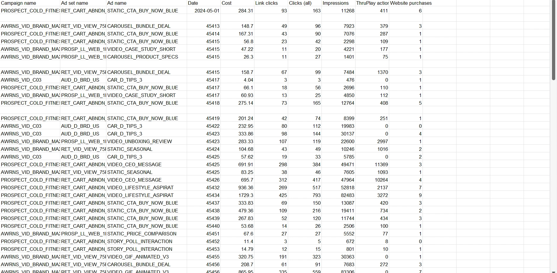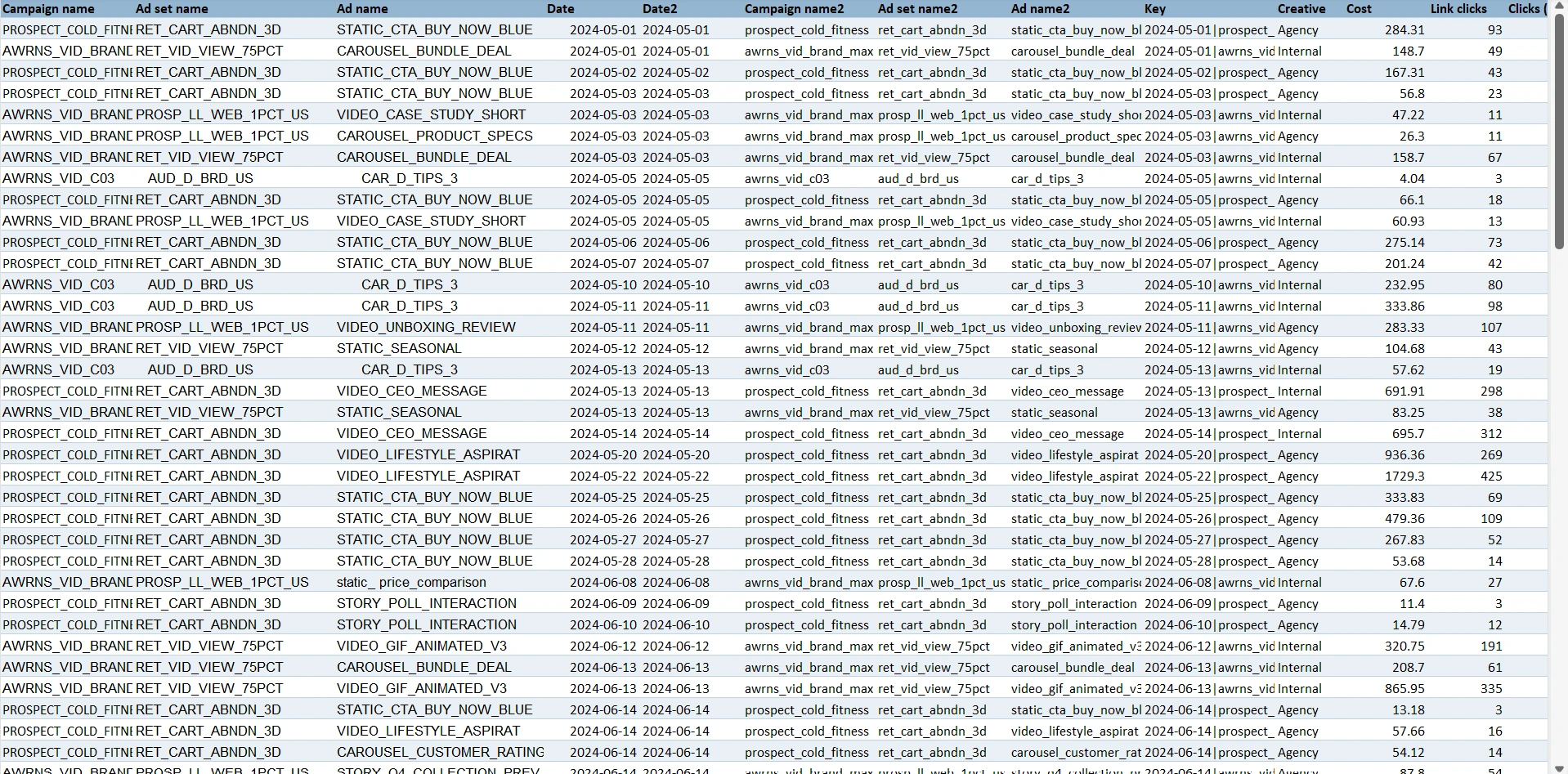 The project started with a raw, exported mess of campaign metrics. It had all the right numbers—costs, clicks, and performance indicators—but they were stuck in a format that was impossible to use for quick decision-making.