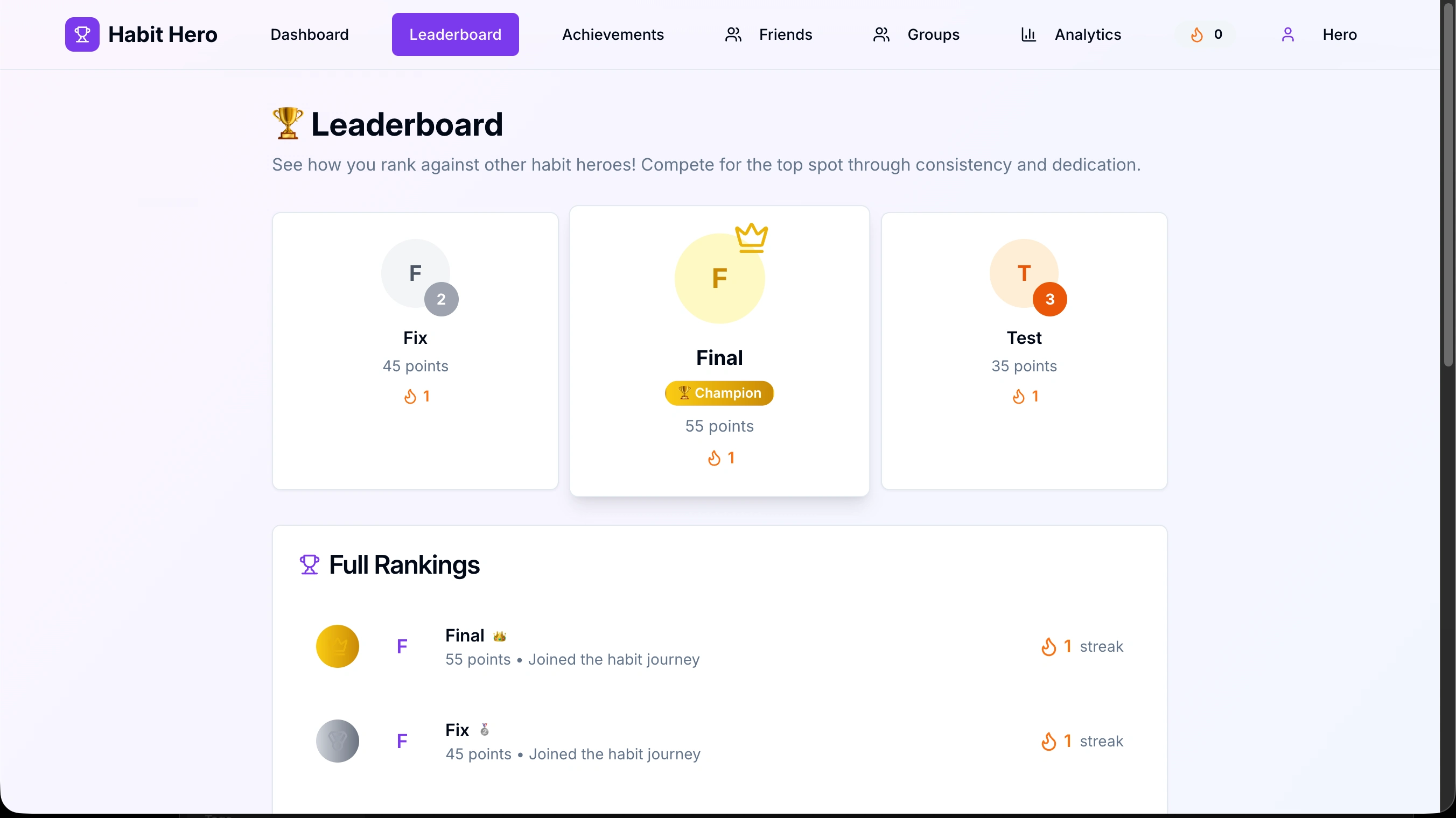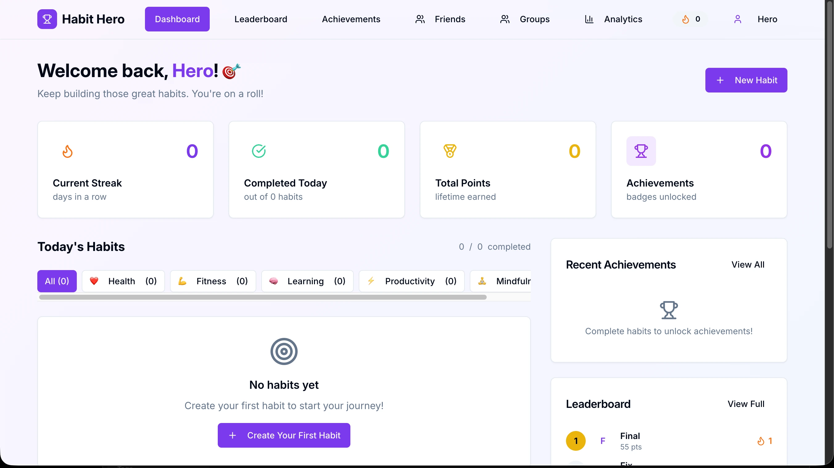 Built a habit tracker app that turns personal growth into a social experience - featuring streaks, achievements, leaderboards, friend groups and deep analytics