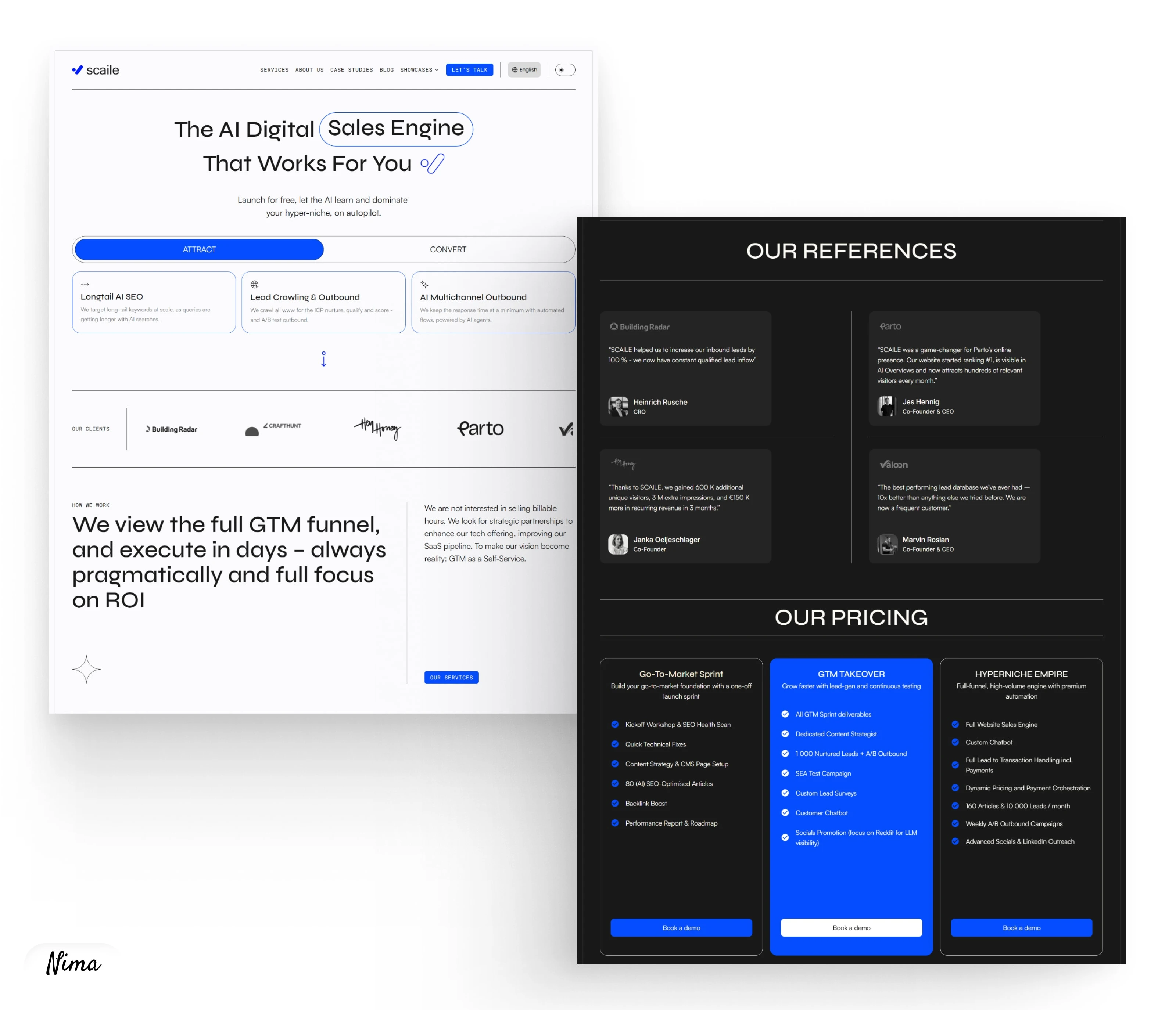 SCAILE – AI Growth & Sales Platform (website) designed in Figma, animated with Jitter, and developed in Framer for a seamless, modern digital experience.