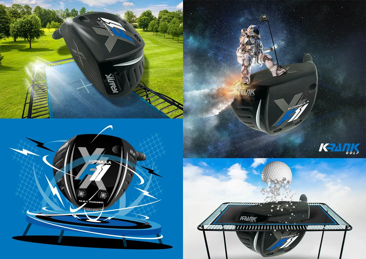 Product Description: I conceived and created these images exclusively for Krank Golf's Social Media advertisements showcasing their Formula 11 Golf Driver. Utilizing Adobe Photoshop and Illustrator, I brought my concepts to life. Some images align with their "Out of this World" campaign, while others vividly illustrate the distinct "Spring Effect" or "Trampoline Effect" of the driver's face upon ball impact.