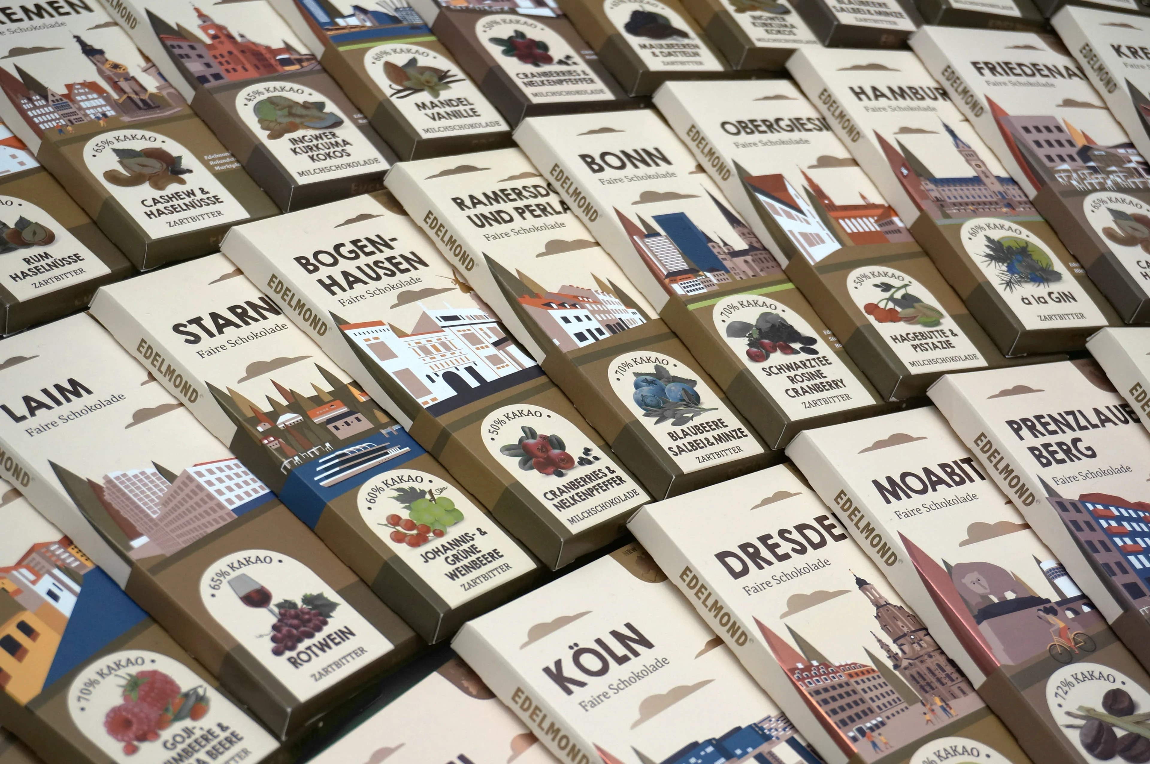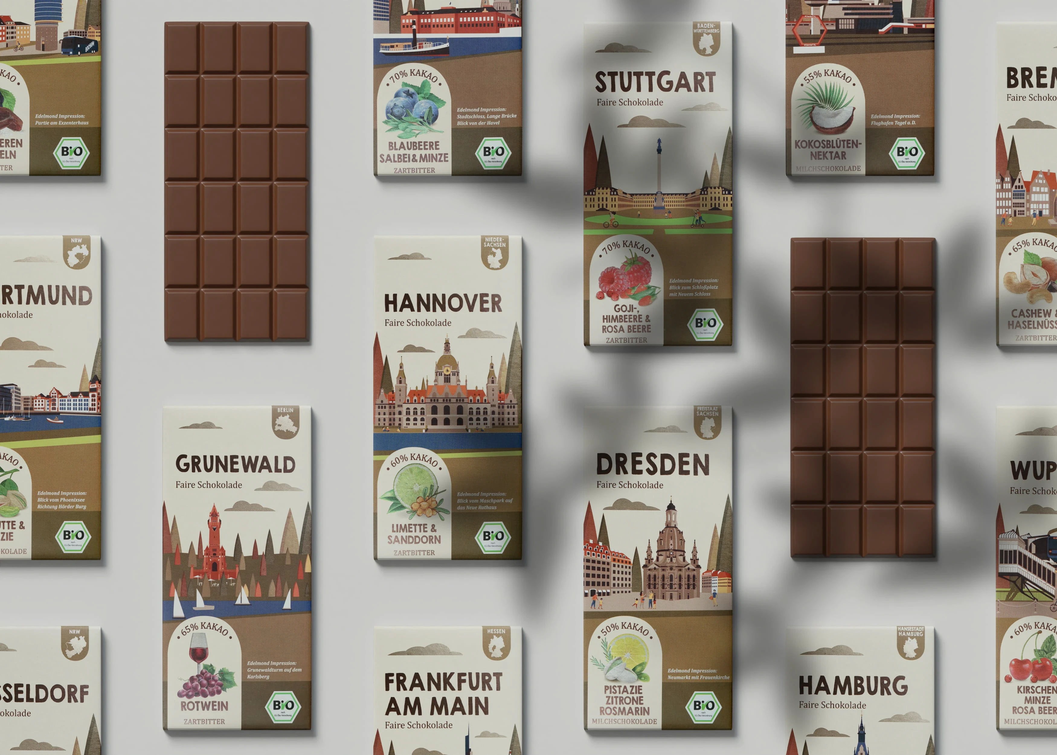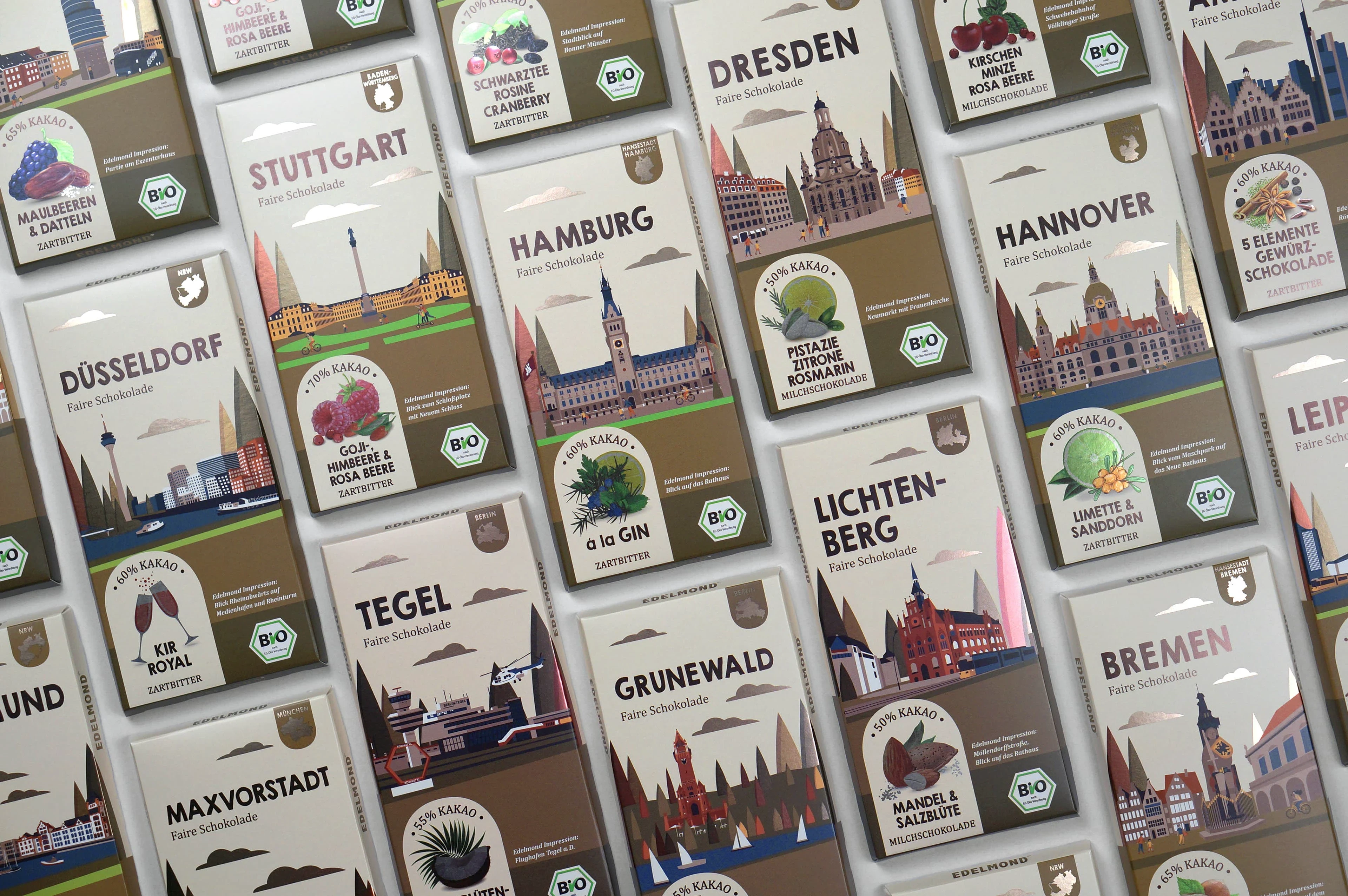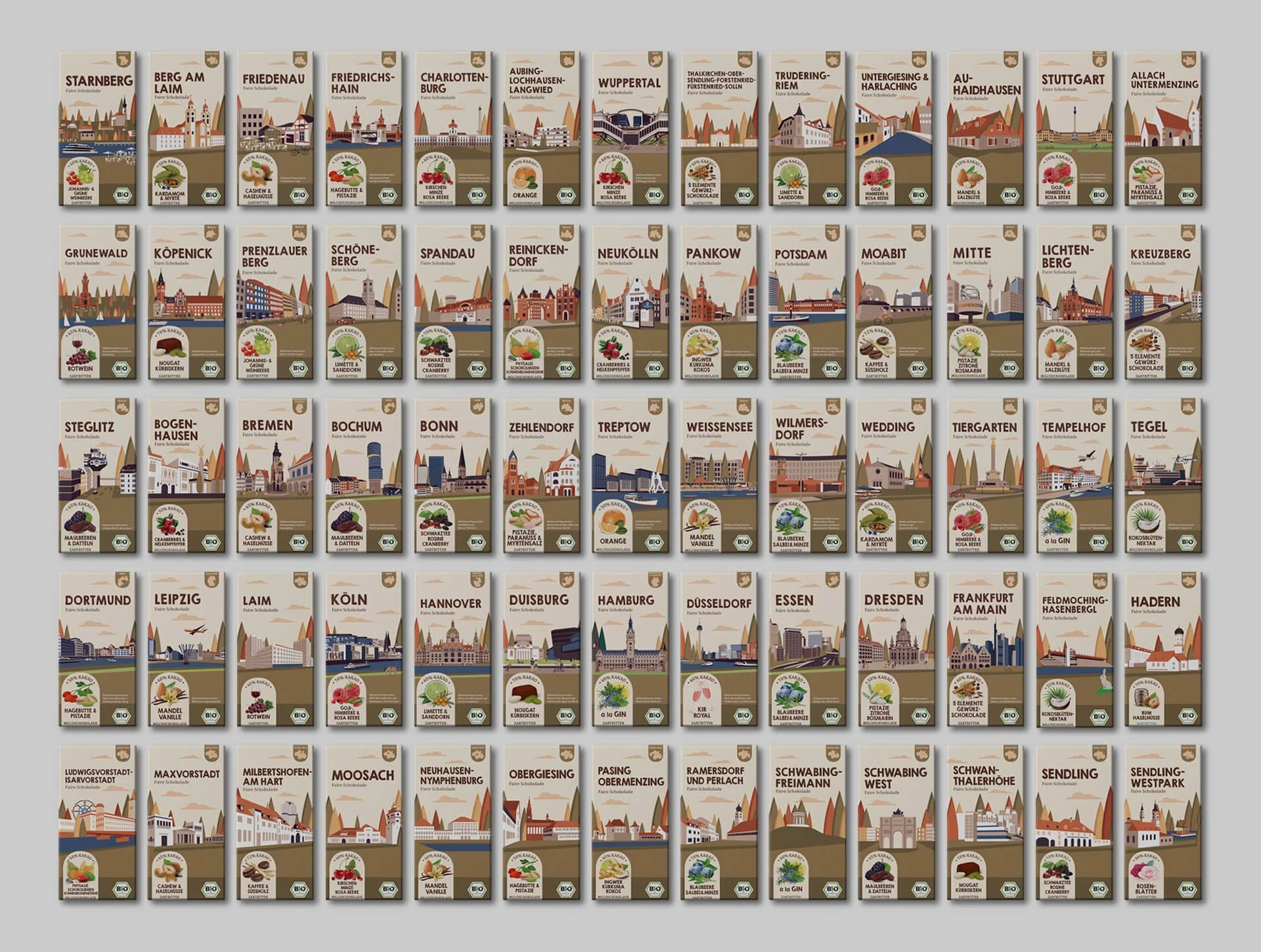 Client's project goal: Create a design for chocolate packaging with the names of different cities in Germany and districts of Munich and Berlin and with different tastes.