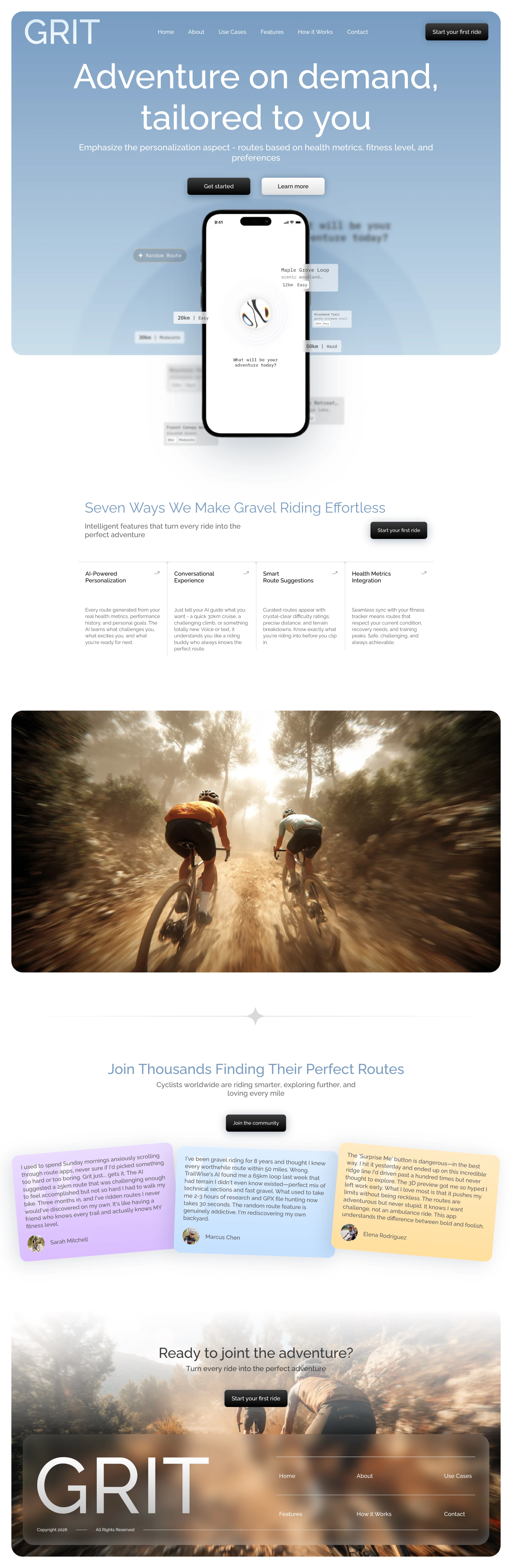 GRIT is an AI-powered adventure cycling platform that delivers personalized gravel riding experiences based on users' health metrics, fitness levels, and preferences. The landing page was designed to convert outdoor enthusiasts into active users by showcasing the platform's intelligent personalization capabilities.