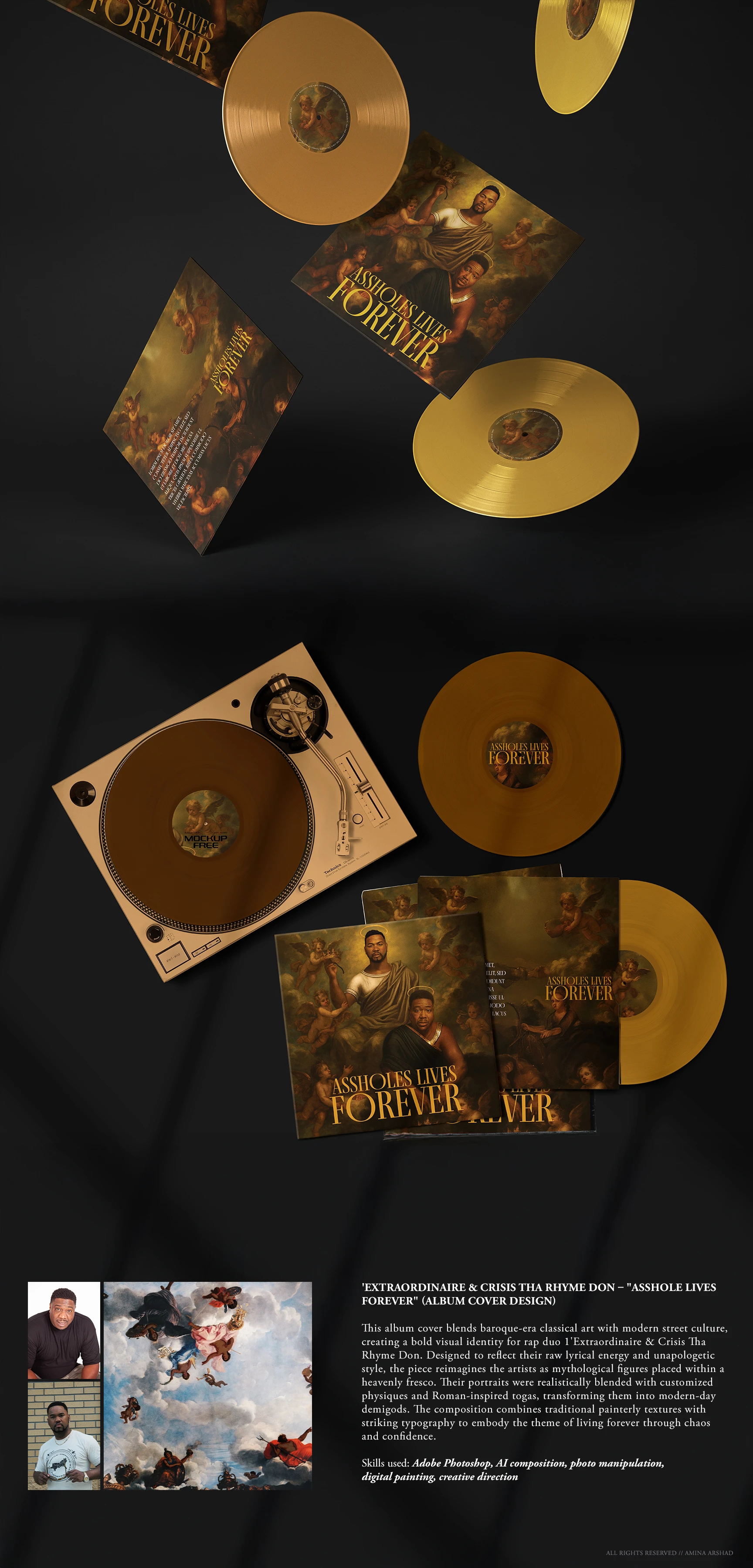 Baroque-inspired album cover merging hip-hop attitude with divine themes, reimagining two rappers as modern-day demigods draped in Roman togas.