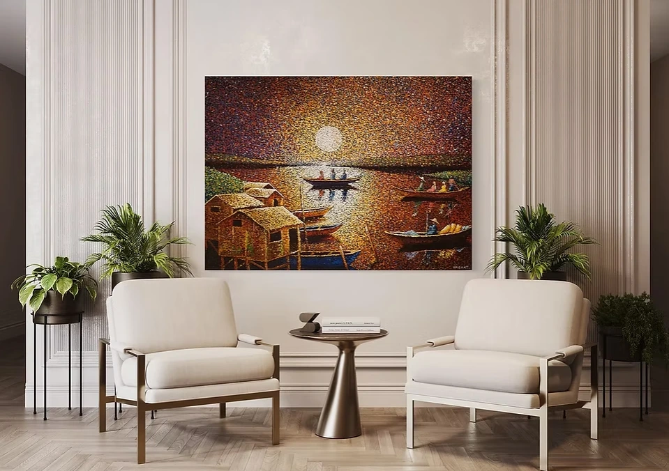 Waterside is a picturesque masterpiece, a scene in rural Nigeria, made up of thousands of dots. An alluring landscape and the colours truly change the longer you stare at the sun setting. A perfect conversation starter in any beautiful room.