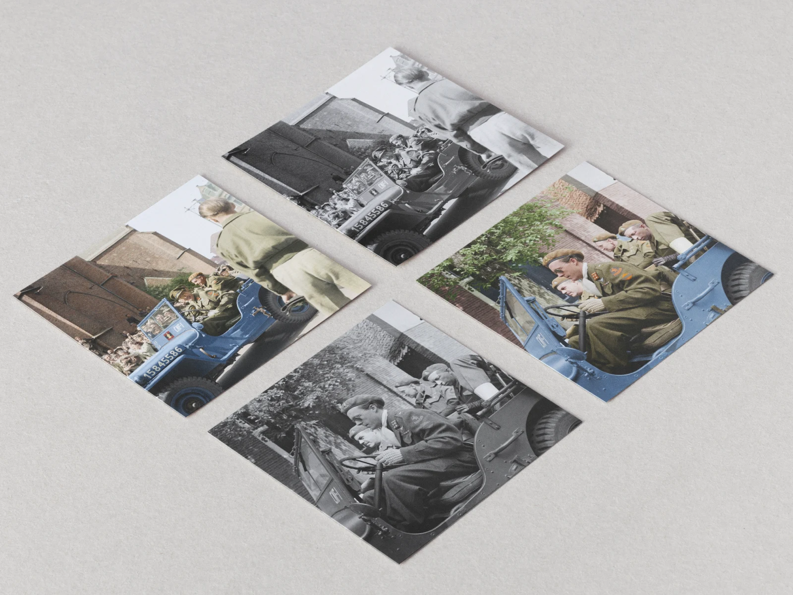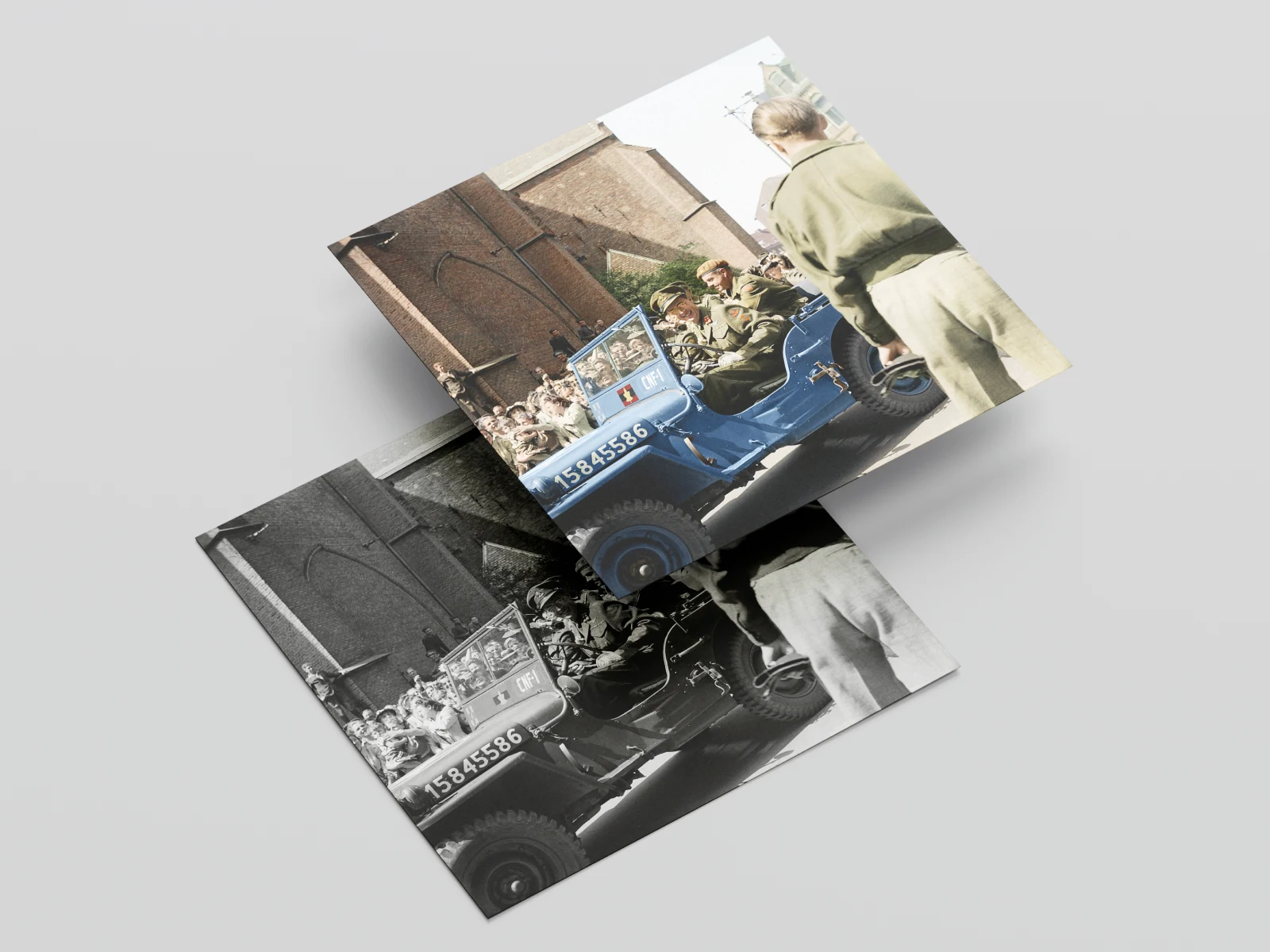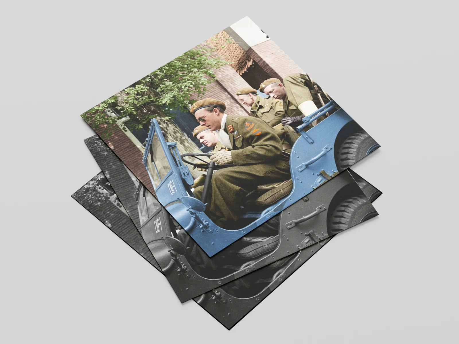 The client wanted a truthfull fullcolour photograph made from archival black and white photo. The Jeep had to be light-blue. Research found only two written accounts of the car being light-blue instead of the normal dark green.