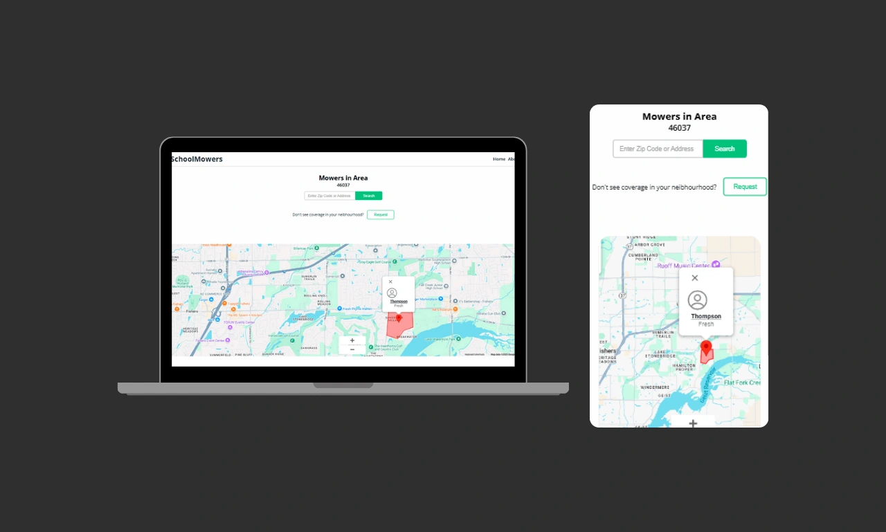 High School Mowers connects users to local lawn care services, offering service area search, secure login, stripe payments, and a contact form for support.