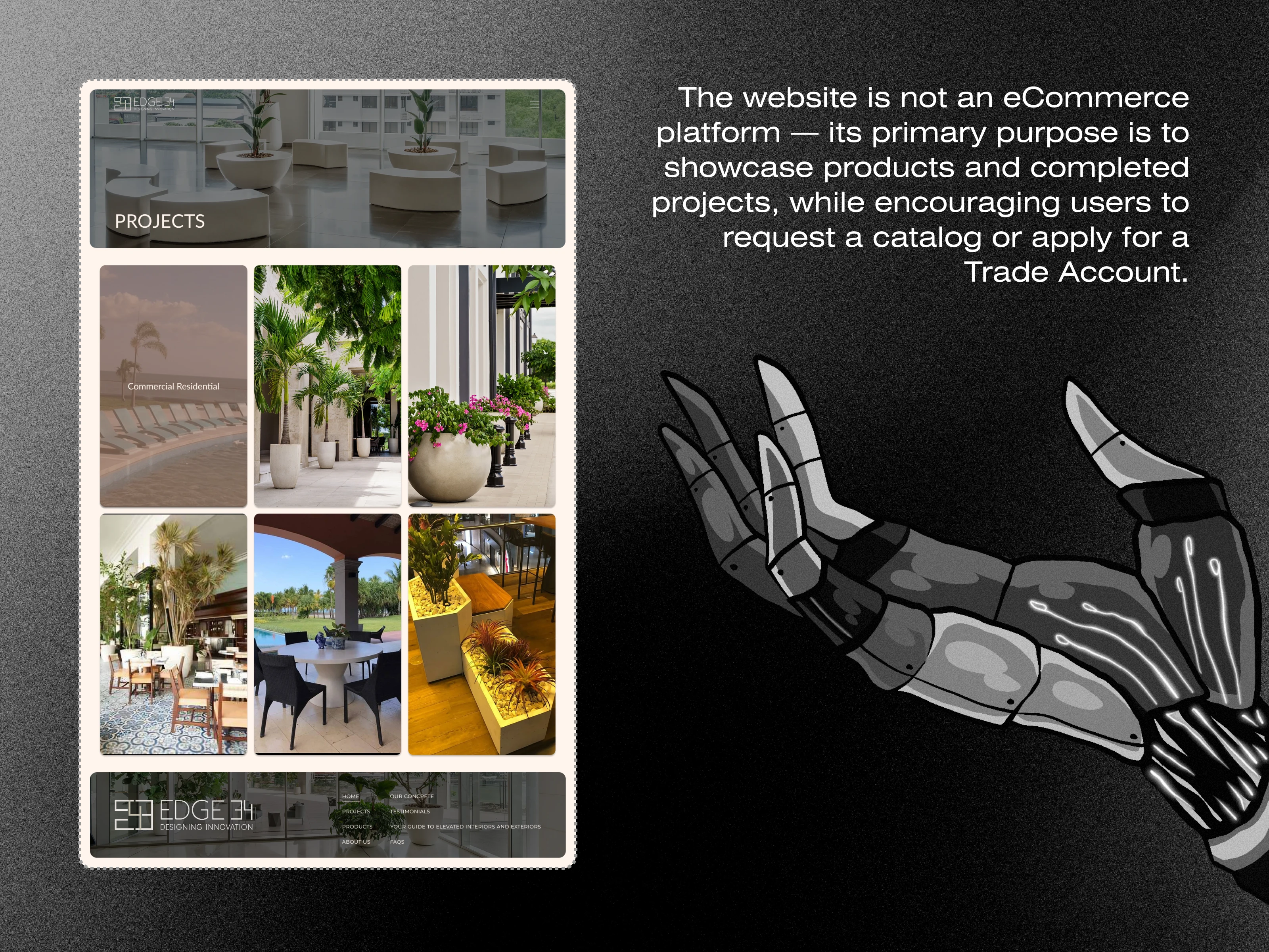 The website is not an eCommerce platform — its primary purpose is to showcase products and completed projects, while encouraging users to request a catalog or apply for a Trade Account.
