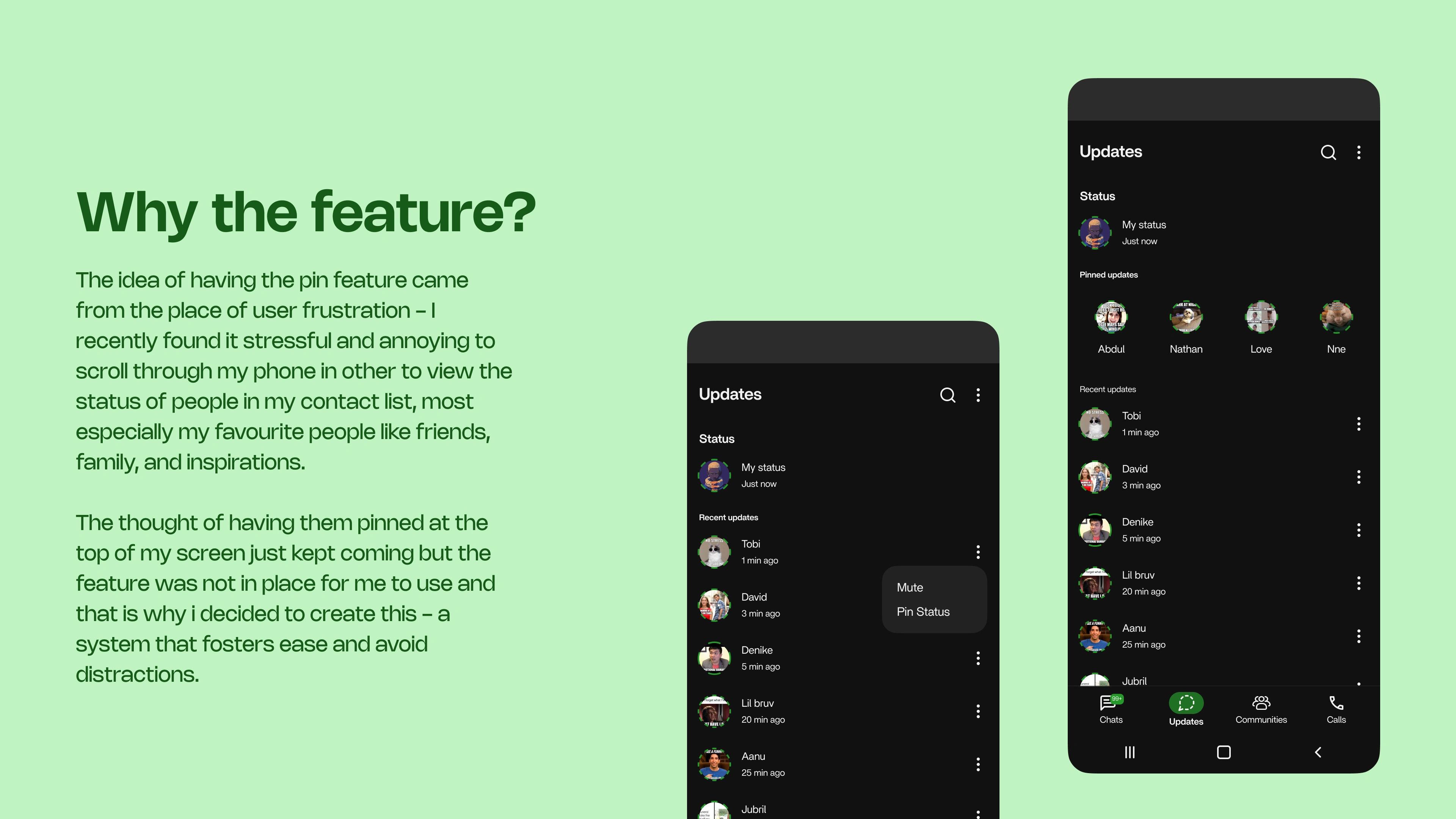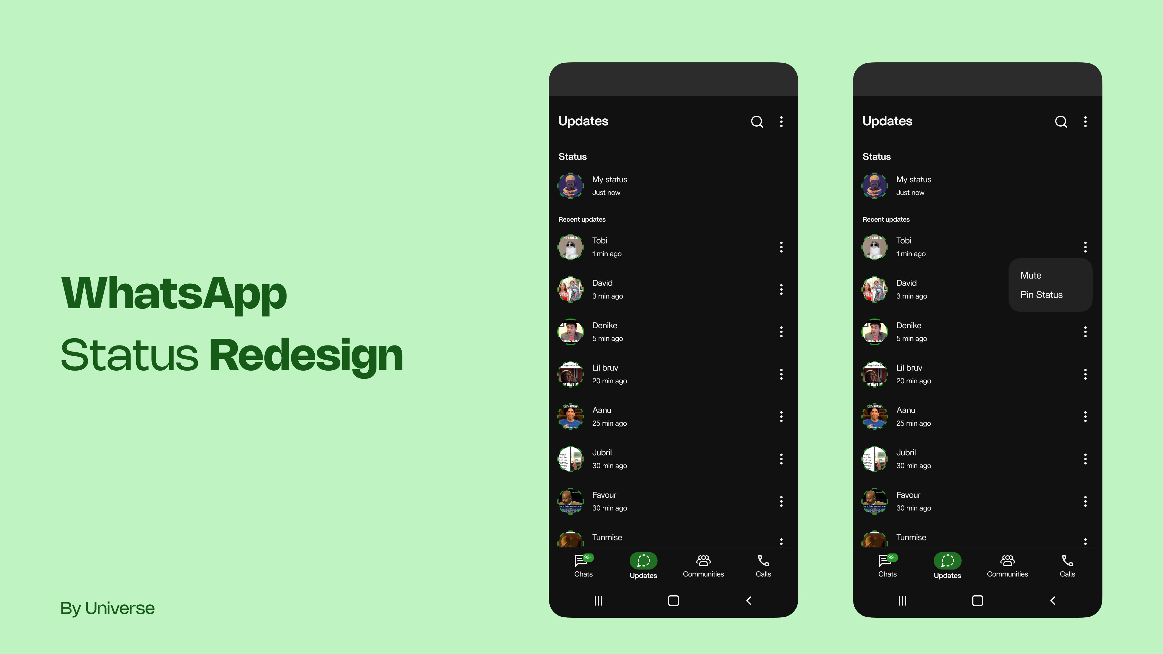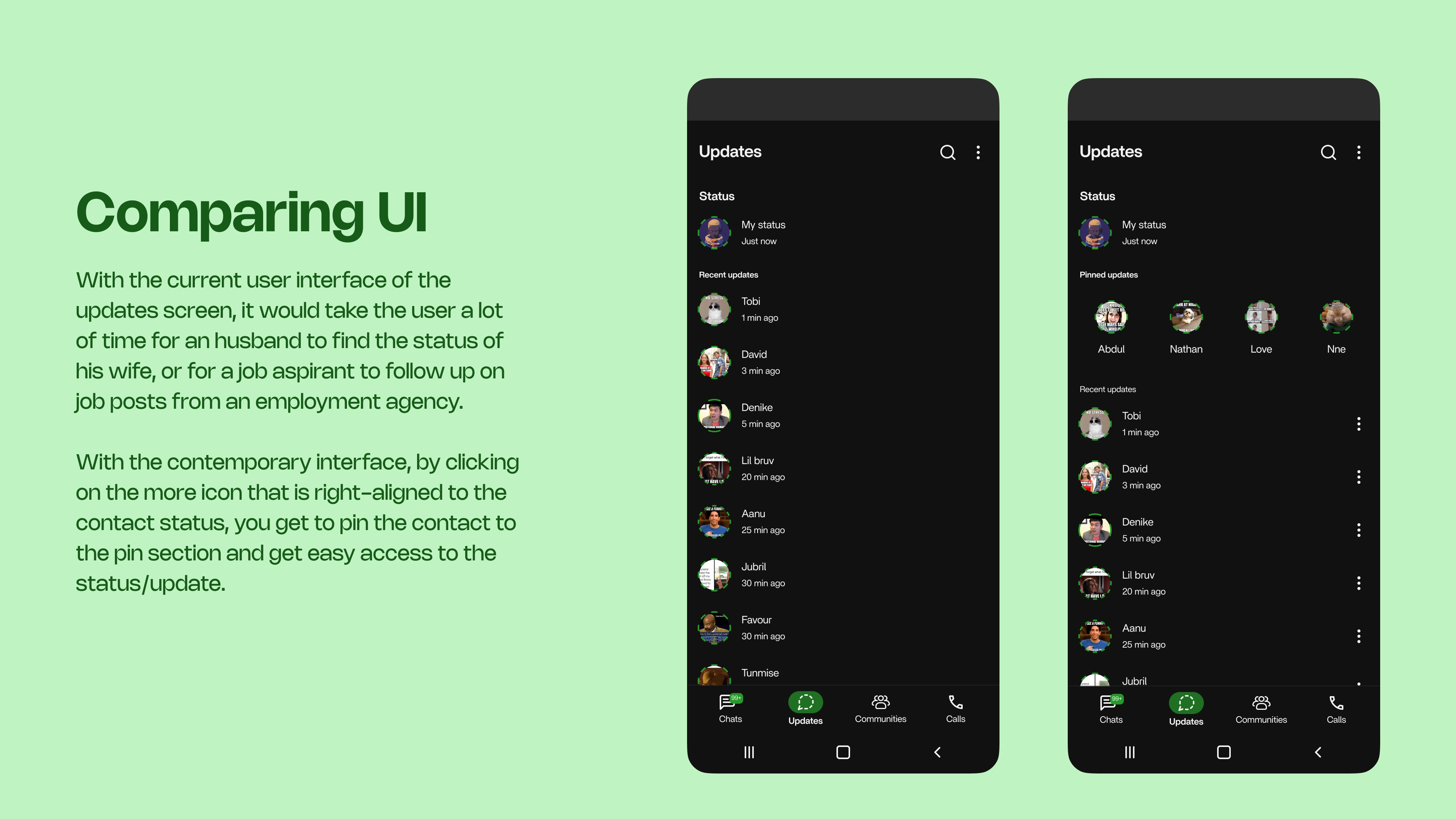 A redesign of WhatsApp with an added feature that helps users pin their favorite contacts on the status screen for easier accessibility.