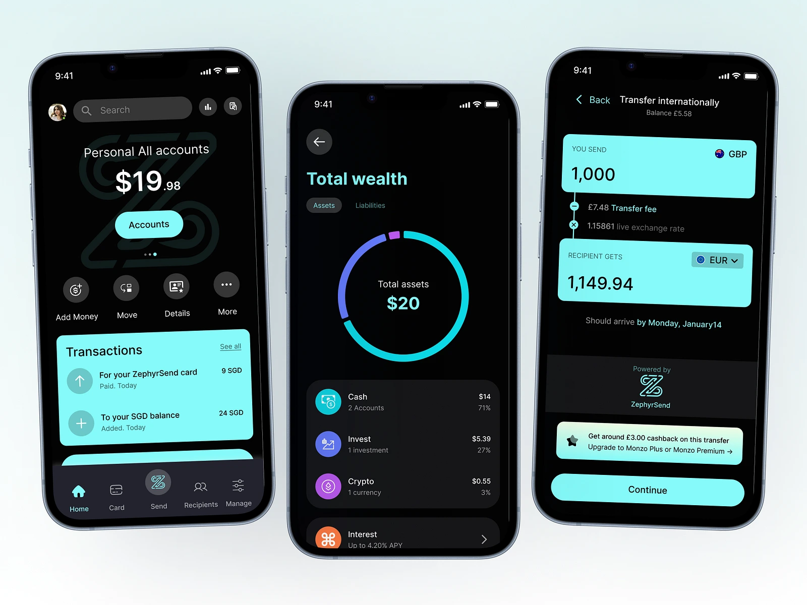 Designed a mobile banking and crypto wallet app concept with a sleek, dark theme.