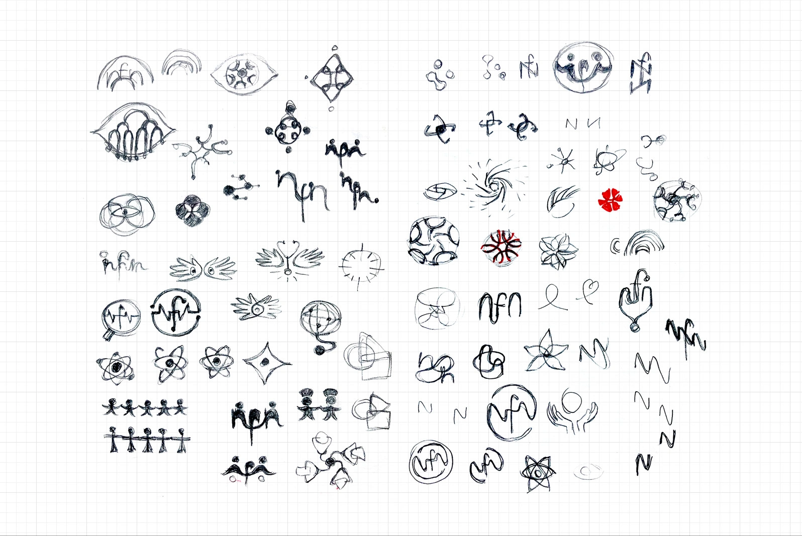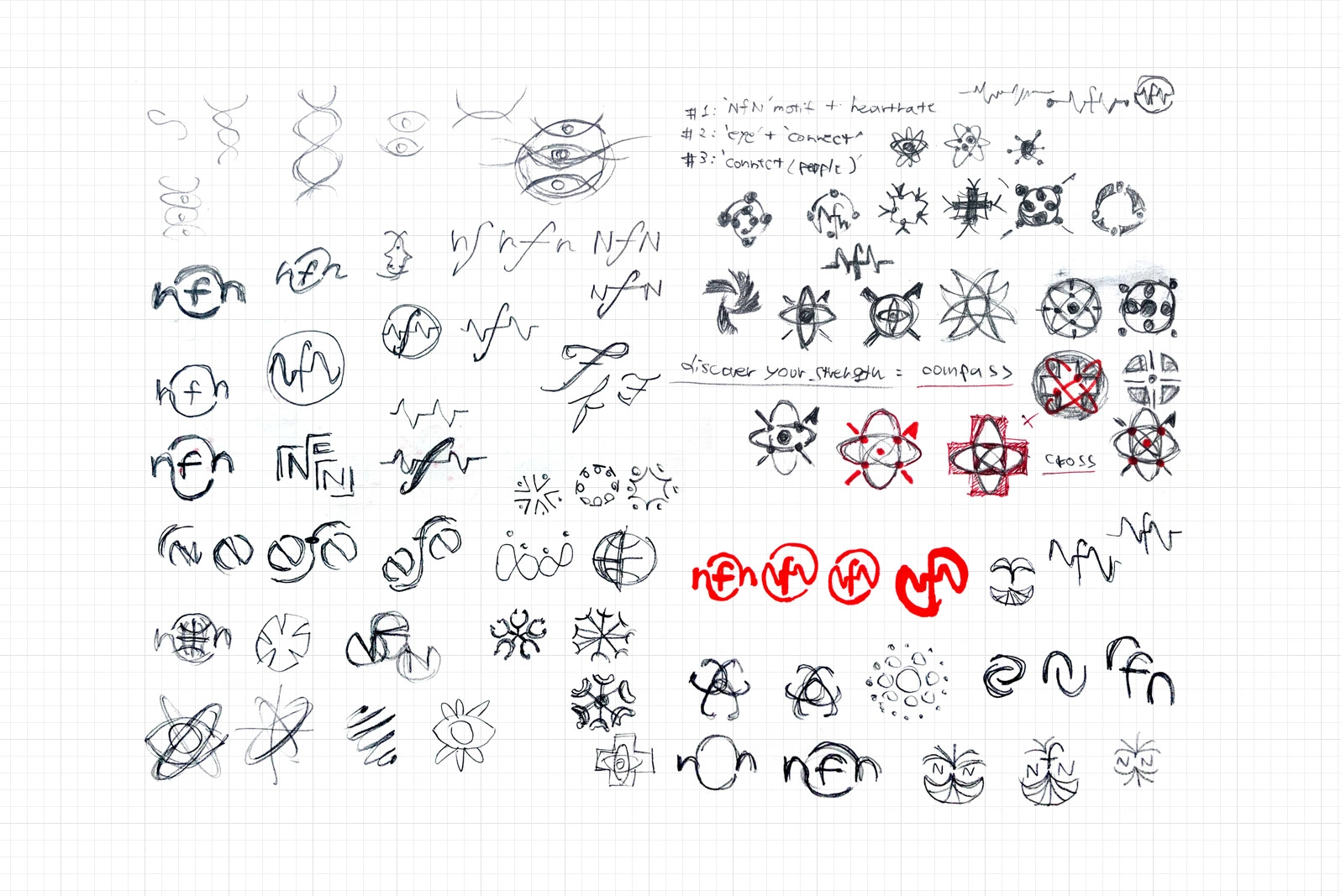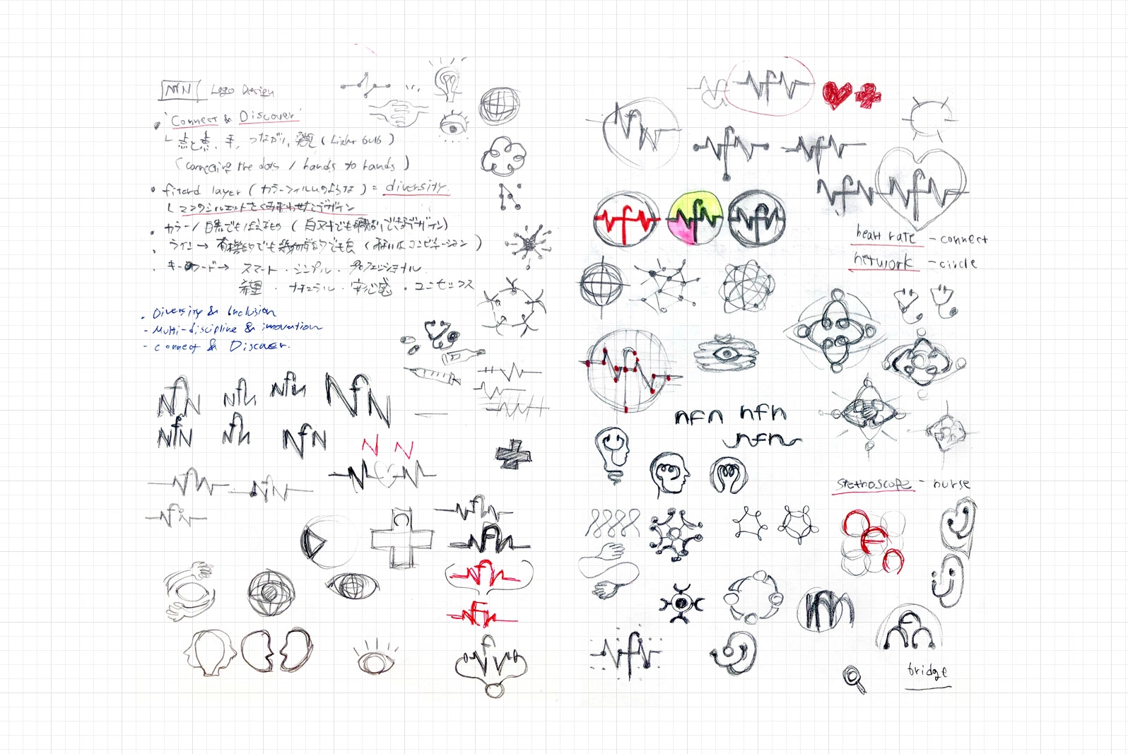 After some discussion, we settled on one design sketch based on the concept of connecting nurses across the globe(as circle / community) through the dots(as nurses) in tip points of the alphabet letters 'NfN', and raising up with the whole community.