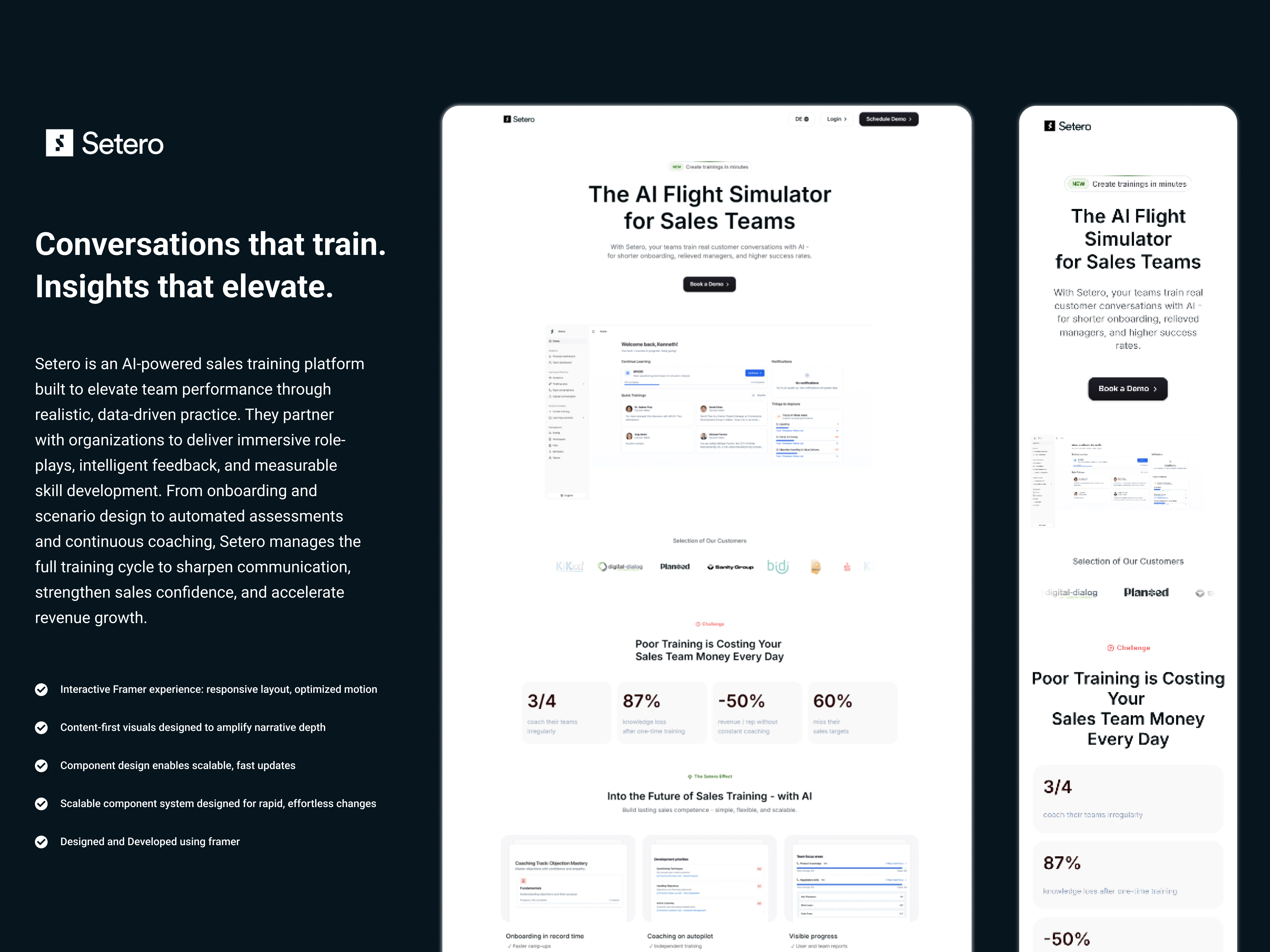 Setero is an AI-powered sales training platform. The client already had a Framer website but faced multiple functional issues, inconsistent responsiveness, and needed new sections aligned with updated product positioning. My role was to refine the existing build, fix broken components, and redesign key sections while maintaining the original brand direction.