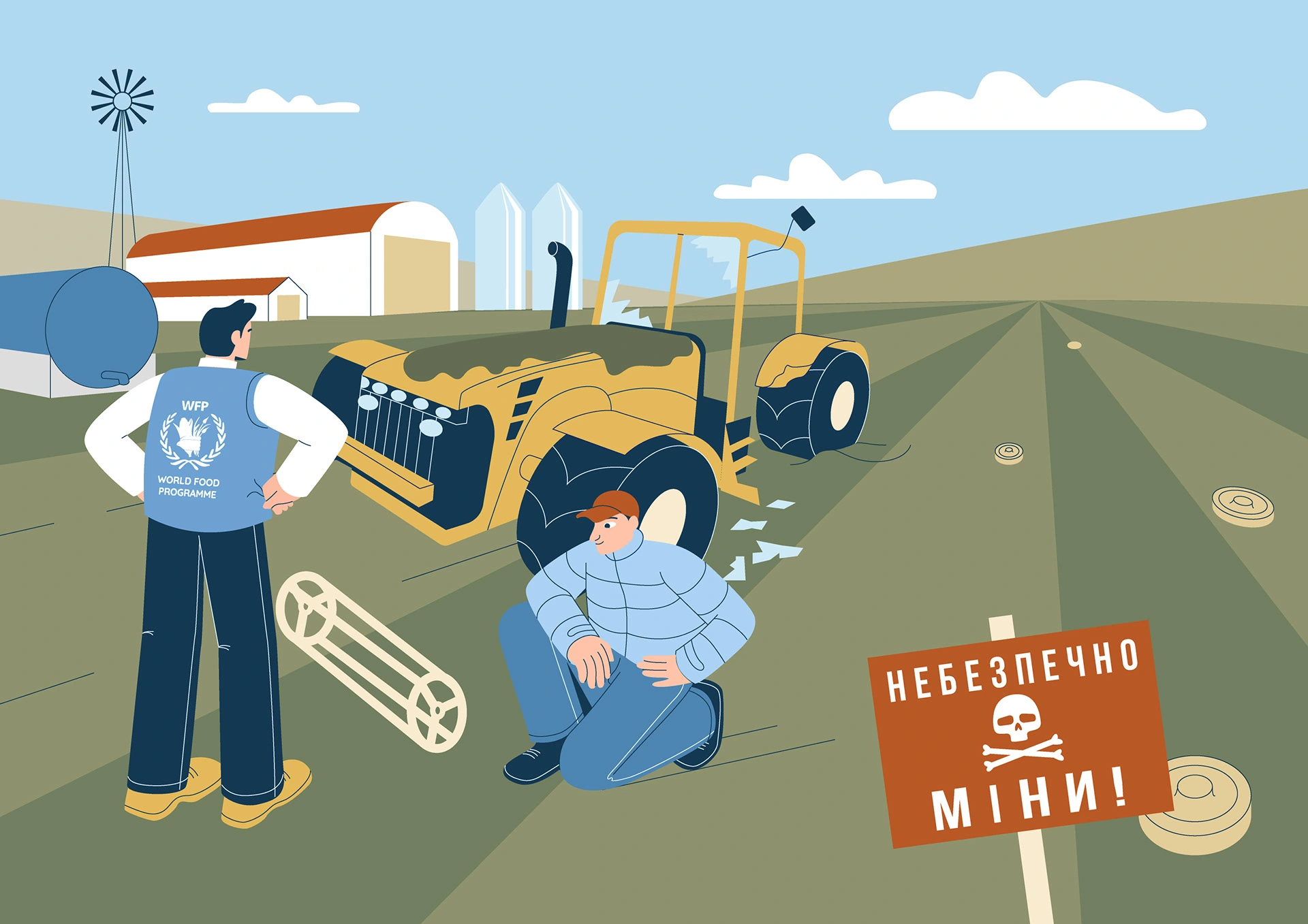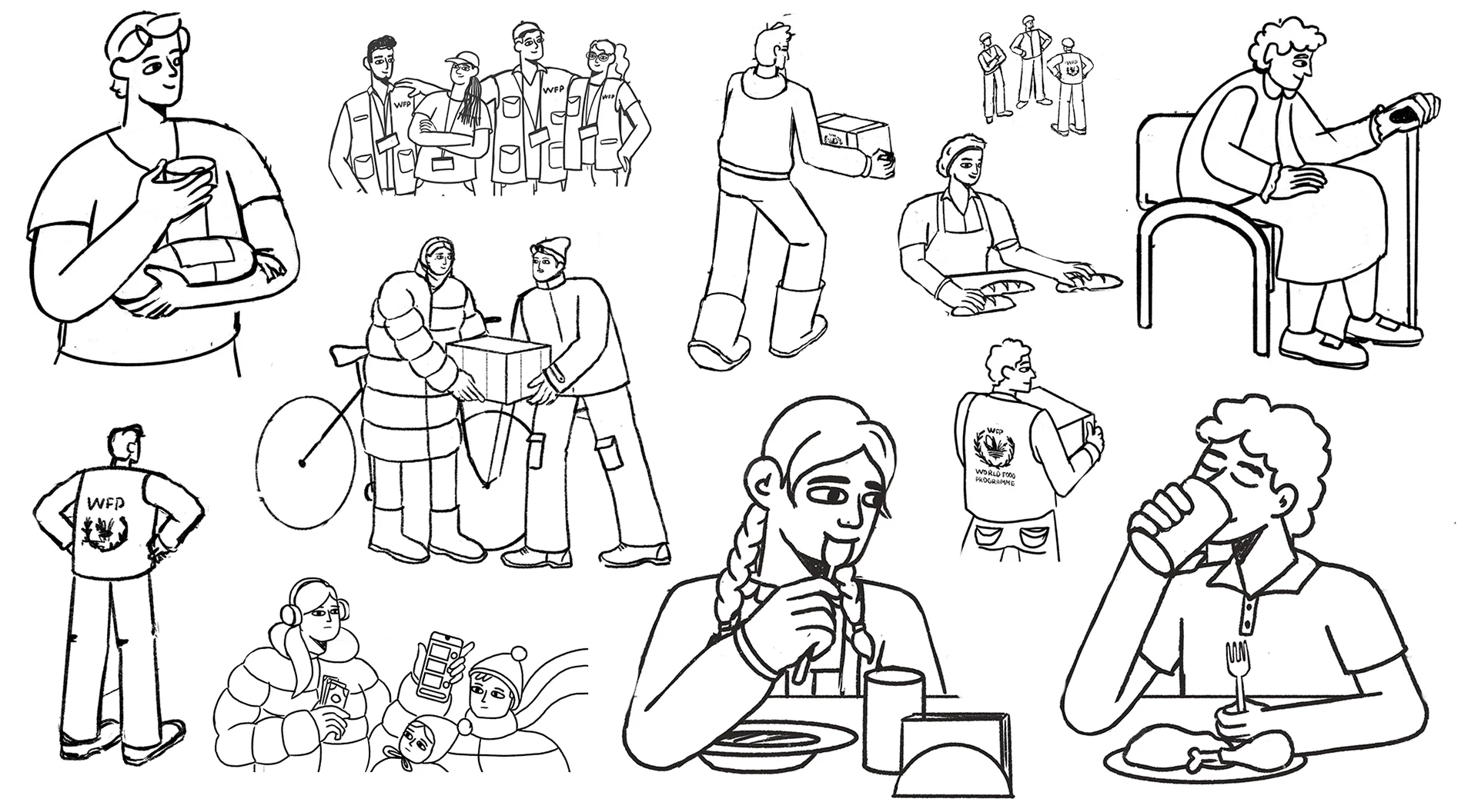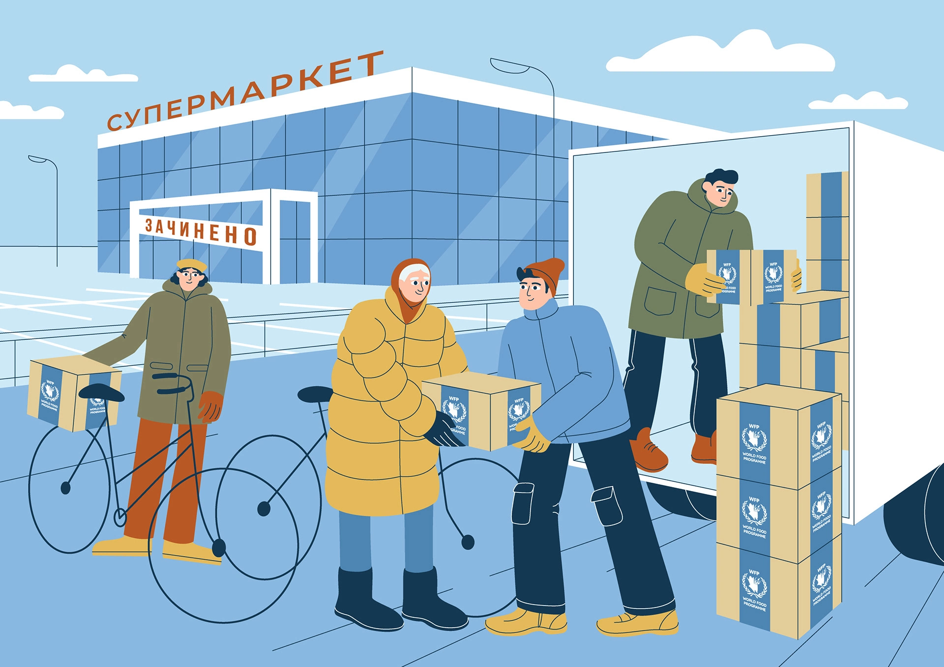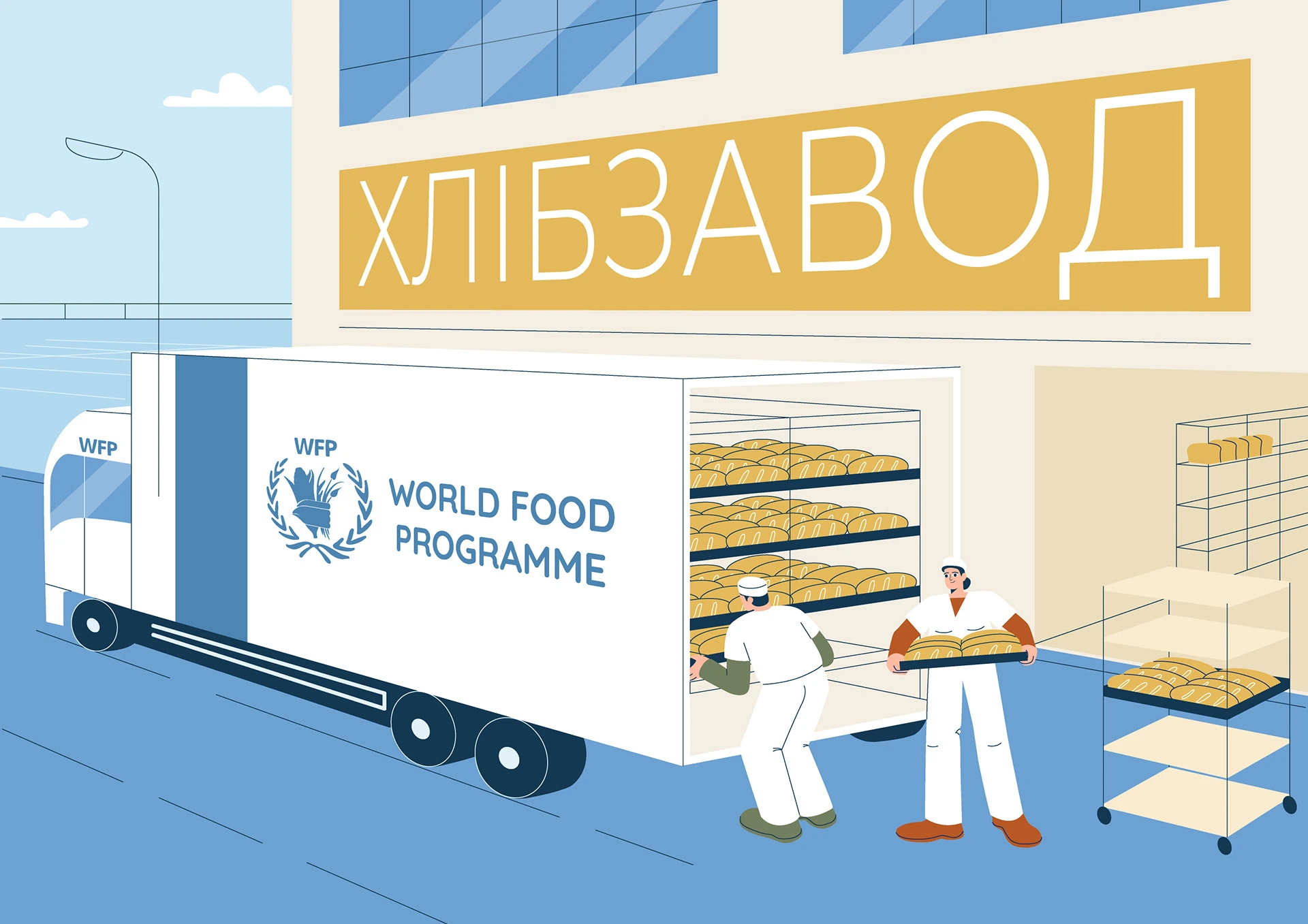 Series of Illustrations for the UN World Food Programme Ukraine about their activities during Russia’s war on Ukraine, like food aid to front-line cities, financial aid to displaced persons and war victims, Grain from Ukraine initiative, school meals, cooperation with bread factories, and much more.