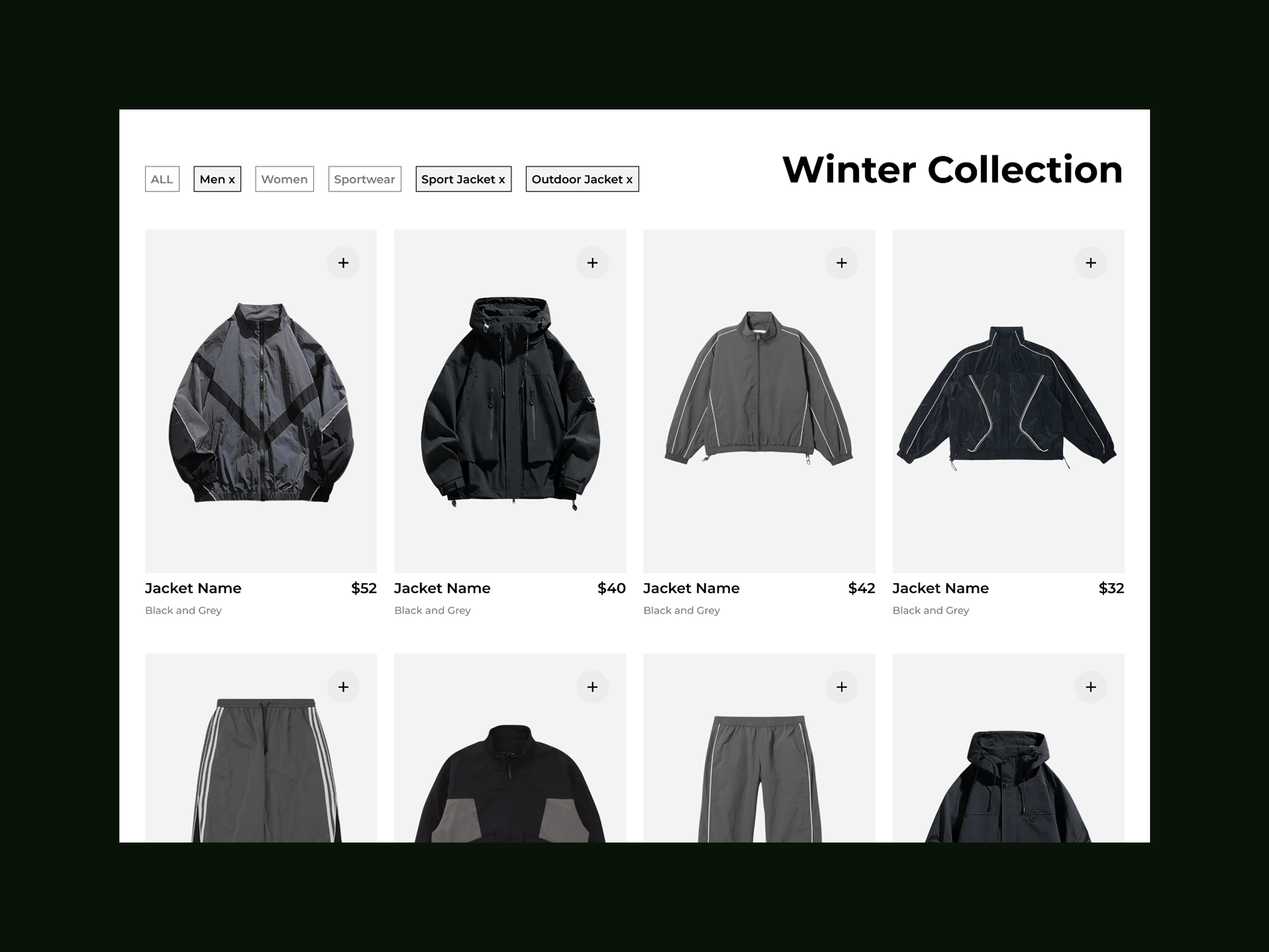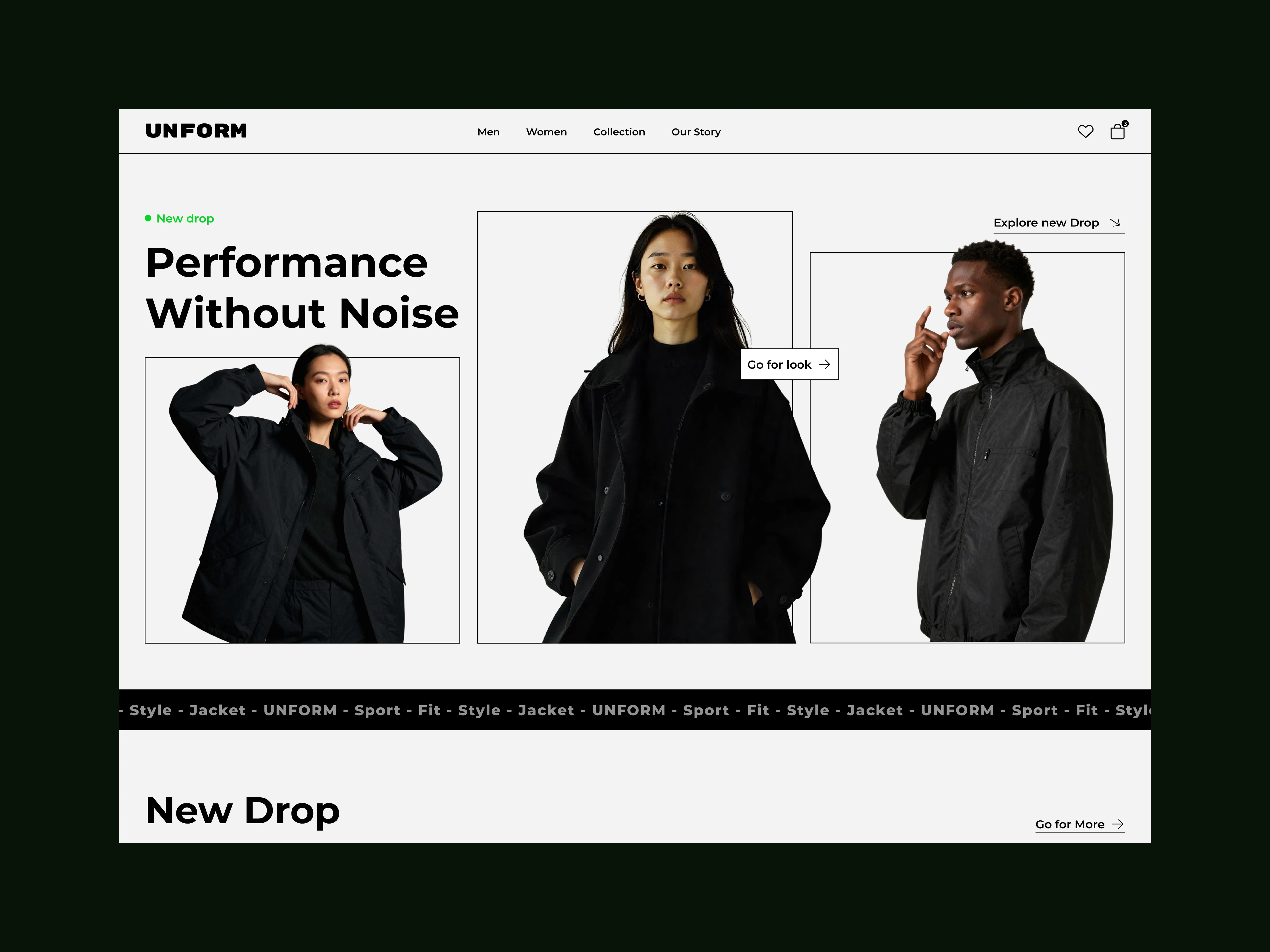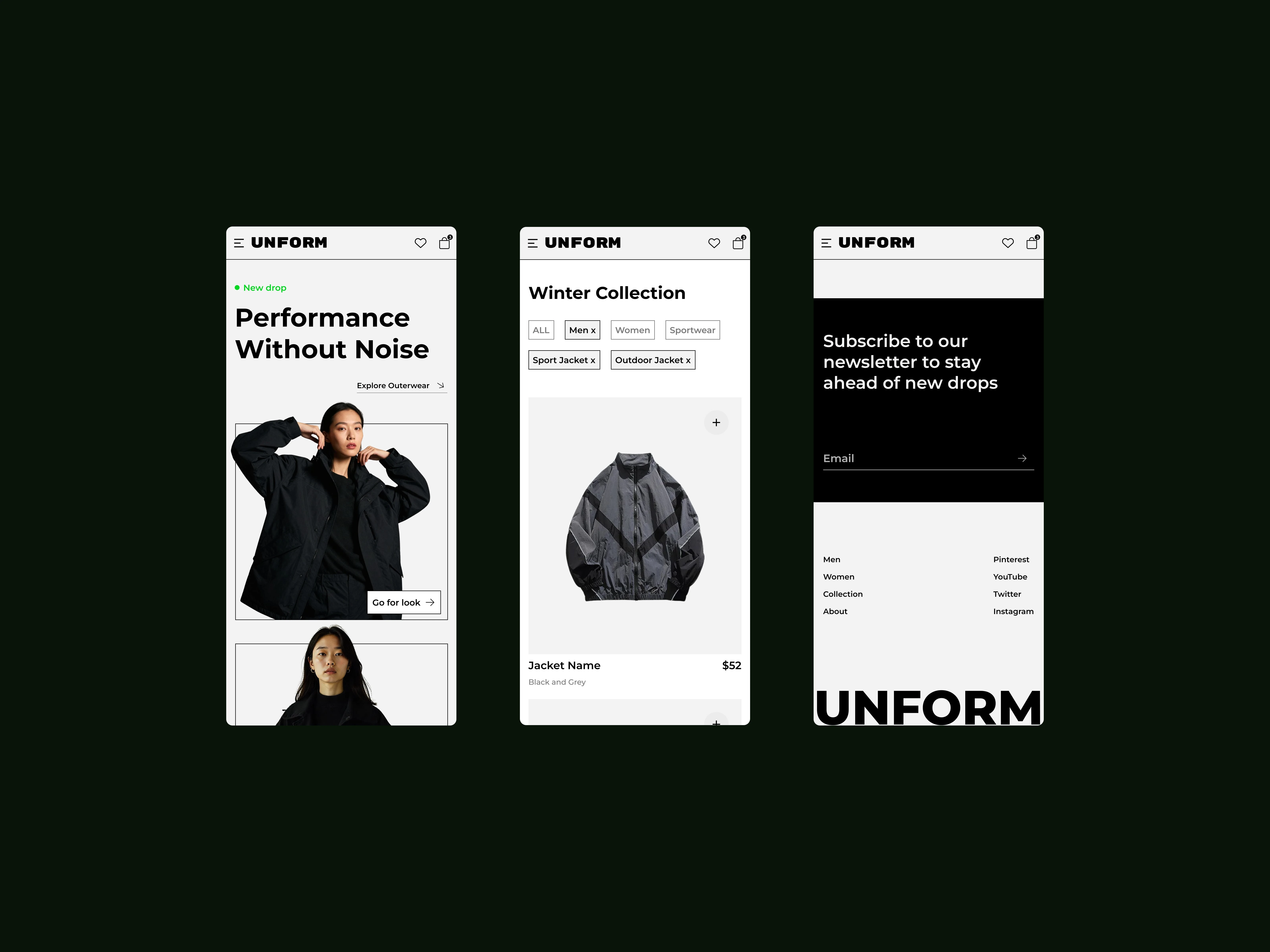The experience centers around a focused e-commerce flow for performance and outerwear products, balancing strong visual identity with functional shopping behavior. Product discovery, detail pages, and checkout are treated as a single continuous journey rather than separate moments. The structure supports both brand presence and purchasing without letting either dominate.