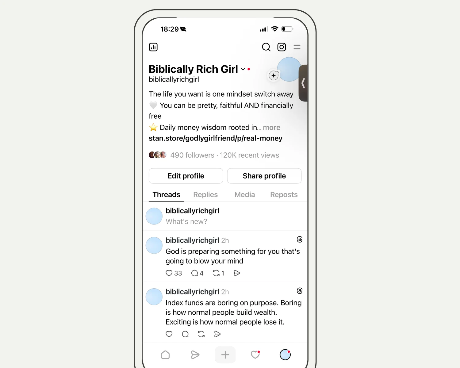 This is the story of two content brands built on Threads from scratch using the same growth methodology. Godly Girlfriend (faith-based relationships) grew to 15K+ followers and over 1M monthly impressions. Biblically Rich Girl (faith-based financial literacy) hit 120K views in its first 30 days. Both connect to digital product ecosystems where audience growth turns into actual revenue.