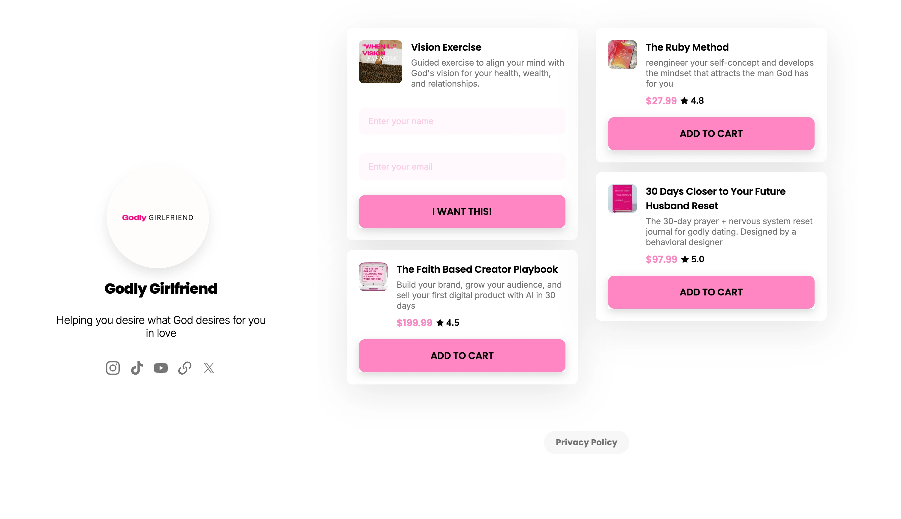 Godly Girlfriend: 15K+ followers, 1M+ monthly impressions, multiple products selling through Stan Store.