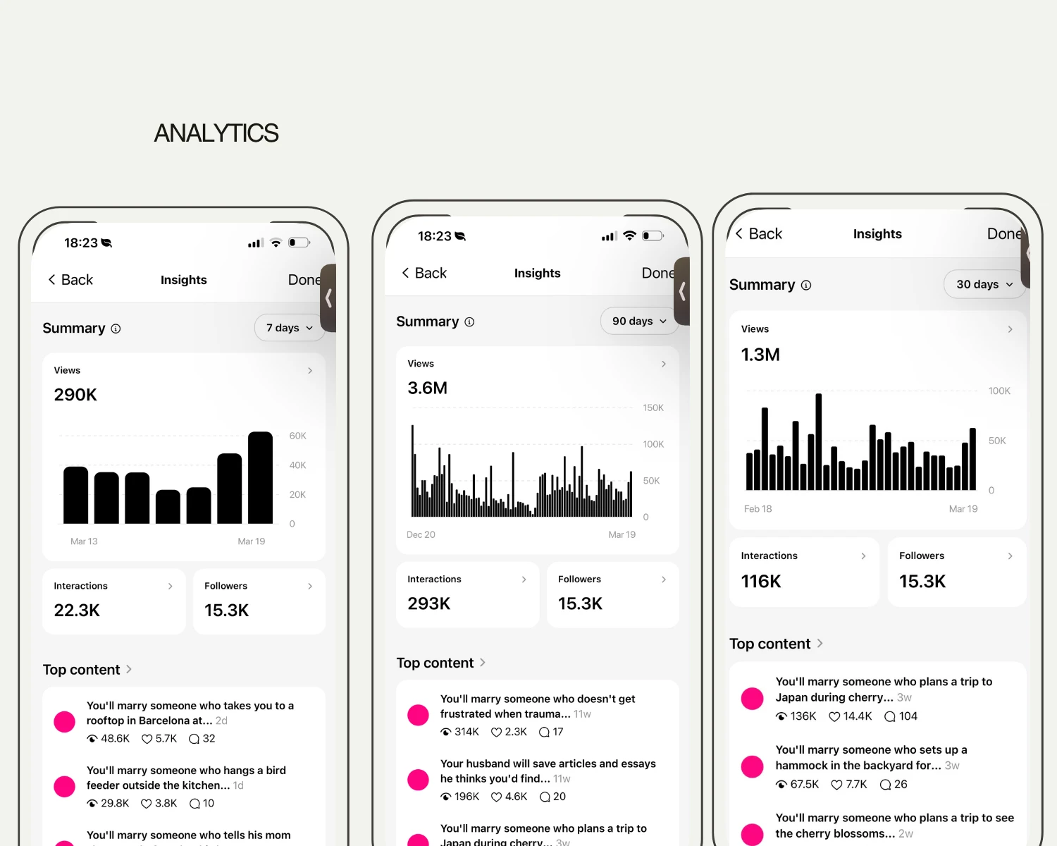 The data told a clear story. One format outperformed everything else by a wide margin: “You’ll marry someone who…” posts. It was driving the vast majority of reach, saves, and shares. From there, the whole content system got built around that finding. Three pillars (Healing, Hopeful, Helpful Words) to keep things varied, with the signature format as the anchor.