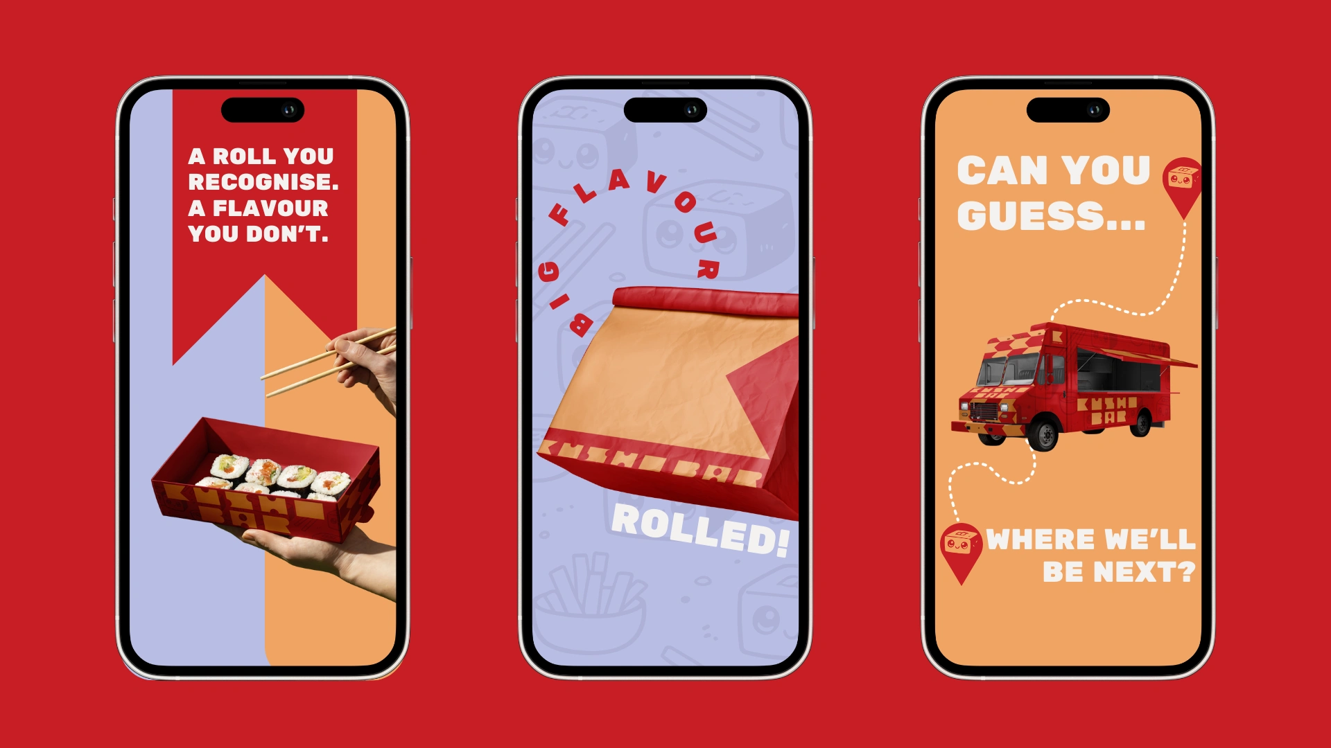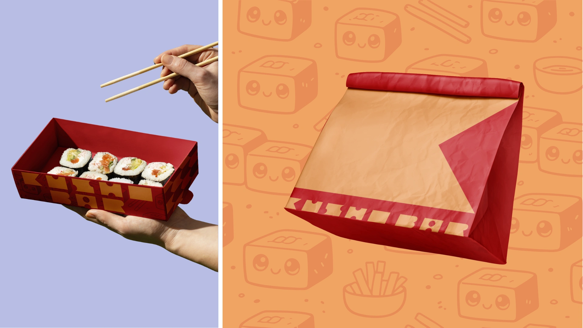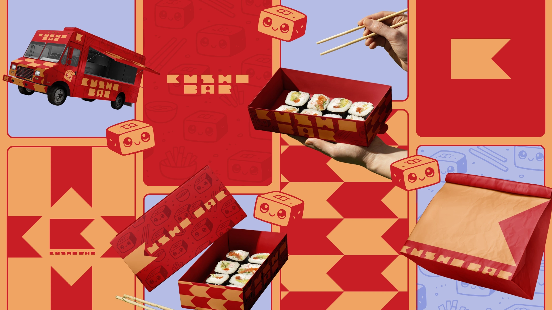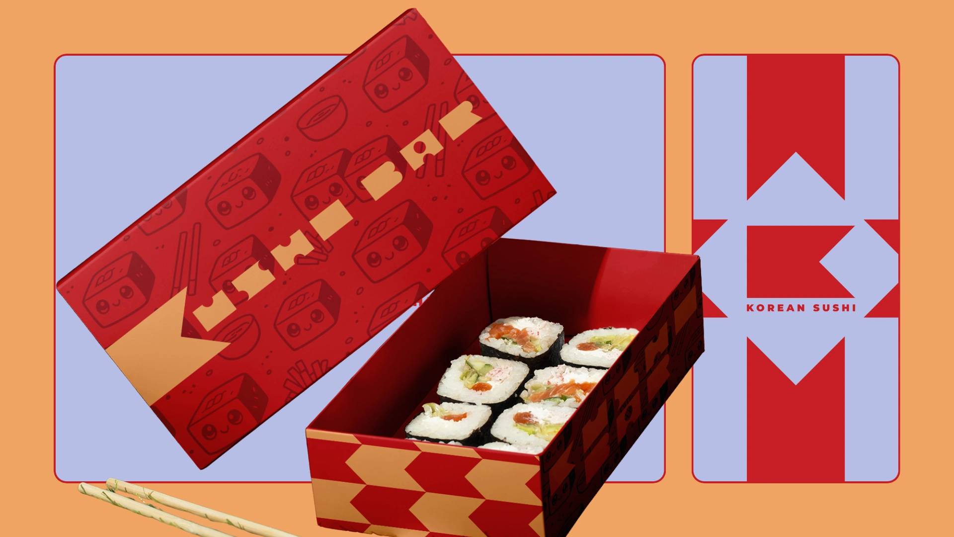 At the heart of the identity is a small mascot. A box-shaped kimbap roll that blends the food and the packaging into one simple character. Part roll, part takeaway box, it becomes a visual anchor for the brand, playful without being childish, memorable without needing explanation. It brings warmth and personality to the system while reinforcing the idea that this is food made to be grabbed, carried, and enjoyed.