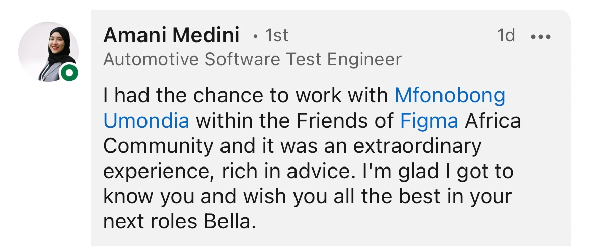 Mfonobong led 40+ advocates as Regional Lead for Friends of Figma Africa, scaling engagement, mentorship, and events for a 5,000+ member design community.