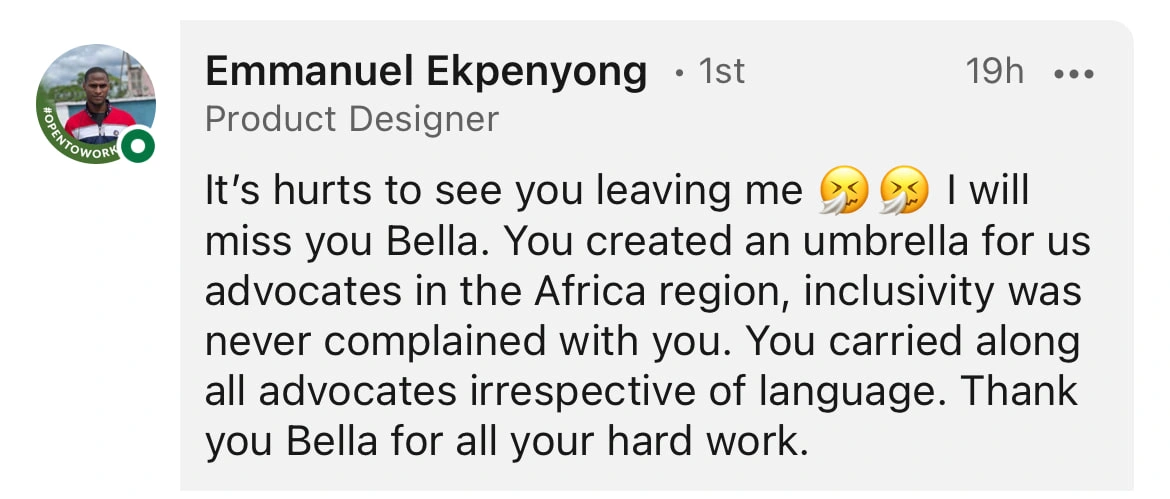 Connecting with the Community: I coordinated advocates across English, French, and Swahili-speaking communities, ensuring that everyone felt represented and included. I also onboarded new advocates and maintained close communication to understand community needs.