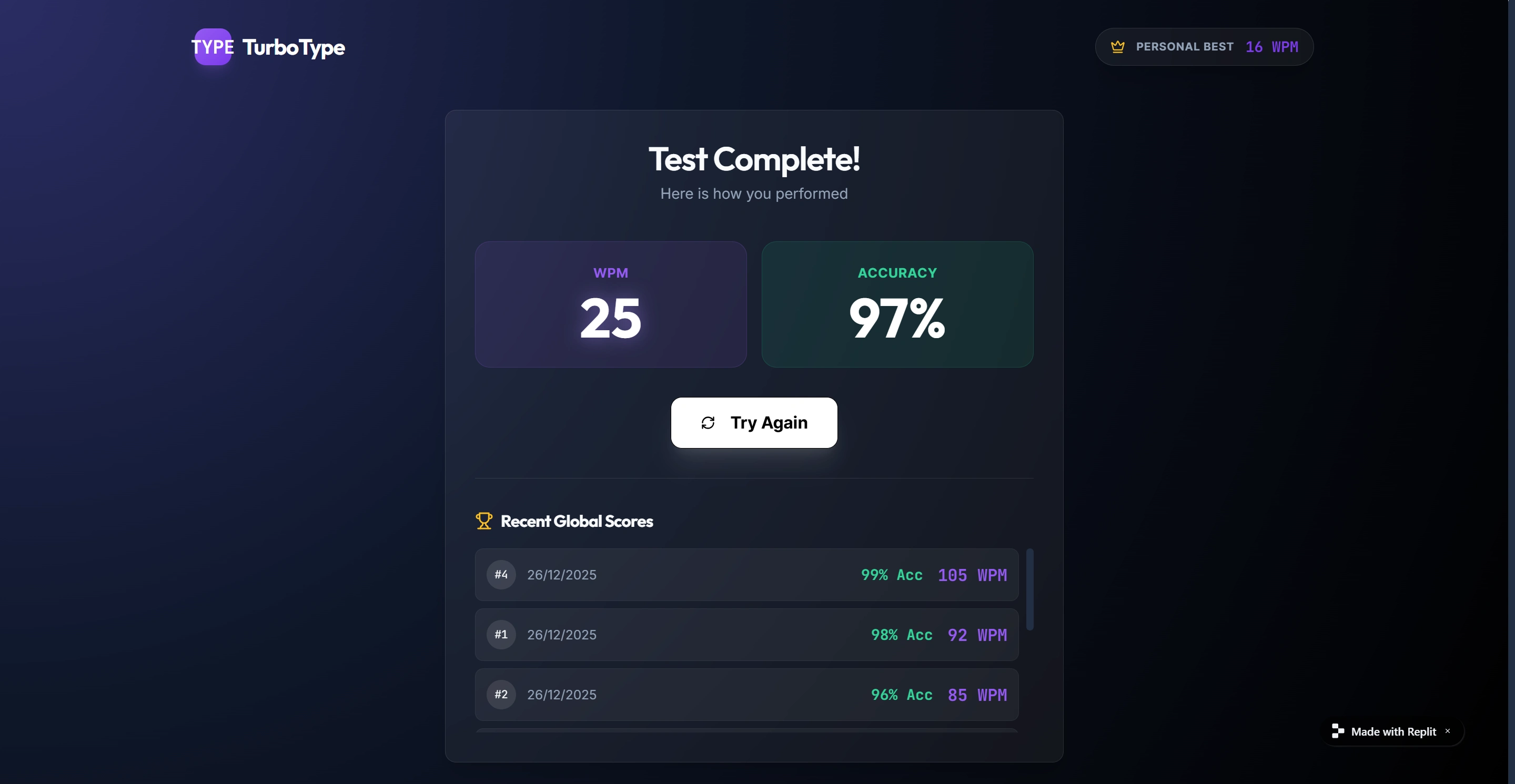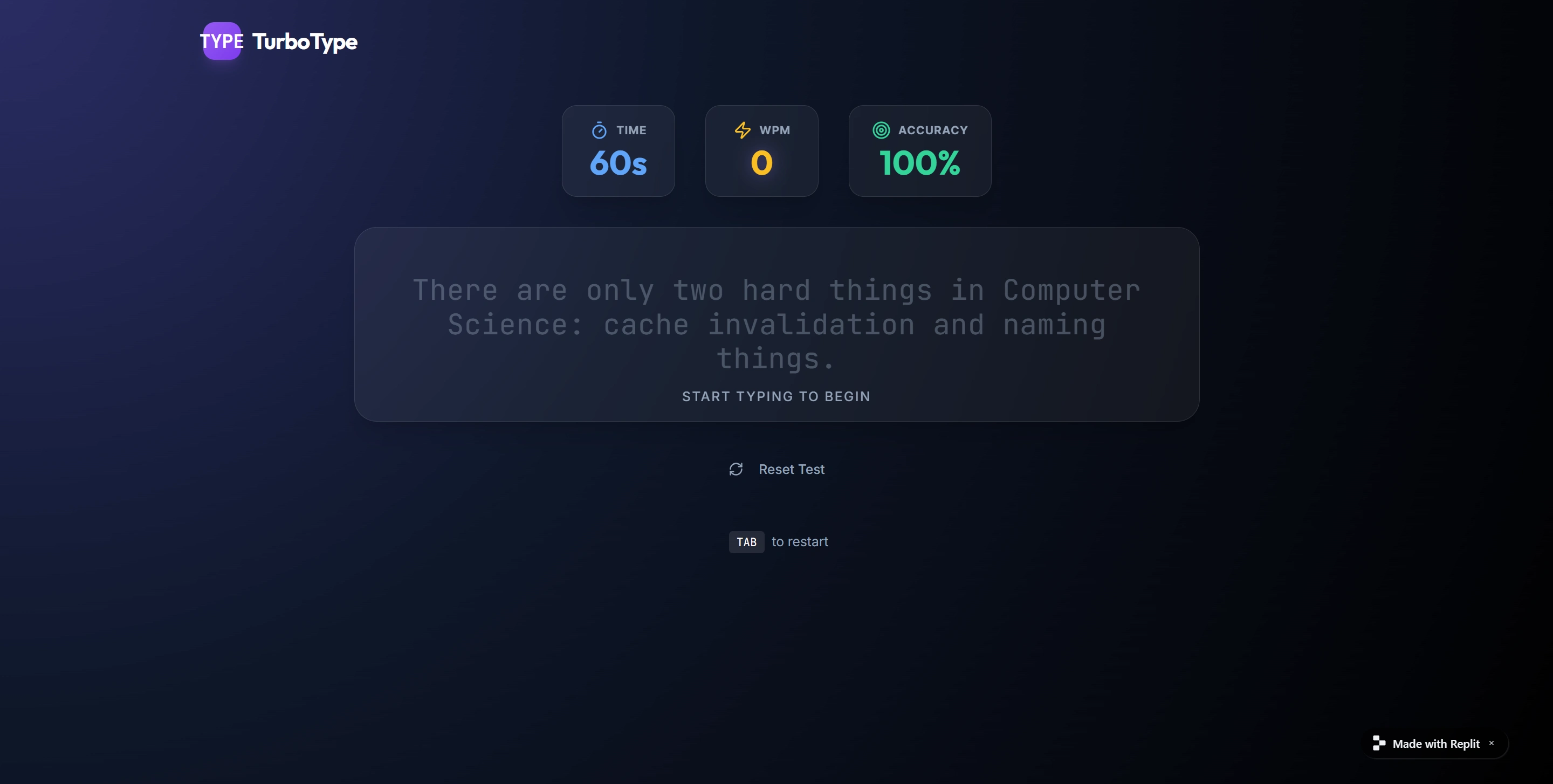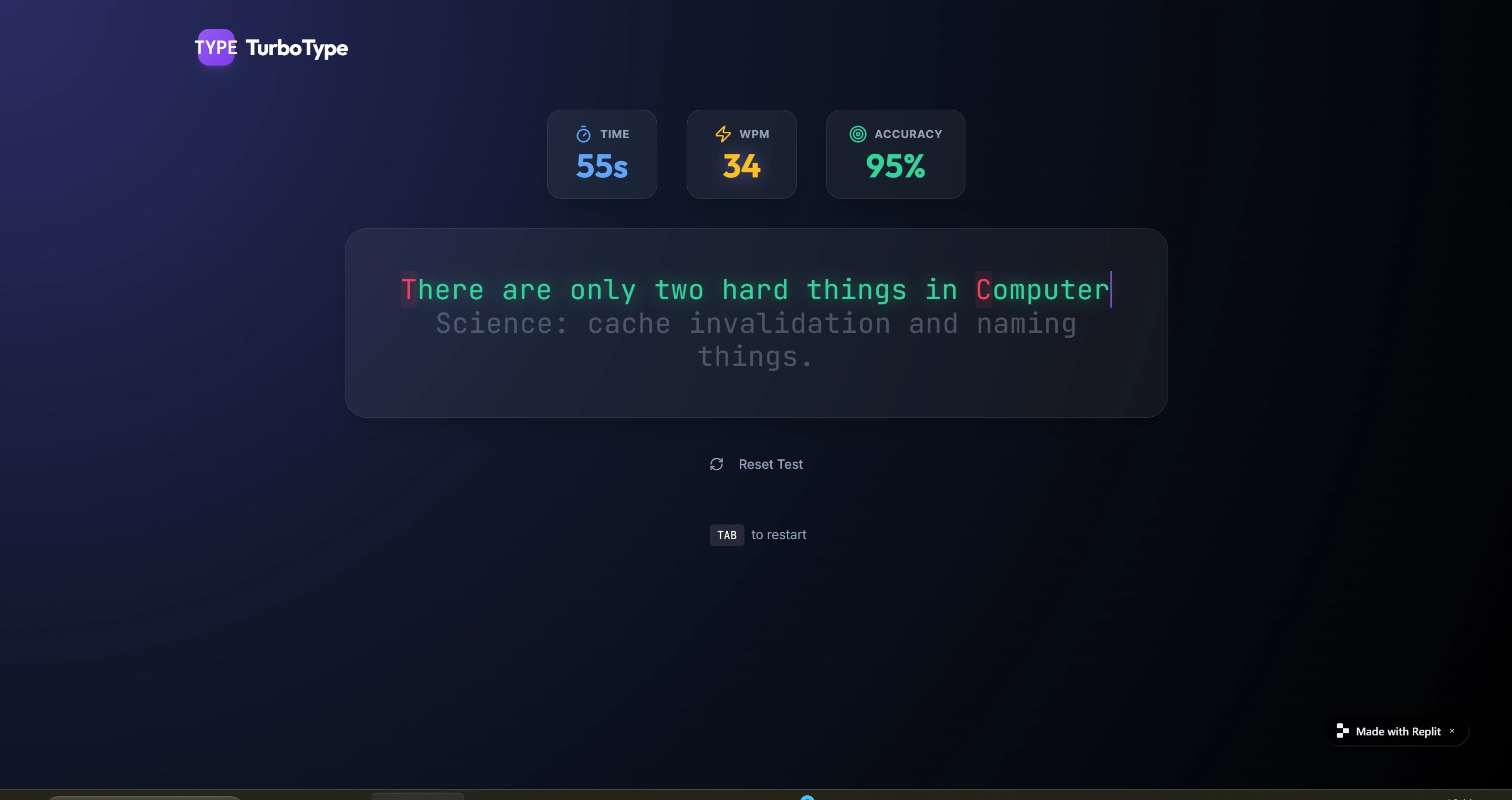 Built "TurboType" - a sleek, modern typing speed test game featuring real-time performance tracking, competitive leaderboards, and smooth animations. The application transforms the mundane task of typing practice into an engaging challenge with instant feedback and social comparison features.