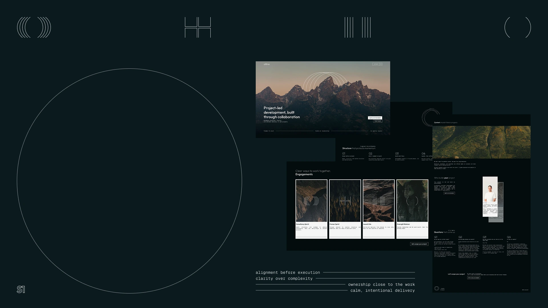 I run the studio solo, collaborating directly with clients and, when needed, with their internal teams or trusted external specialists. The goal was not to create a portfolio site, but a clear articulation of a work model built around alignment, ownership, and calm delivery.