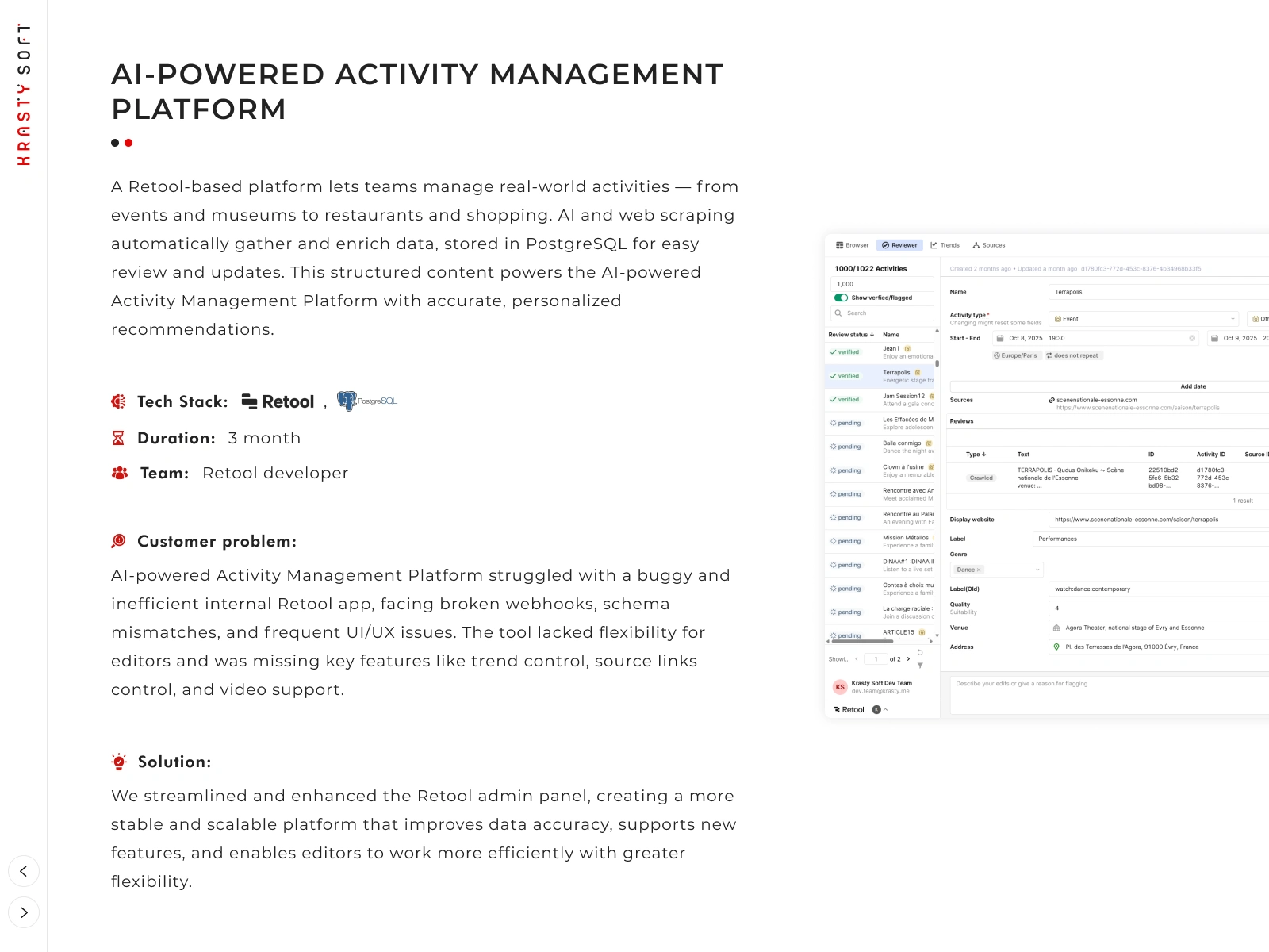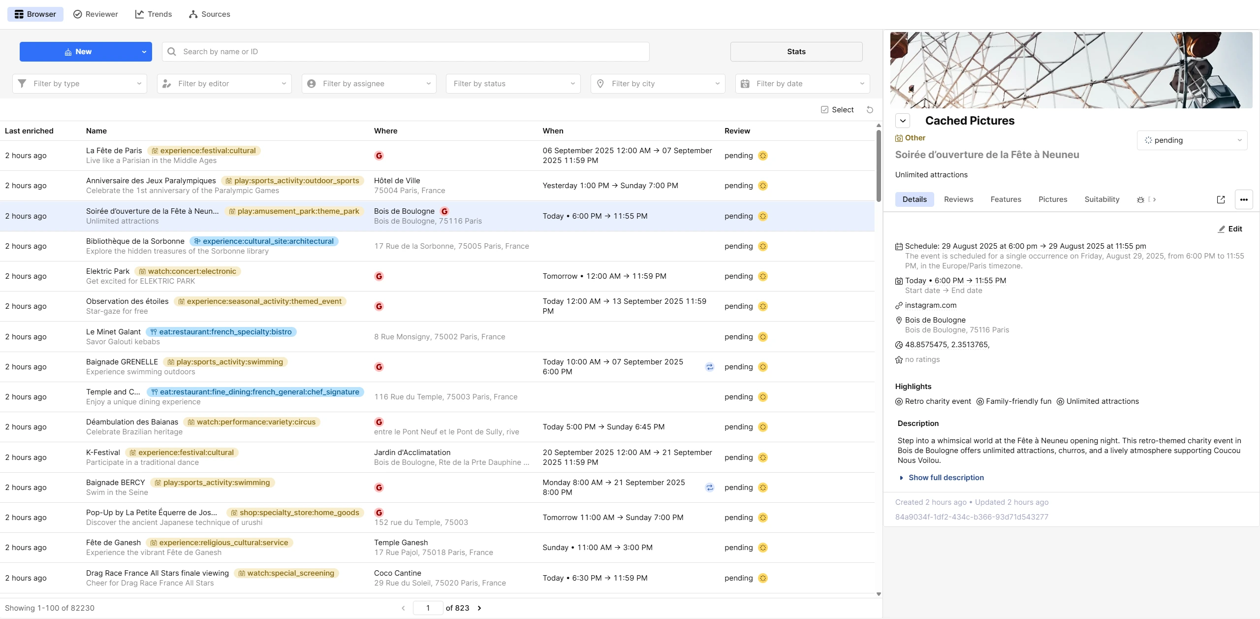 The platform automatically gathers activity data from multiple sources using AI and web scraping, fills missing details, and stores everything in a structured way. Editors can easily validate, update, and manage content through a flexible admin interface, ensuring high data quality and consistency. This structured content then powers a consumer mobile app with reliable, personalized recommendations.