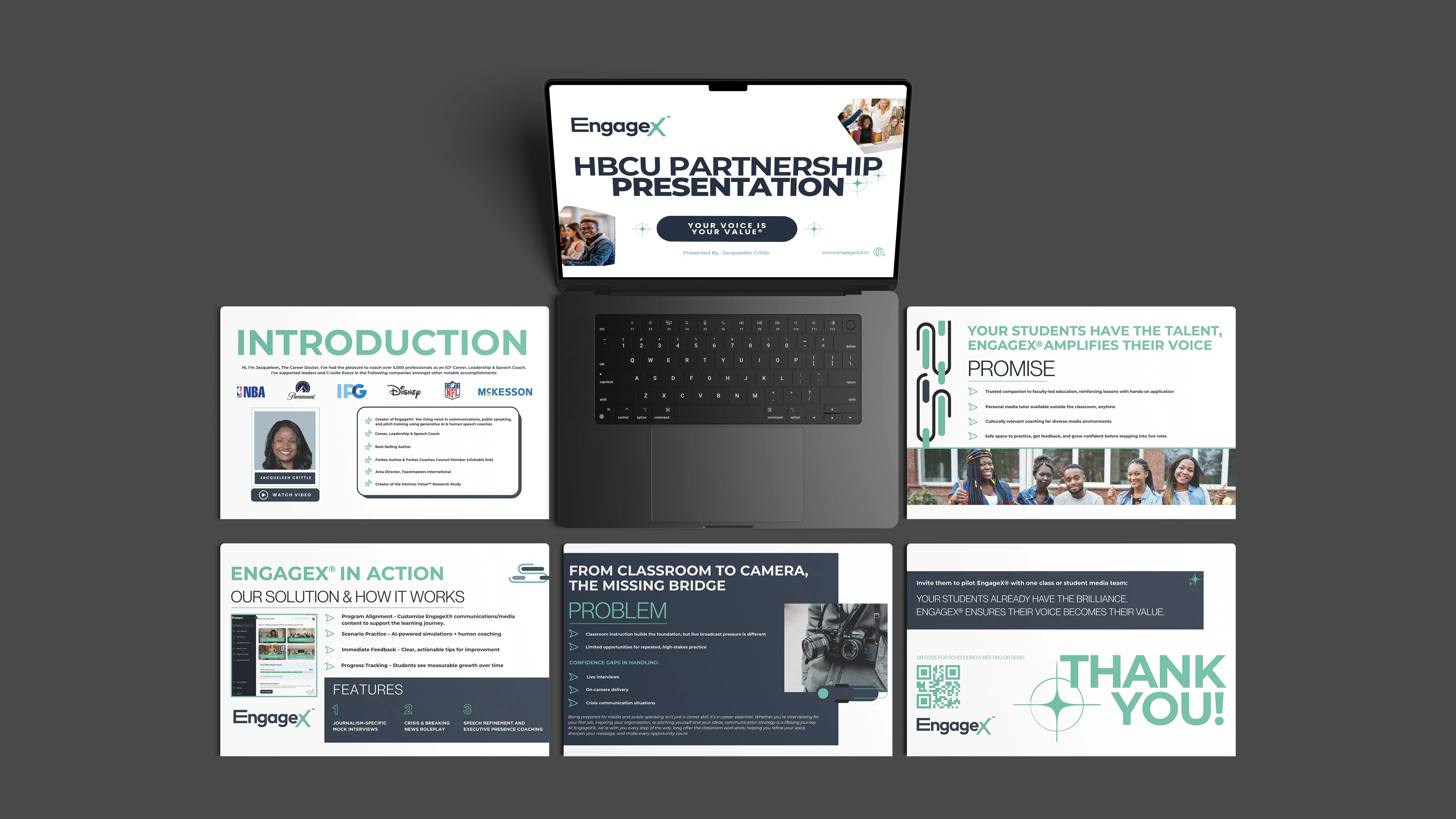Created The Pitch Deck for ENGAGEX™ to communicate value proposition and competitive edge making use of to seal deals with 10's of HBCU's