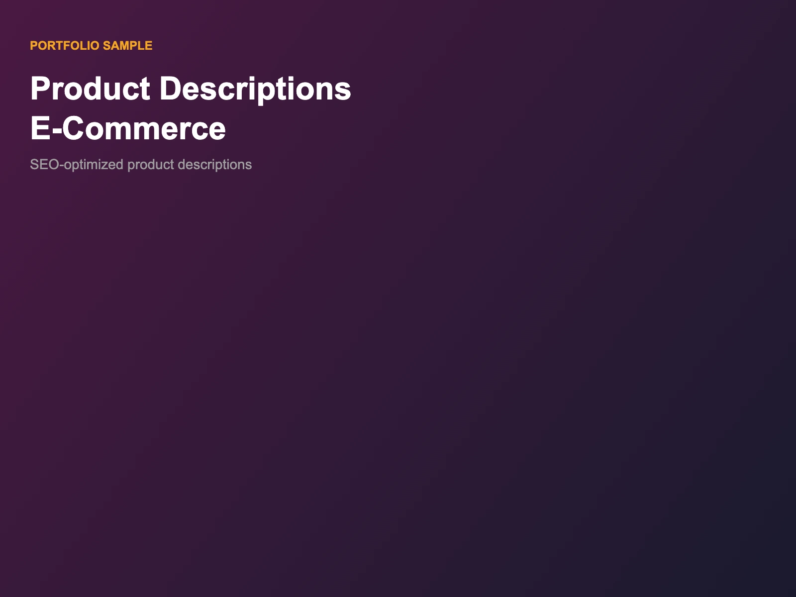 SEO-optimized product descriptions for Shopify, Amaon, and Etsy. Written to boost rankings, conversions and brand voice consistency.