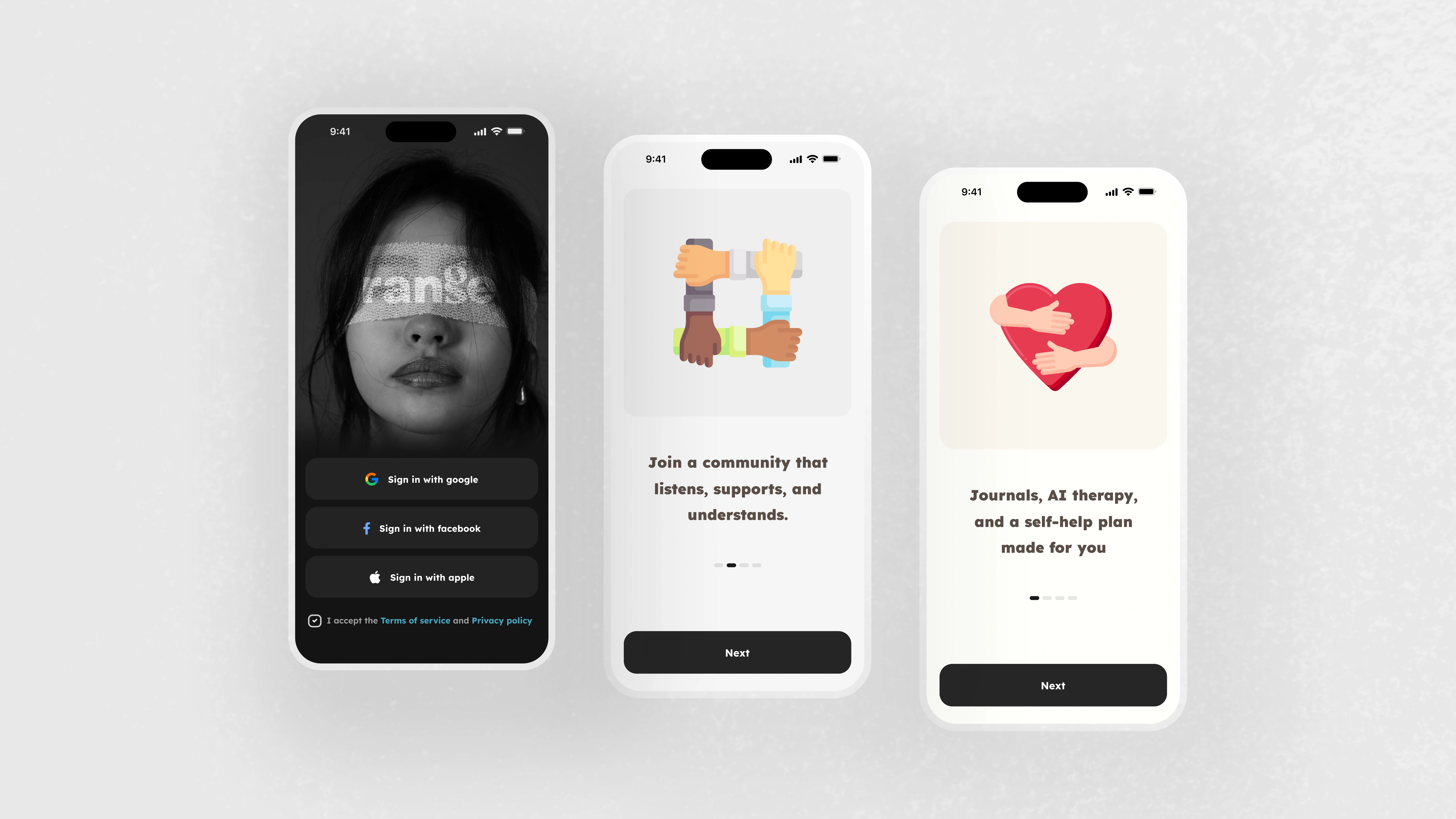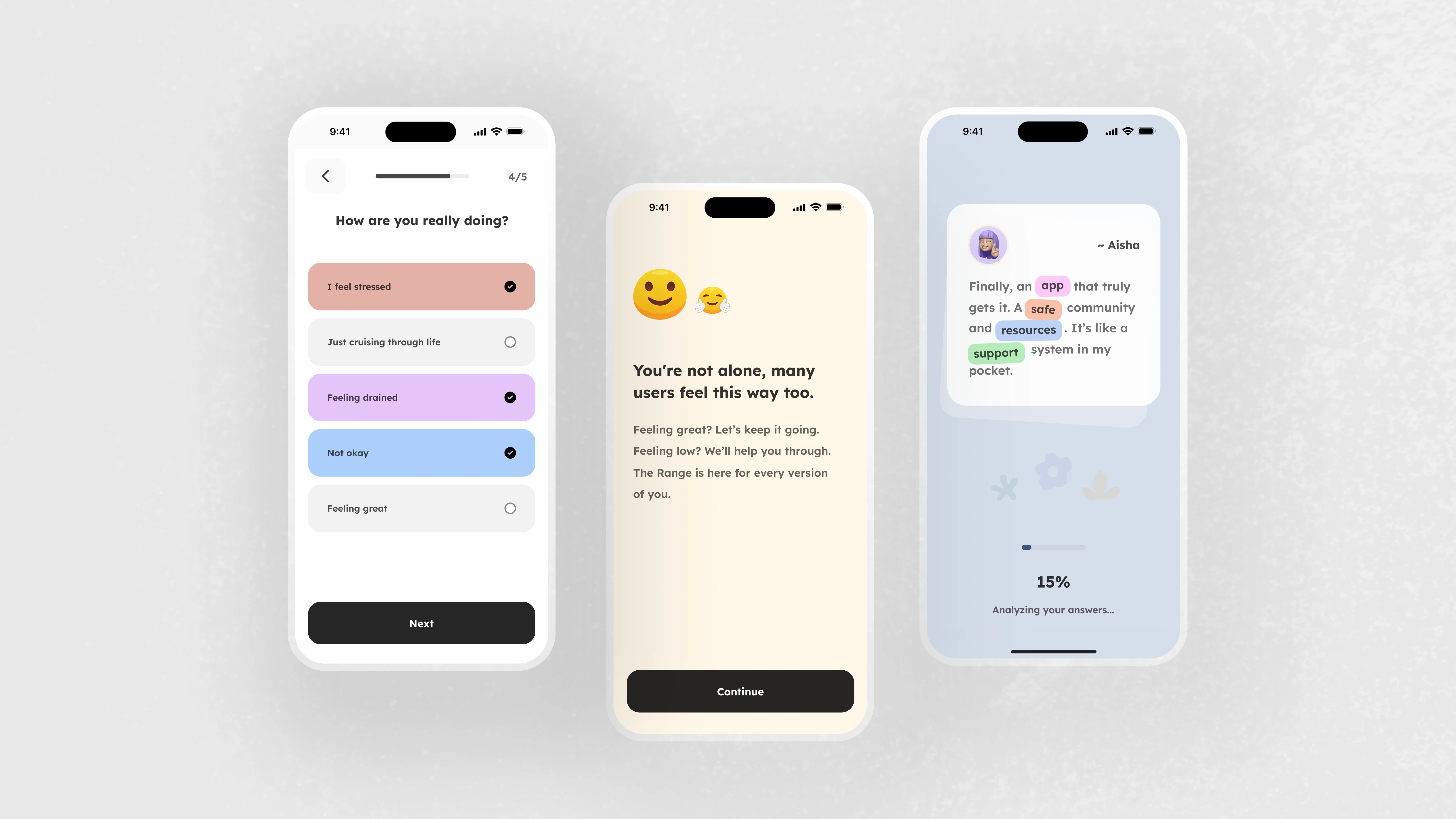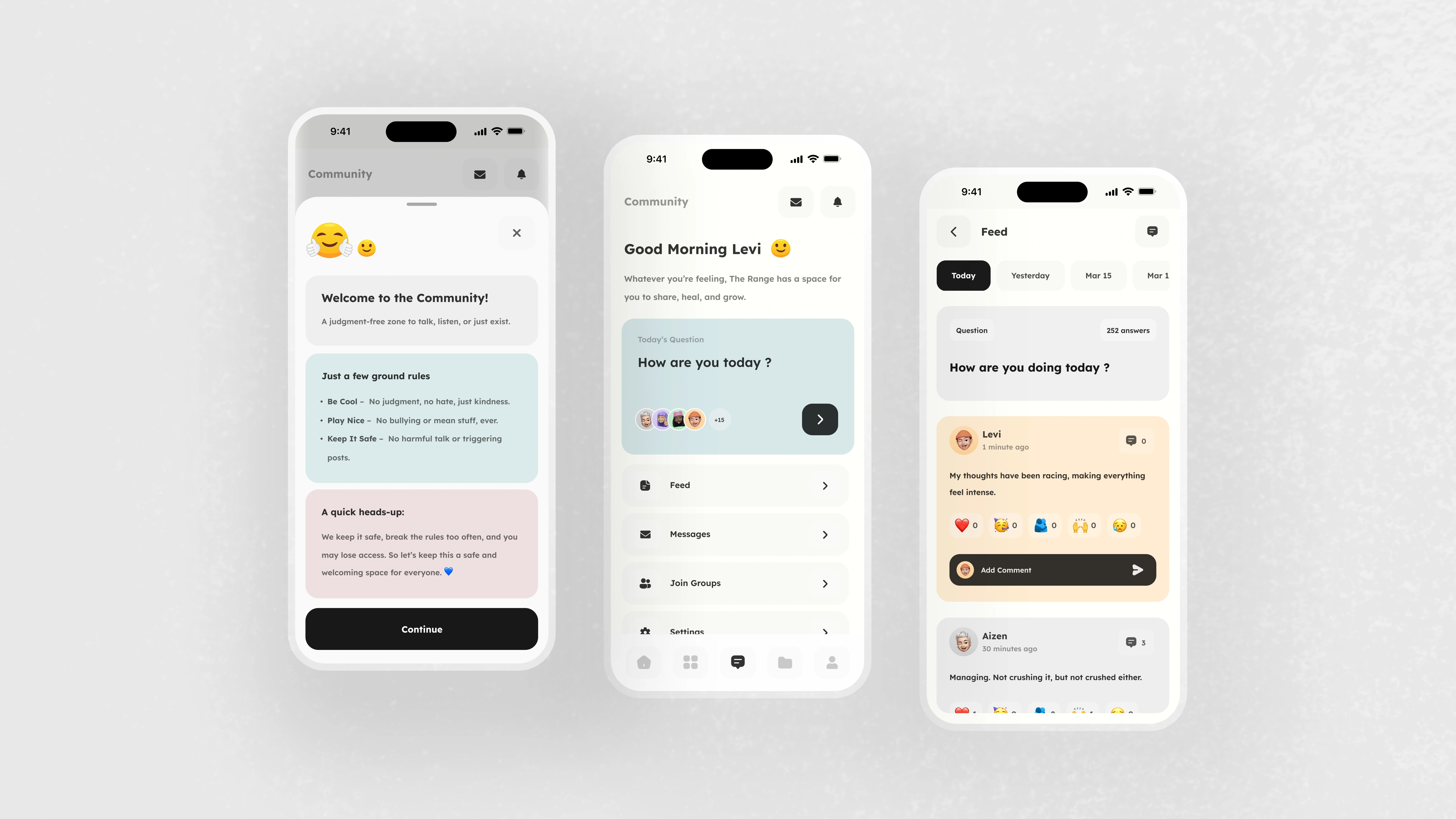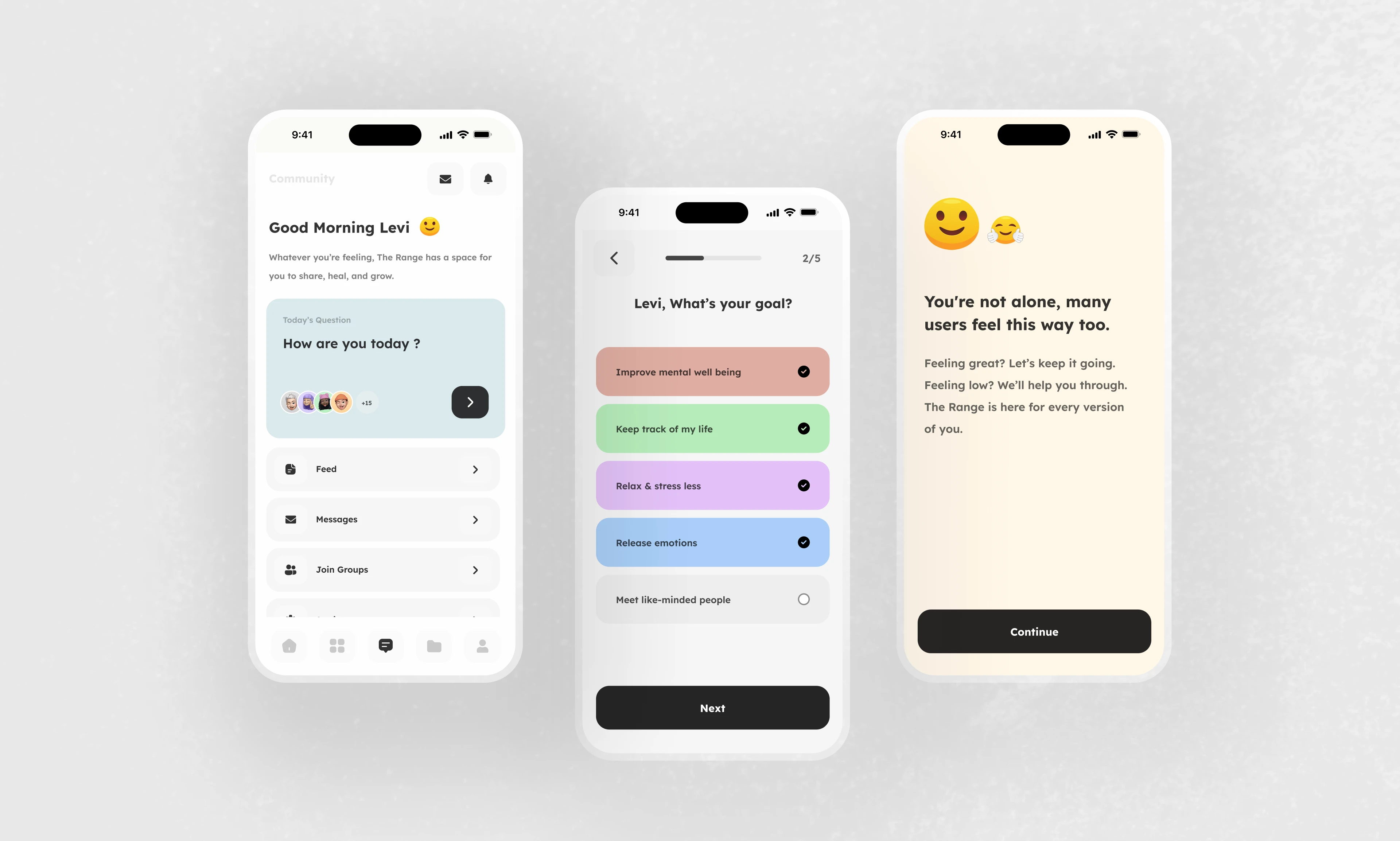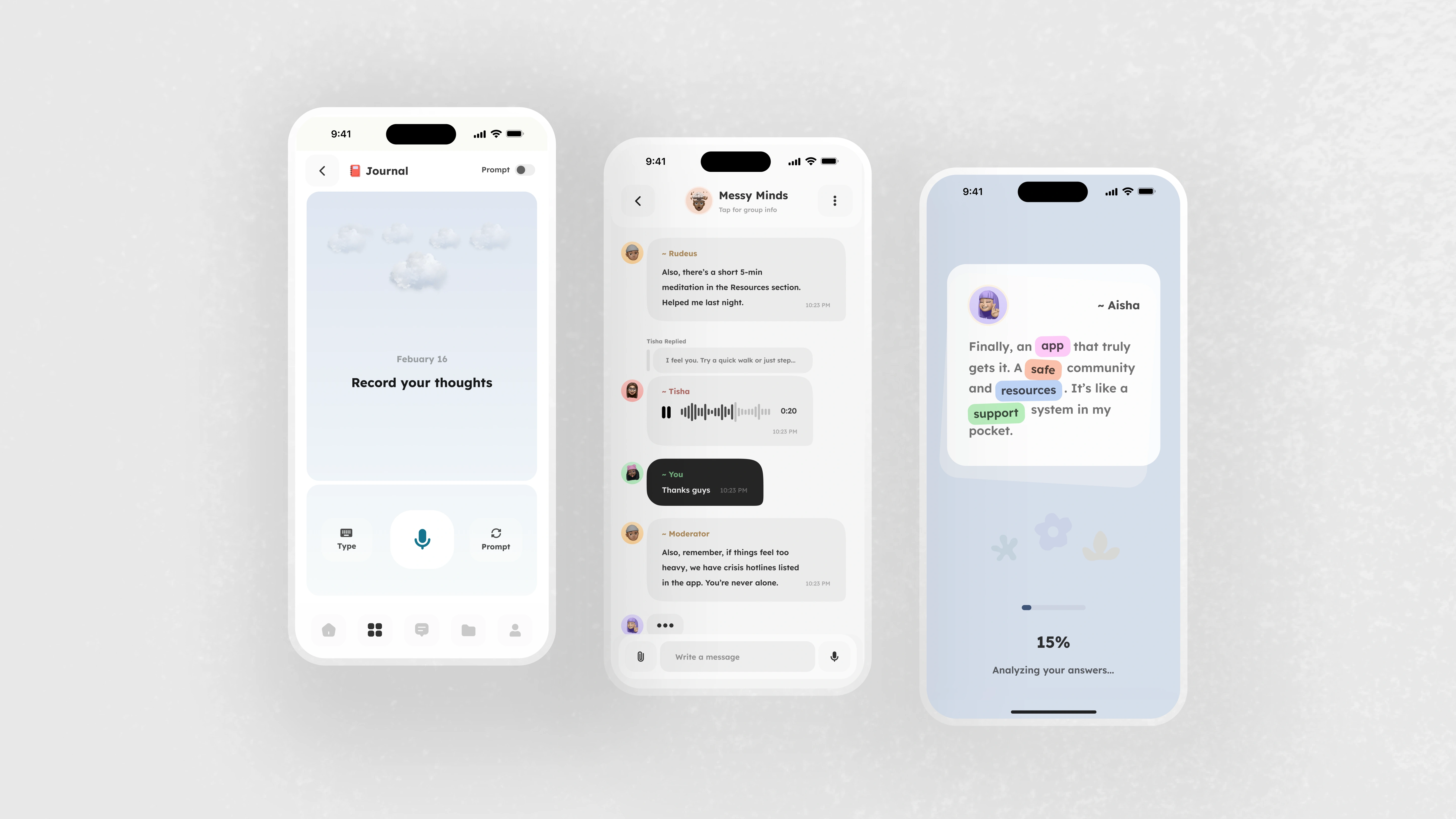 The challenge was to design an app that feels like a calm, non-judgmental companion one that guides users gently, helps them track their feelings, and offers supportive community interactions without pressure.