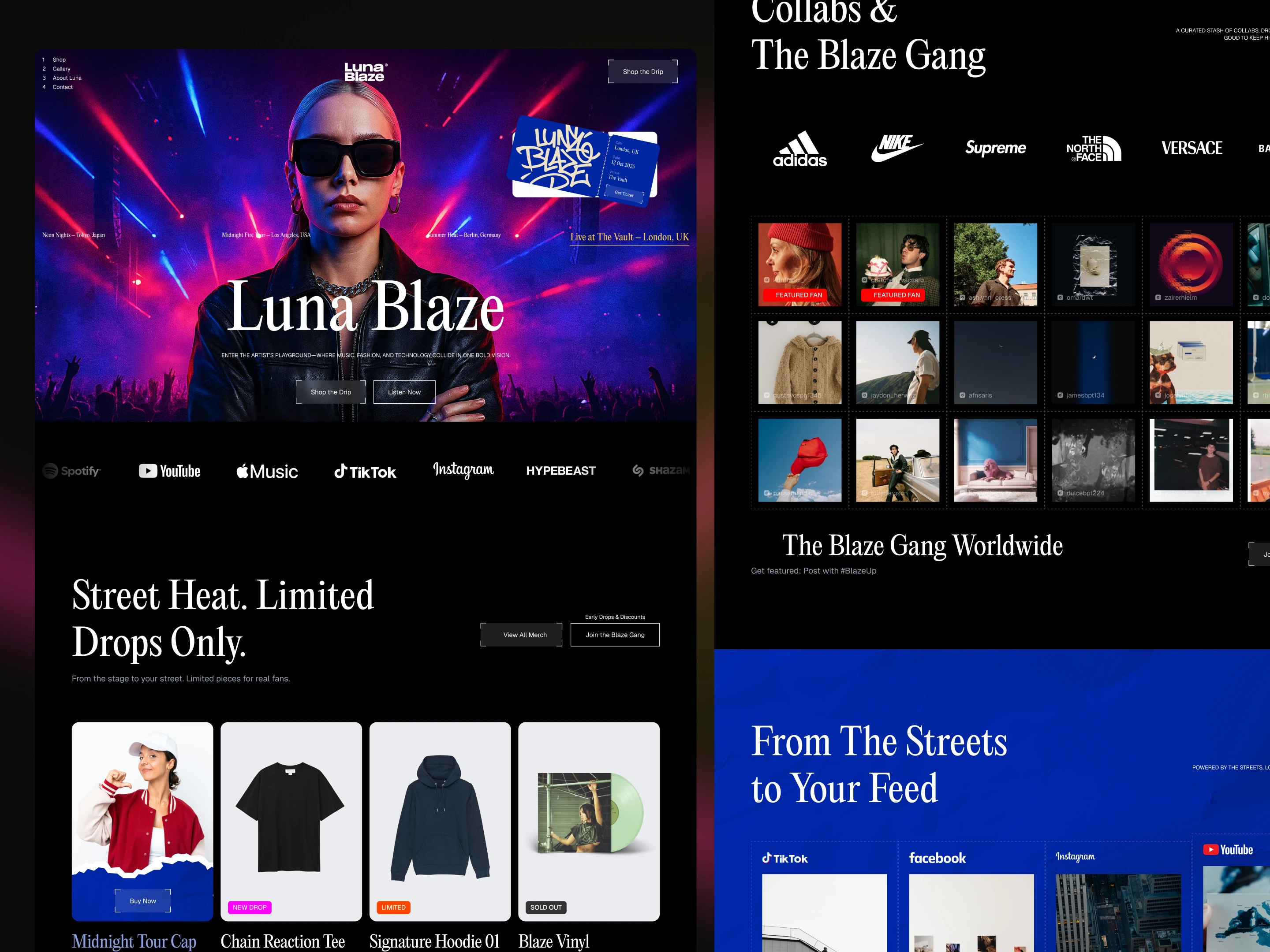 The homepage opens with a bold hero, featured merch, and a clear call to shop or explore the tour. Below that, I added sections for 2025 tour dates, brand collabs, social-style galleries, and an email call to action for early access to tickets and drops. The layout keeps everything simple to scan so fans know exactly what to do next.
