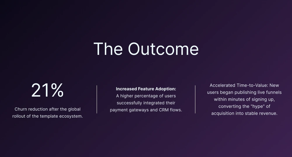 By replacing the empty editor with integrated, ready-to-use flows, we bypassed technical friction and accelerated the user's Time-to-Value. This strategic shift empowered non-technical entrepreneurs to go live instantly, resulting in significant activation and retention gains: