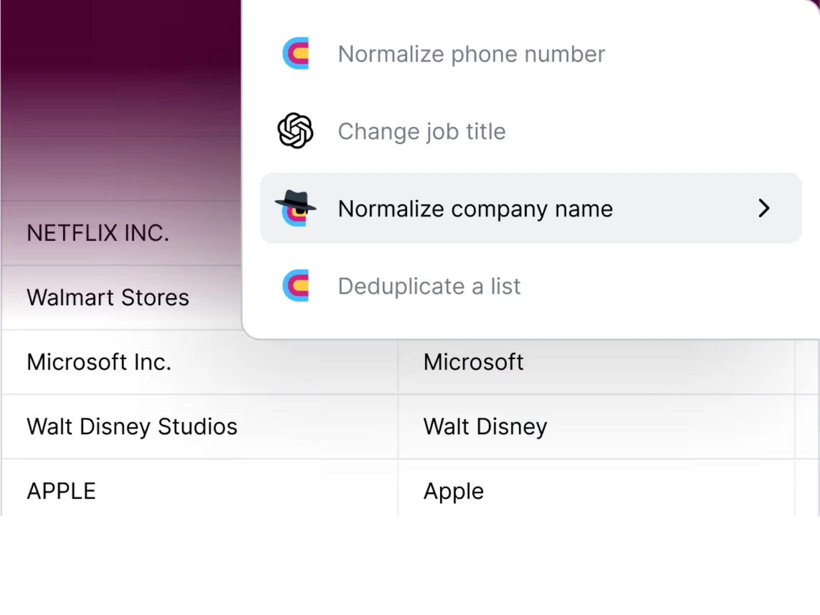 Iuse AI to transform any record into the format you need. Concatenate data, ensure consistent formatting, and remove extra emojis, symbols, or unnecessary info from lists.