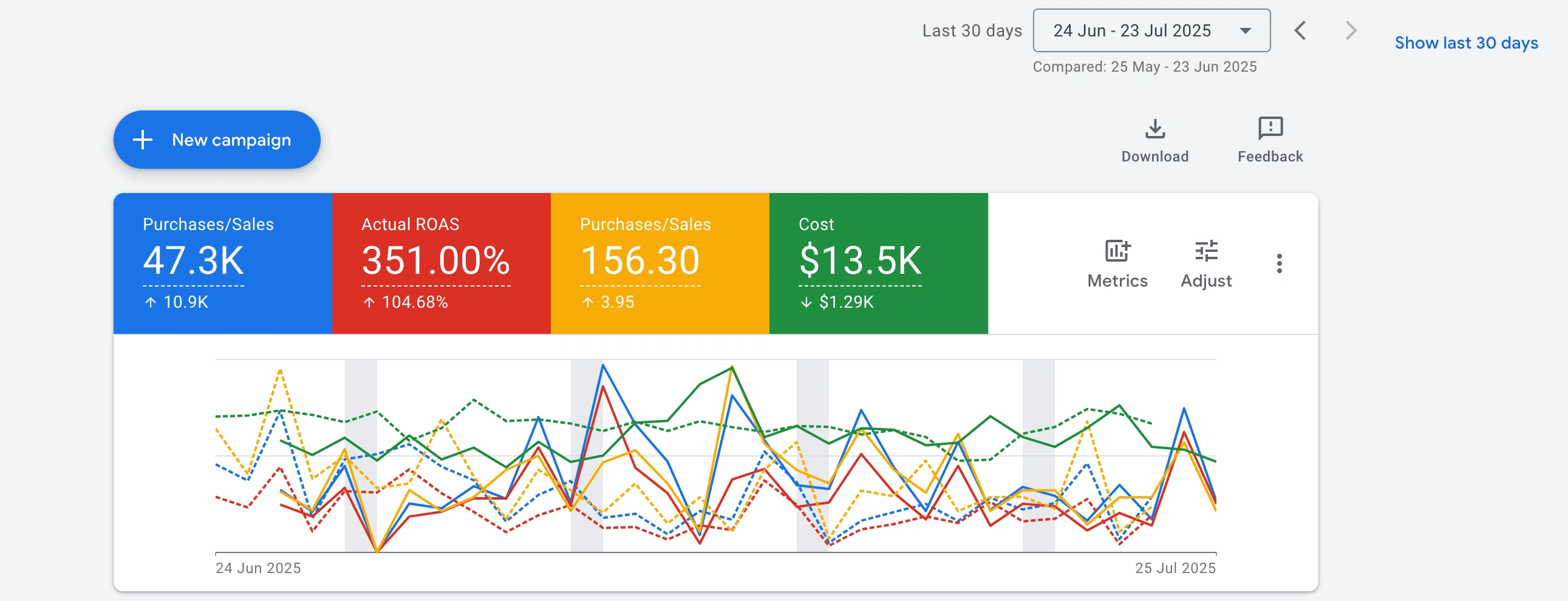 Men’s fashion ecom — last 30 days vs. previous: $47.3K revenue (+$10.9K), ROAS 351% (+104.7 pp), 156 sales (+3.95), while spend dropped to $13.5K (-$1.29K). I restructured into PMax + brand/non-brand search, tightened audiences, added negatives, pushed high-margin SKUs, and refreshed creatives. Result: more sales, lower cost, big ROAS lift.
