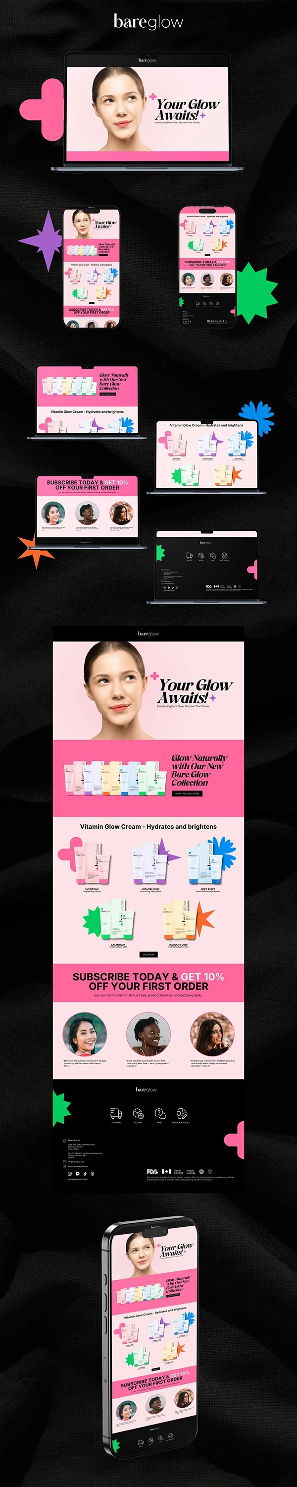 I designed a clean, visually balanced newsletter in line with BareGlow's brand identity. The layout highlighted the products with clear visuals, short descriptions, and strong call-to-action buttons leading directly to their website. Testimonials were included to build trust, while promotional messaging ("10% off your first order") created urgency. My focus was on clarity, elegance, and maintaining brand consistency across every element.