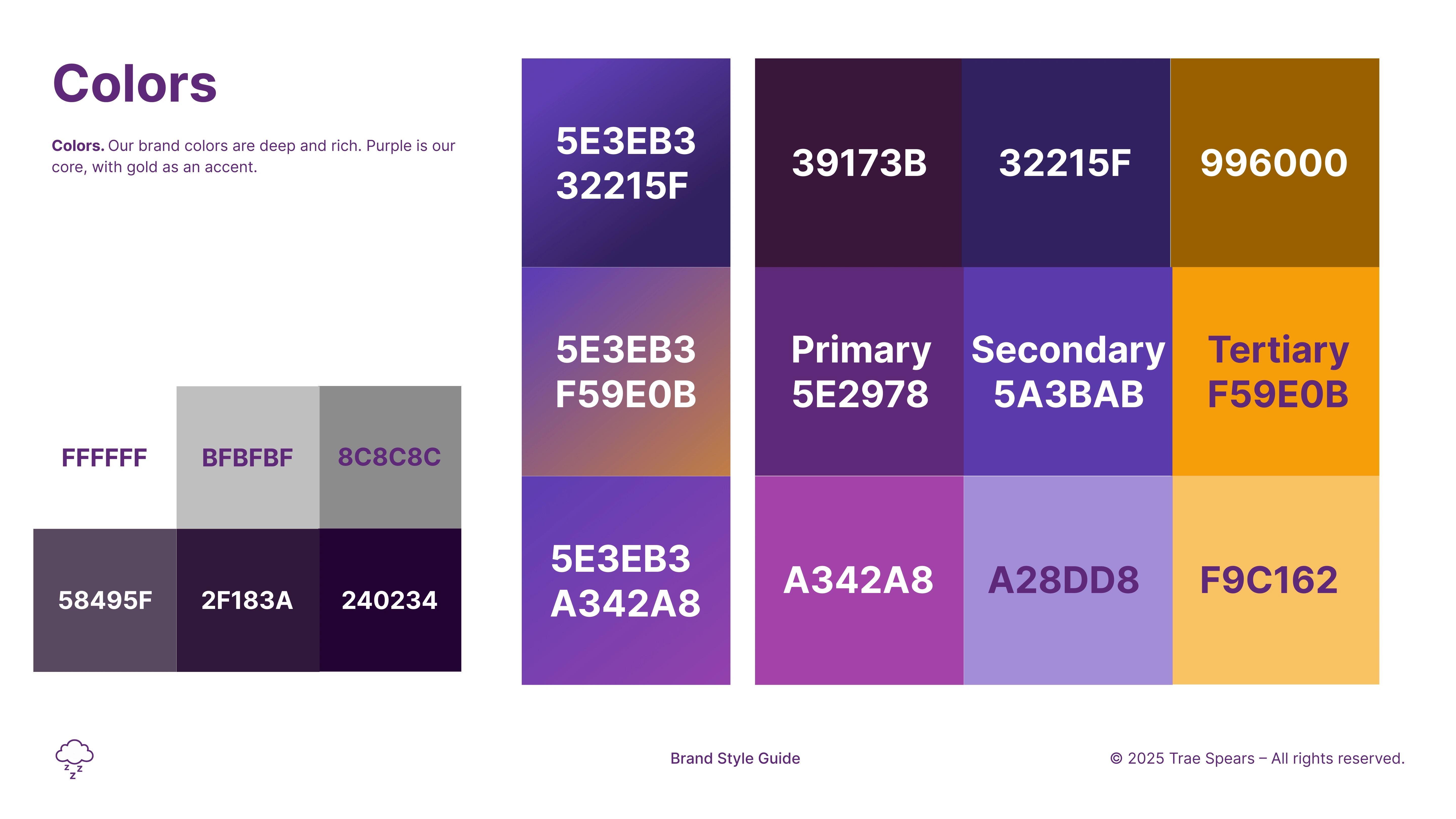 • Primary (#5E2978): The core brand color, representing mystery, luxury, and the night