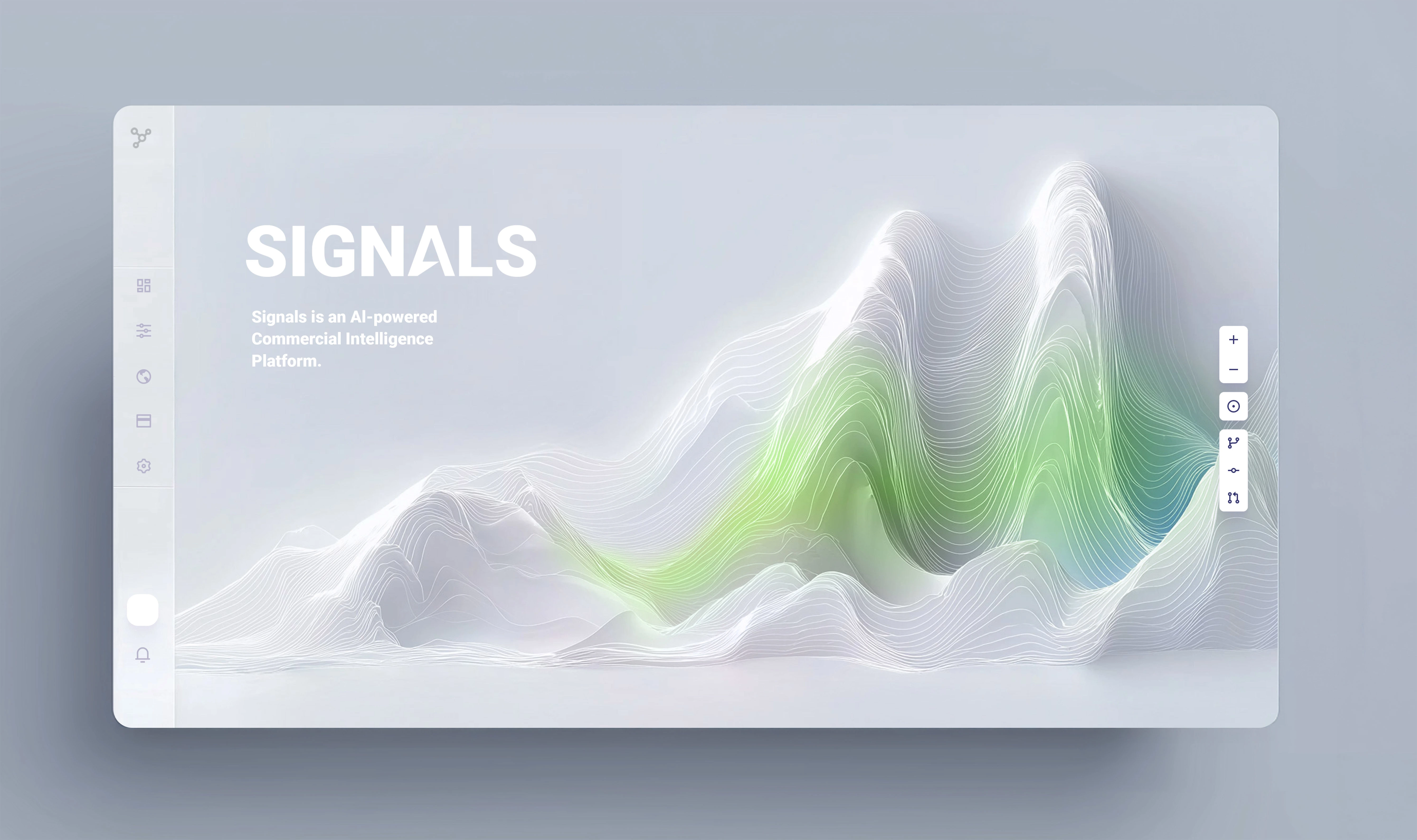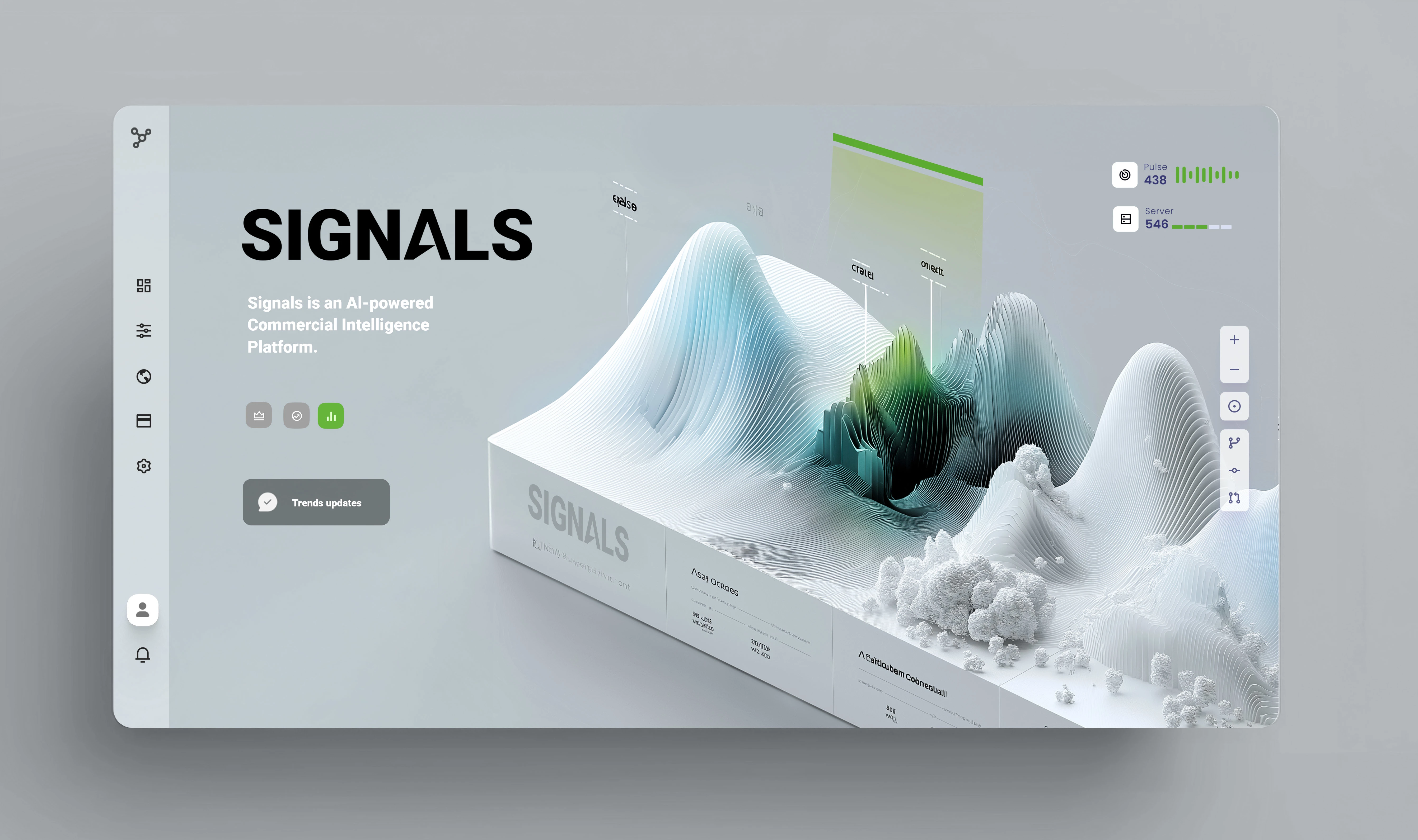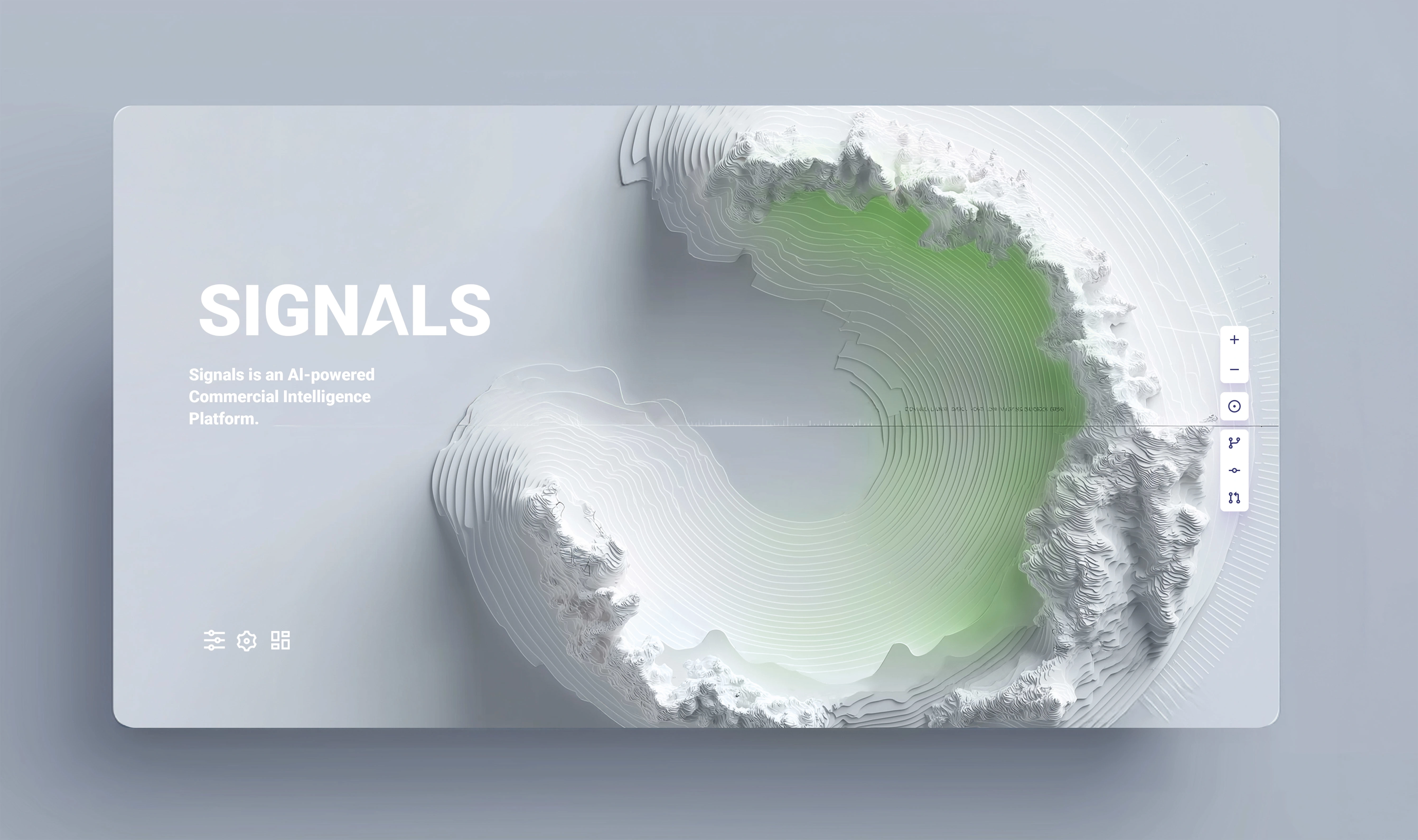 Exploration of how complex signals can be expressed as living terrain. Peaks and clusters represent emerging patterns, while the gradient flow shows how insights move through the system. This direction helped define the platform’s metaphor for clarity and opportunity discovery.