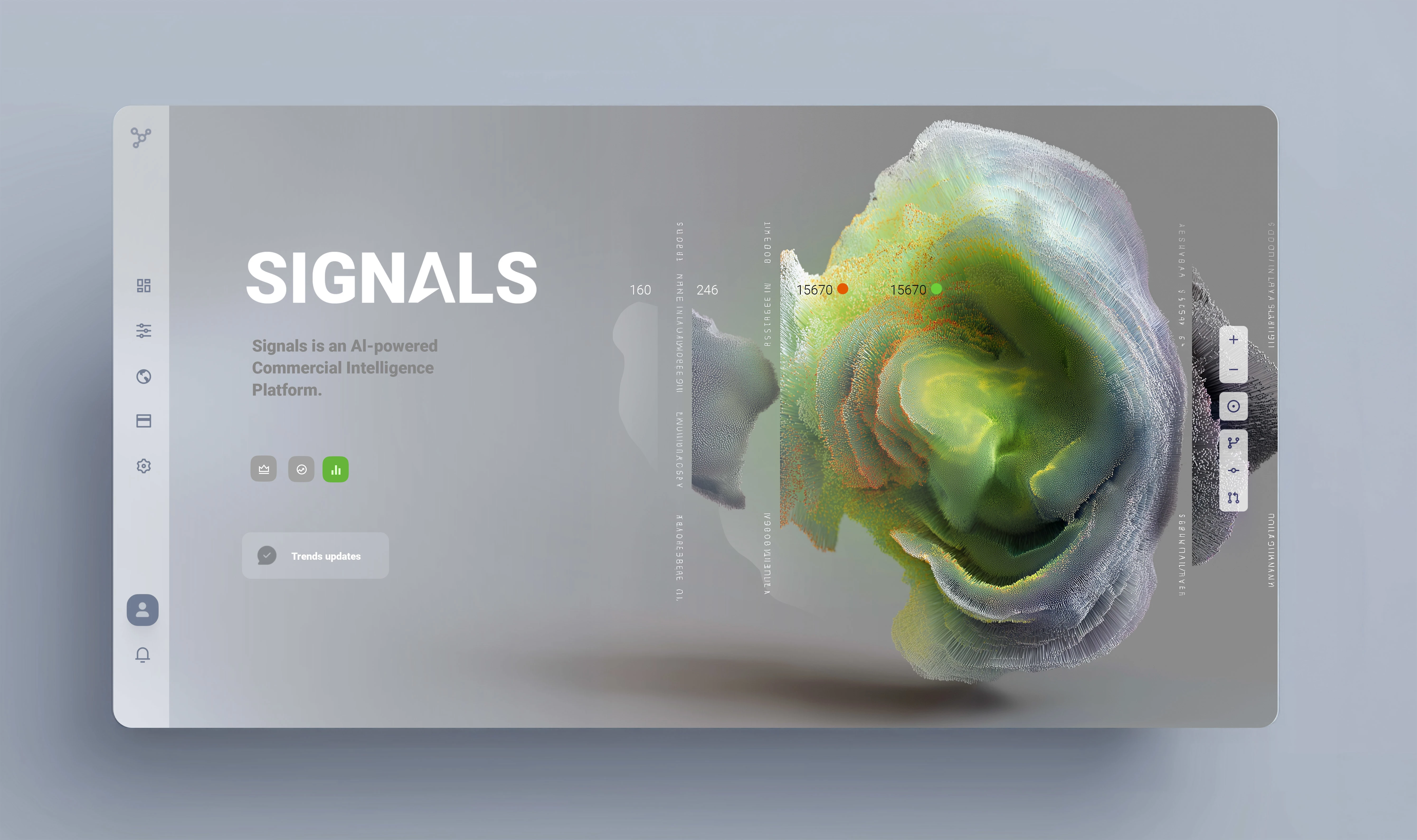 This direction explores how familiar analytical visuals (grids, arcs, markers) can merge with a more fluid insight model, creating clarity without losing the organic feel of emerging opportunities.