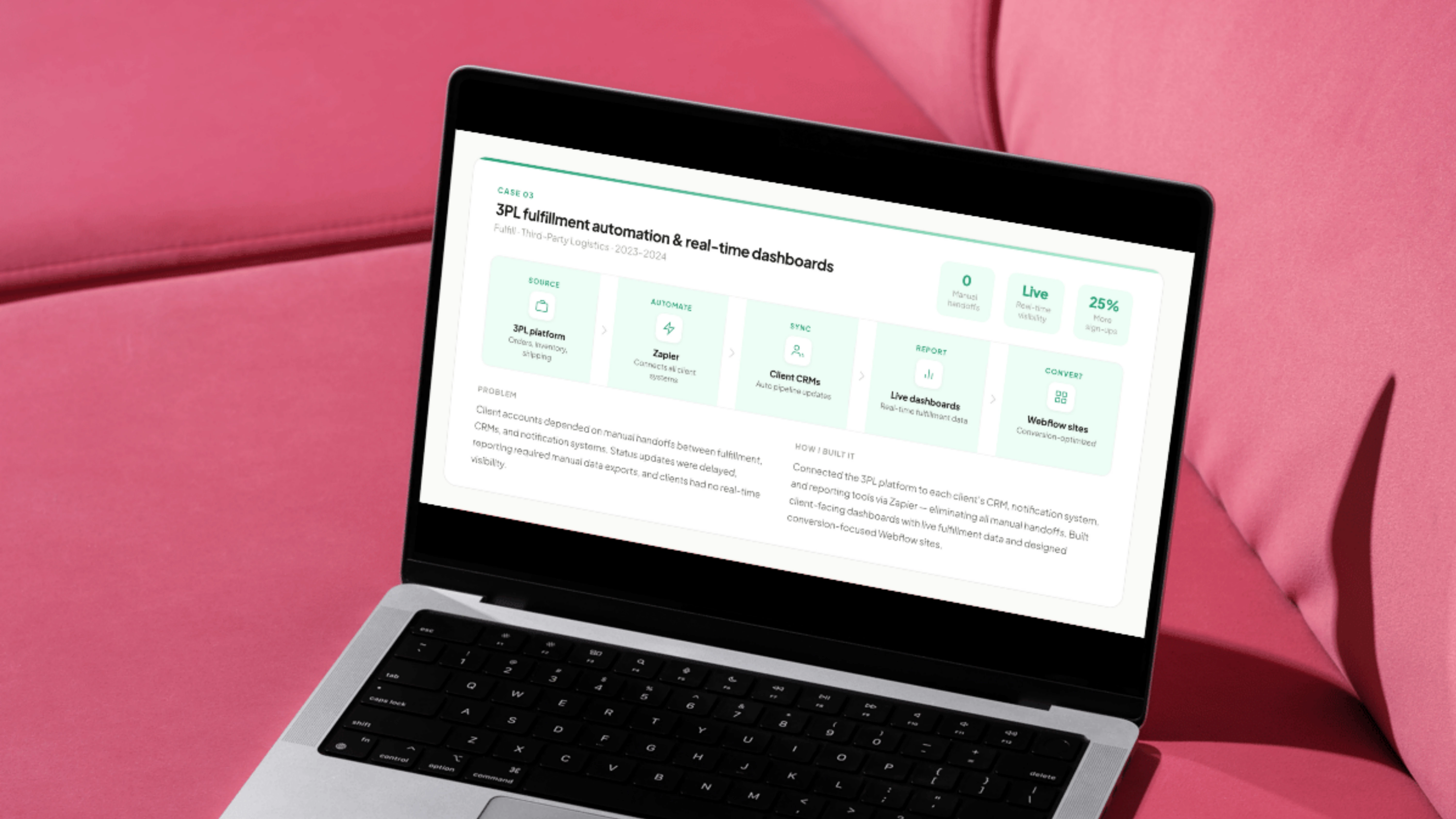 For reporting, I developed client-facing dashboards that pull real-time data directly from the fulfillment platform, giving clients full self-service visibility into their orders, inventory, and shipments without waiting for manual exports. On the conversion side, I designed and built new Webflow sites with clear value messaging, optimized sign-up flows, and custom interactive elements — resulting in a 25% increase in sign-ups and a 20% lift in conversion rates.