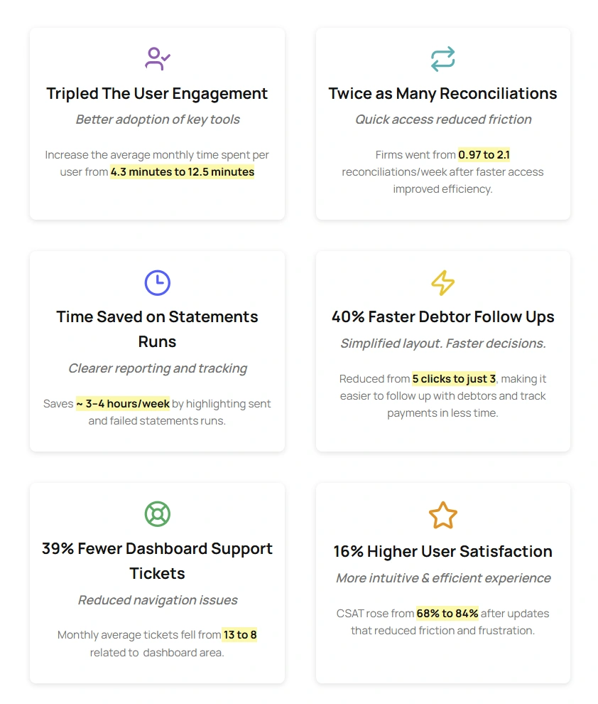 The redesign focused on decluttering the interface, prioritizing essential actions, and aligning navigation with how accountants actually work. The result: reduced task time, fewer dashboard-related support tickets, simplified reporting, and a more focused, efficient experience for every user.