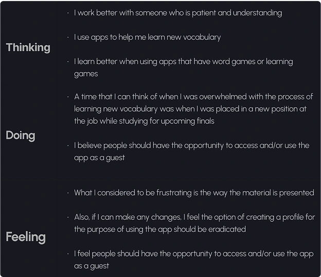 In retrospect, I determined that the main purpose of the project was to comprehend the common techniques, methods, and practices associated with the user experience. In addition, I learned that importance of remaining attentive to the needs, wants, and pain points of the users. The main reason is because the users are your target market. Being that designers are not creating the project for their own specific interest, designing should always focus on addressing the needs of the users for the sole purpose of enhancing the overall user experience. Most importantly, I learned that in order to remain focused on the users, the usability test is a powerful tool to implement to comprehend demands of your target market. Above all, though there is still a lot to be done to convert the app into a complete project, it is important to note that the main purpose behind the development of the project was never reaching a completed product. The overall goal was to learn and adopt the most common techniques and practices of user experience design.